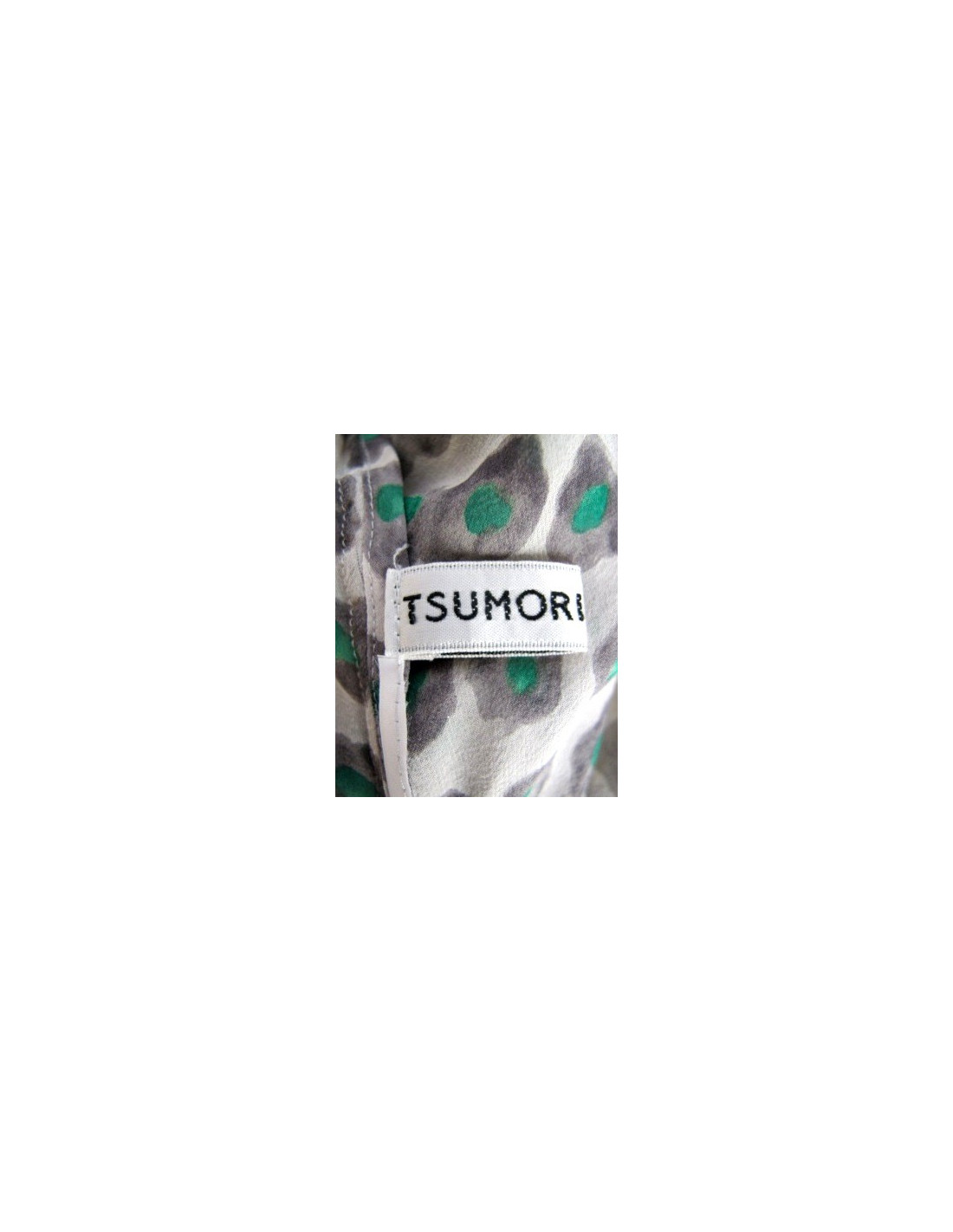 Charmante! Robe Tsumori Chisato en soie, mi-longue, bas asymétrique plus courte au dos, imprimé effet "main" de fleurs grises et de noeuds jaunes, le tout assorti au centre d'un magnifique nœud jaune en sequins. Col rond, manches courtes de couleur vert uni. Élastique au dos de la robe. Taille 38 fr voir 40 fr. 100% soie.