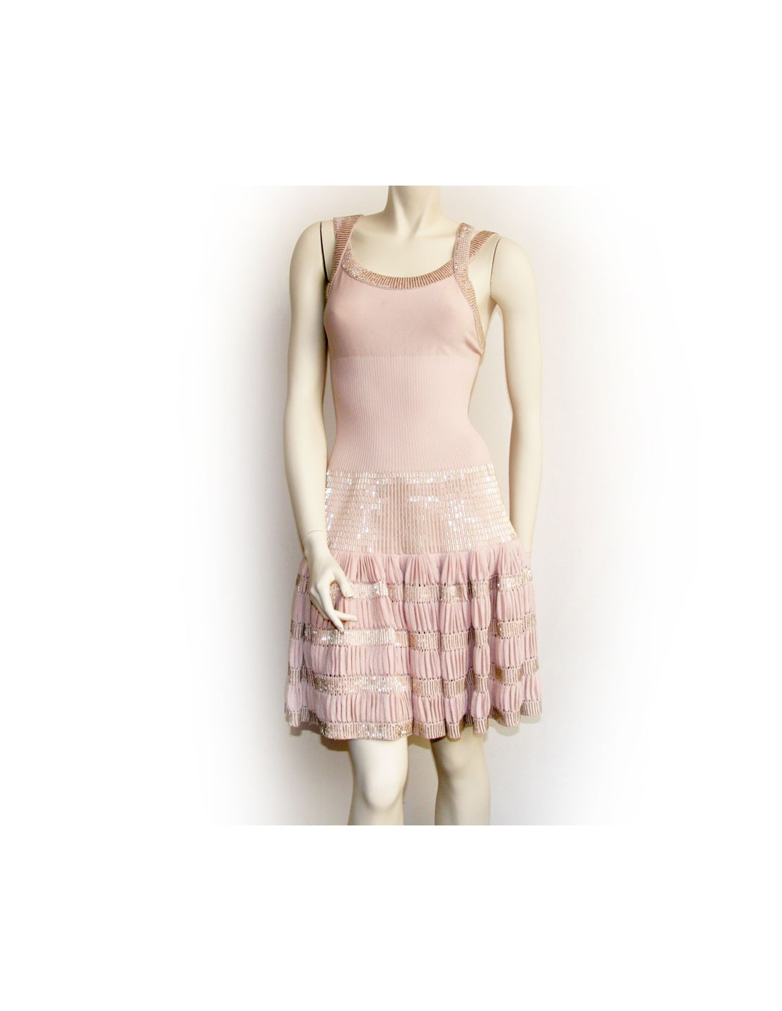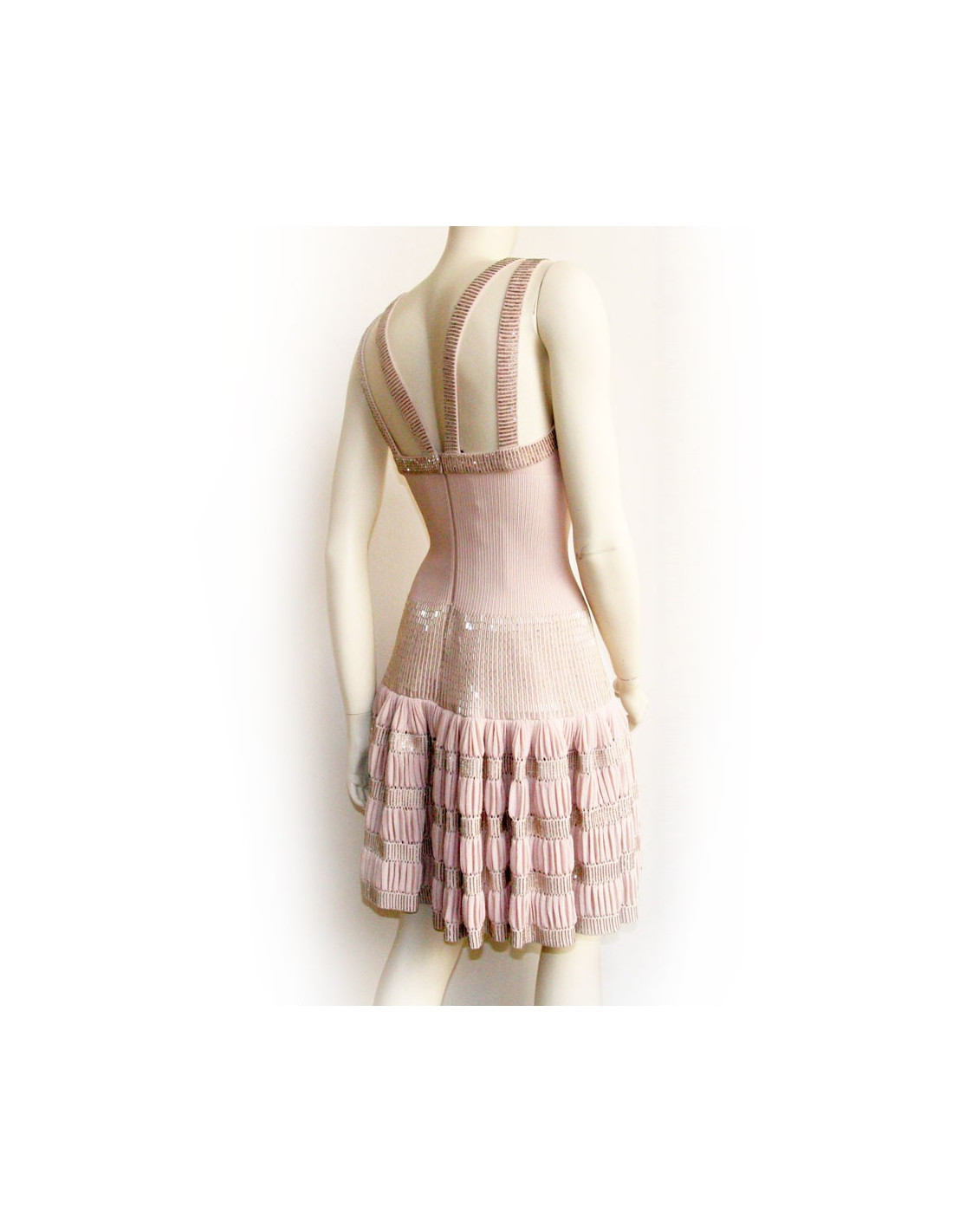 Mythique robe Alaïa rose poudré T40. Epouse la forme du corps jusqu'à la taille et se plisse jusqu'aux genoux avec des bandes brodées de petites baguettes argentées.