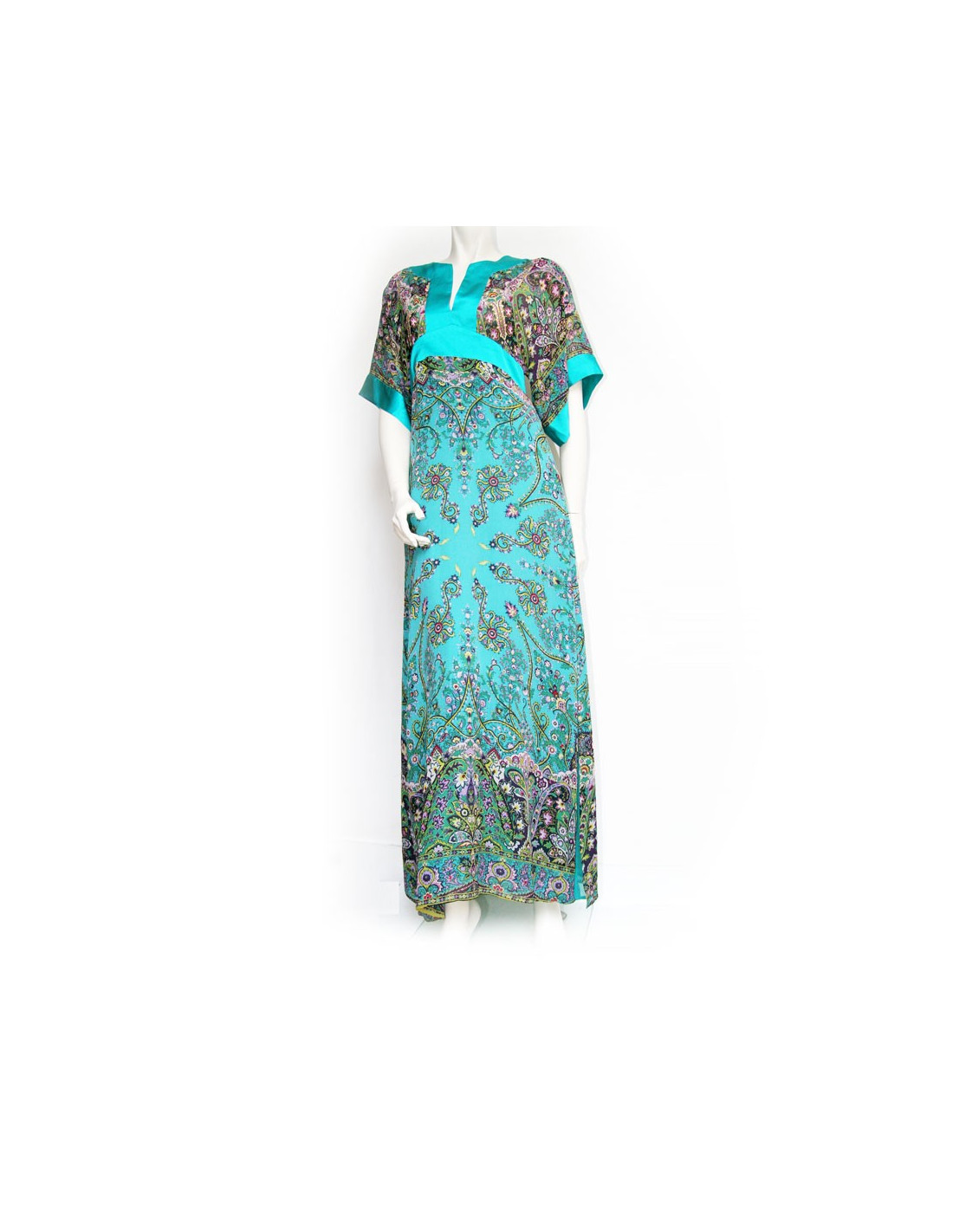 Robe longue verte ETRO T40 avec des imprimés façon foulard. Des imprimés floraux multicolore. Elle a des bandes de satin au niveau de la taille, des manches et du col. Elle est également fendue de chaque coté, du genou jusqu'en bas. Se ferme dans le dos grace a un zip. En très bon état.