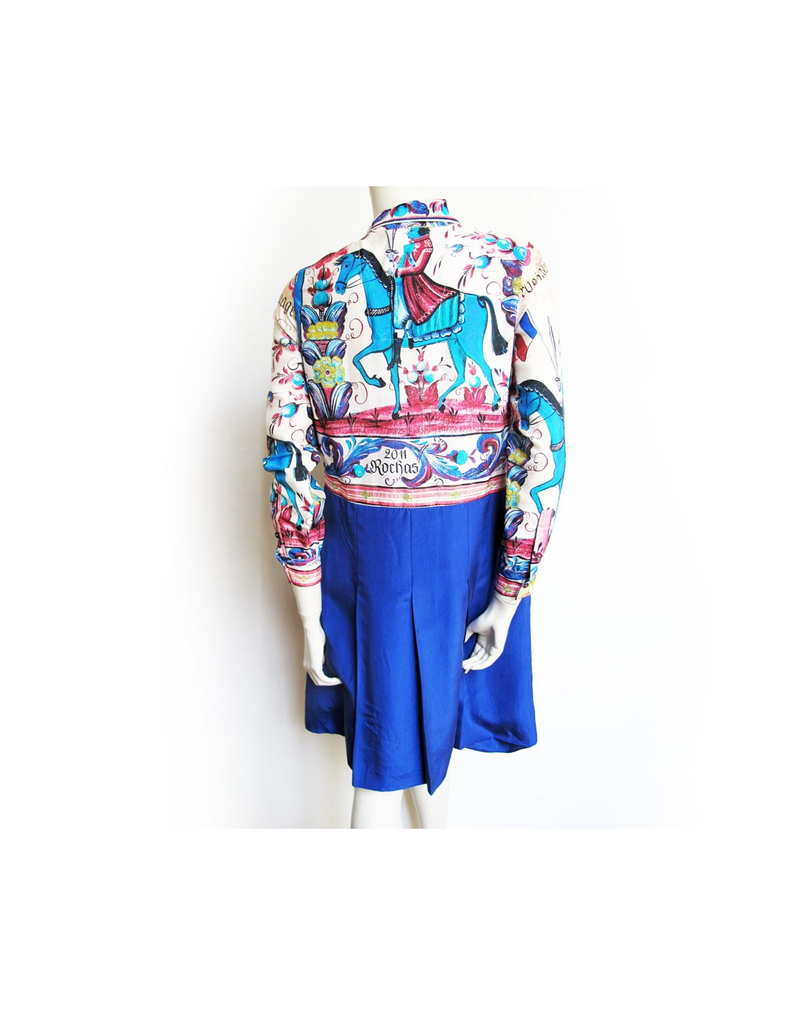 Sur le chemisier, des impressions comme sur un tableau de fleurs, un cheval, drapeau, ... Le reste de la robe à partir de la taille est violet avec deux de chaque côté. Elle est également plissée.
