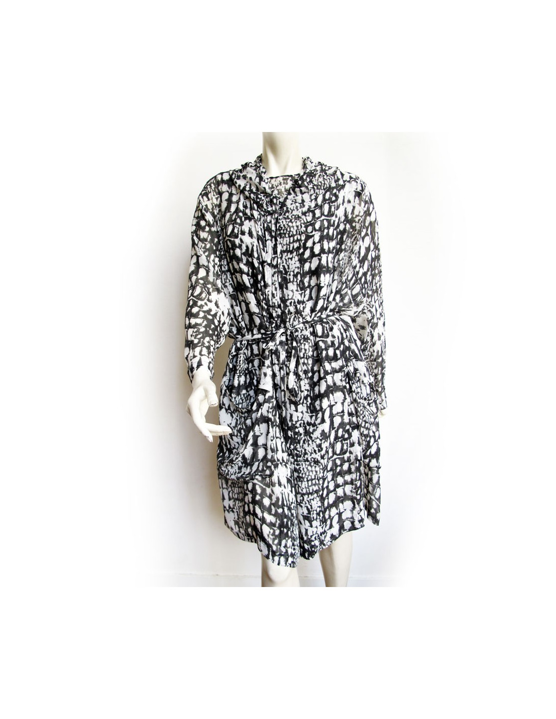 Top/débardeur en soie transparent avec une robe très fluide et ample. Elle a une capuche ainsi qu'une ceinture dans la même matière et la taille se ferme à l'aide de pression. Elle a également une grande poche de chaque coté. En très bon état.