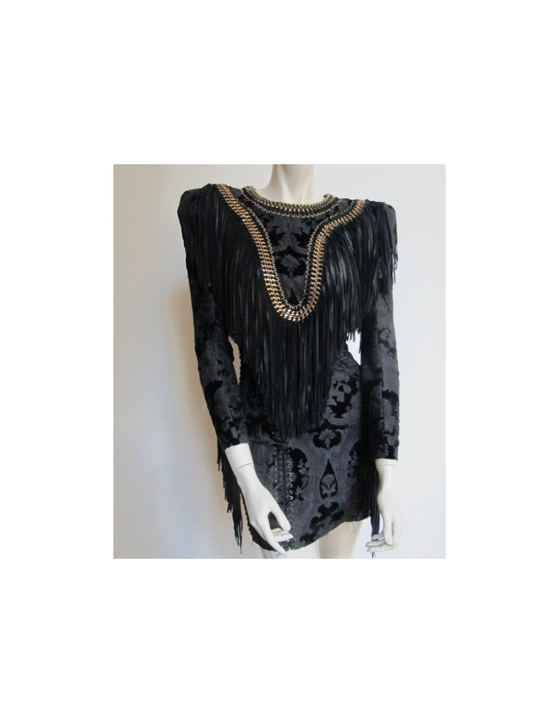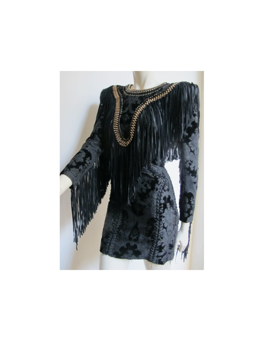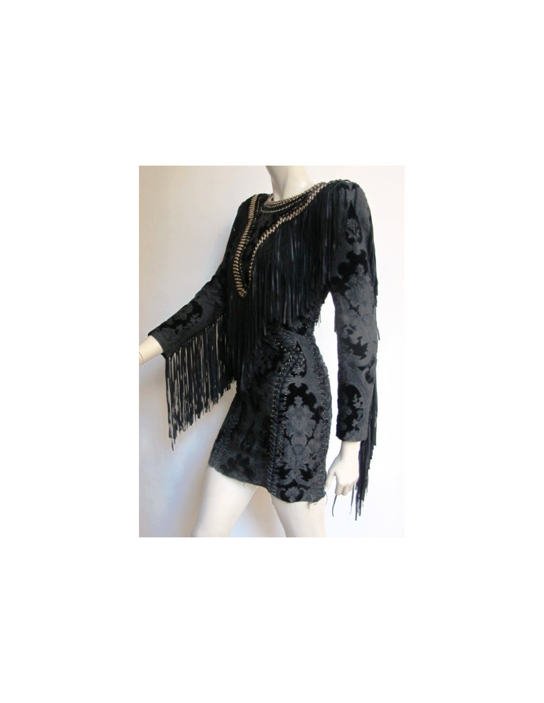 Robe BALMAIN en velours damassé noir découpé entrelacé, chaines or et franges en daim noir, ourlet coupé bord franc.
