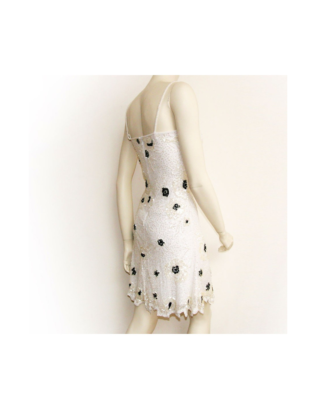 Robe blanche brodée de sequins de couleur noire et blanche en forme de fleurs.