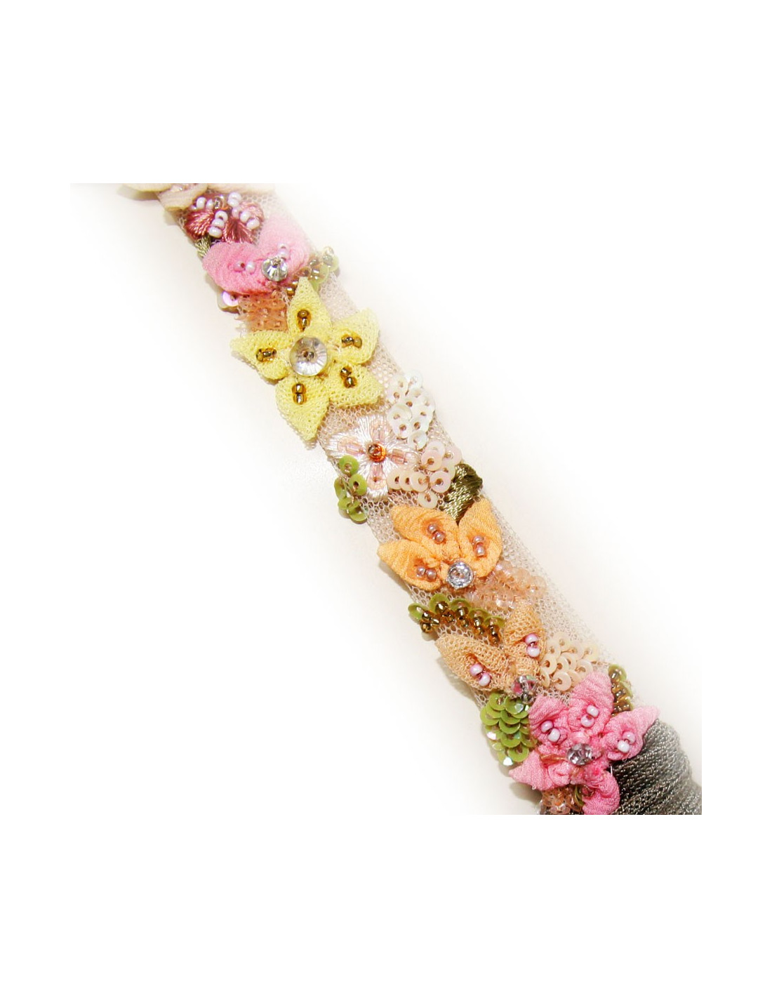 A la taille et sur les bretelles, broderies de fleurs en dentelle.
