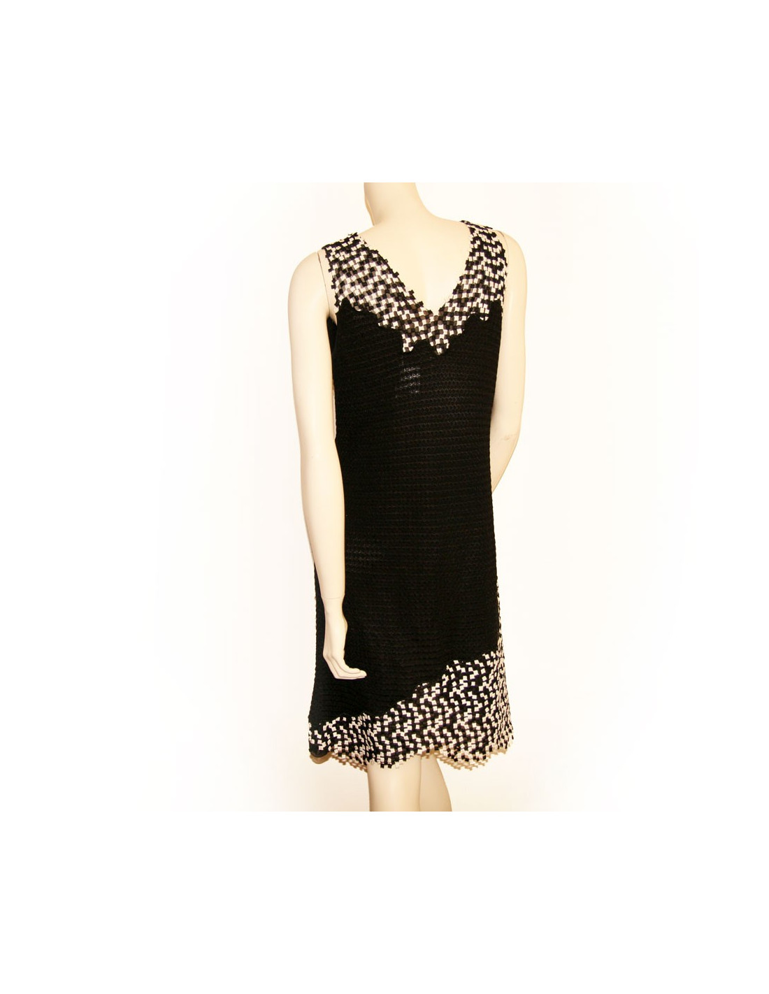 Le haut et le bas de la robe sont avec des petits carrés de couleur blanche et noire cousus les uns aux autres. En dessous, on voit apparaitre un tissu de soir noir transparent. En très bon état