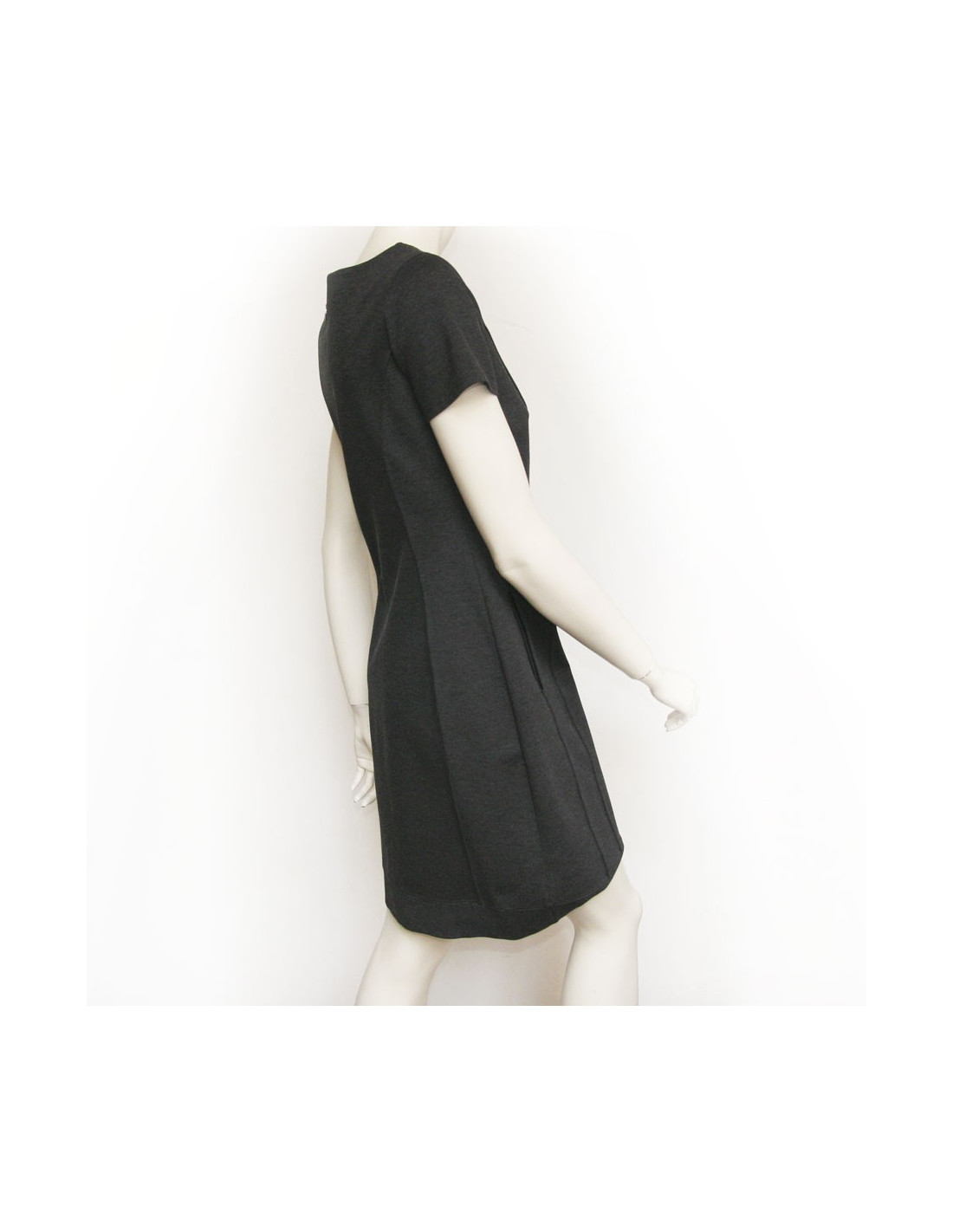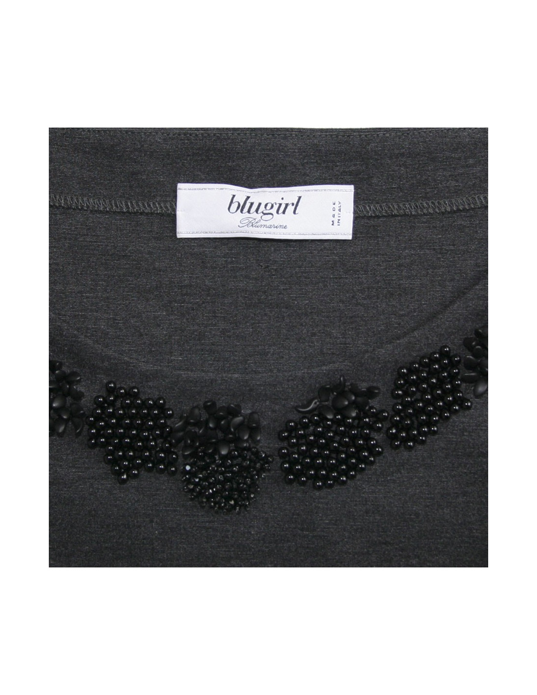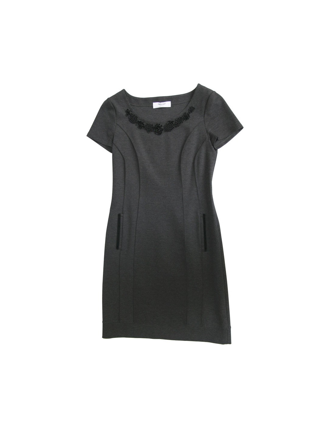 Robe grise stretch Blugirl de Bluemarine T38. Elle se porte près du corps. Col rond. Effet collier au niveau du col avec perles noires brodées. Deux poches avec un liseret en velours noir. En très bon état.