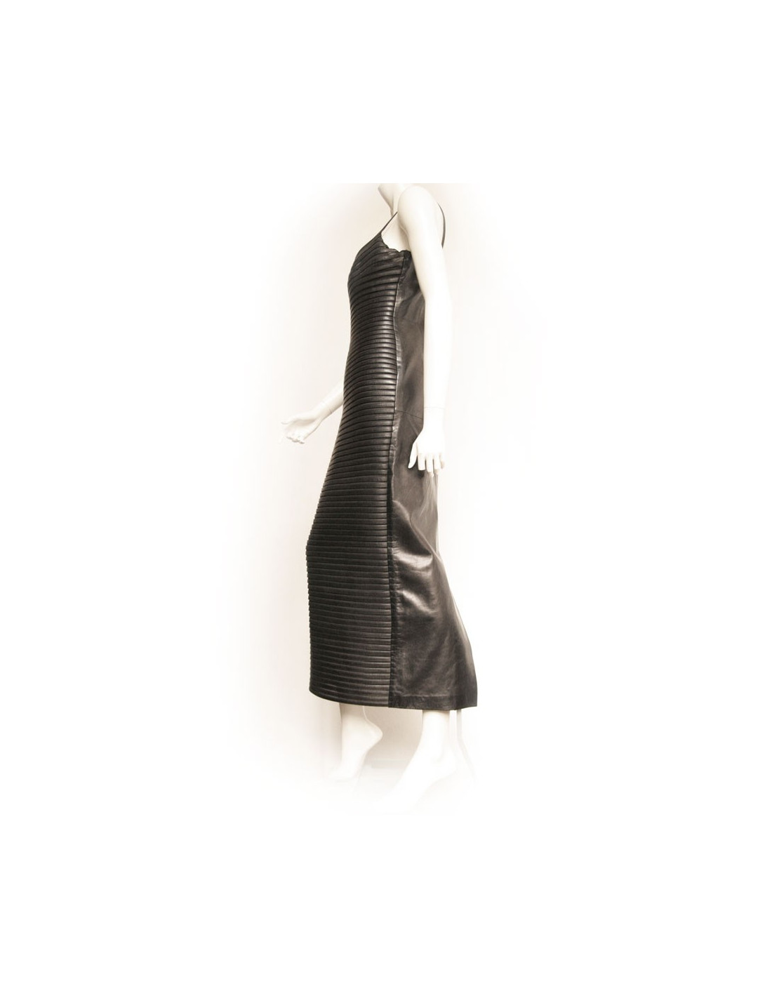 Robe longue Jean-Claude Jitrois en cuir d'agneau noir. Elle se porte très près du corps. Fines bretelles. Ornée de fines bandes de cuir à l'avant et à l'arrière uni de cuir noir avec une fente en bas de la robe. Pas d'étiquette de taille. En très bon état.