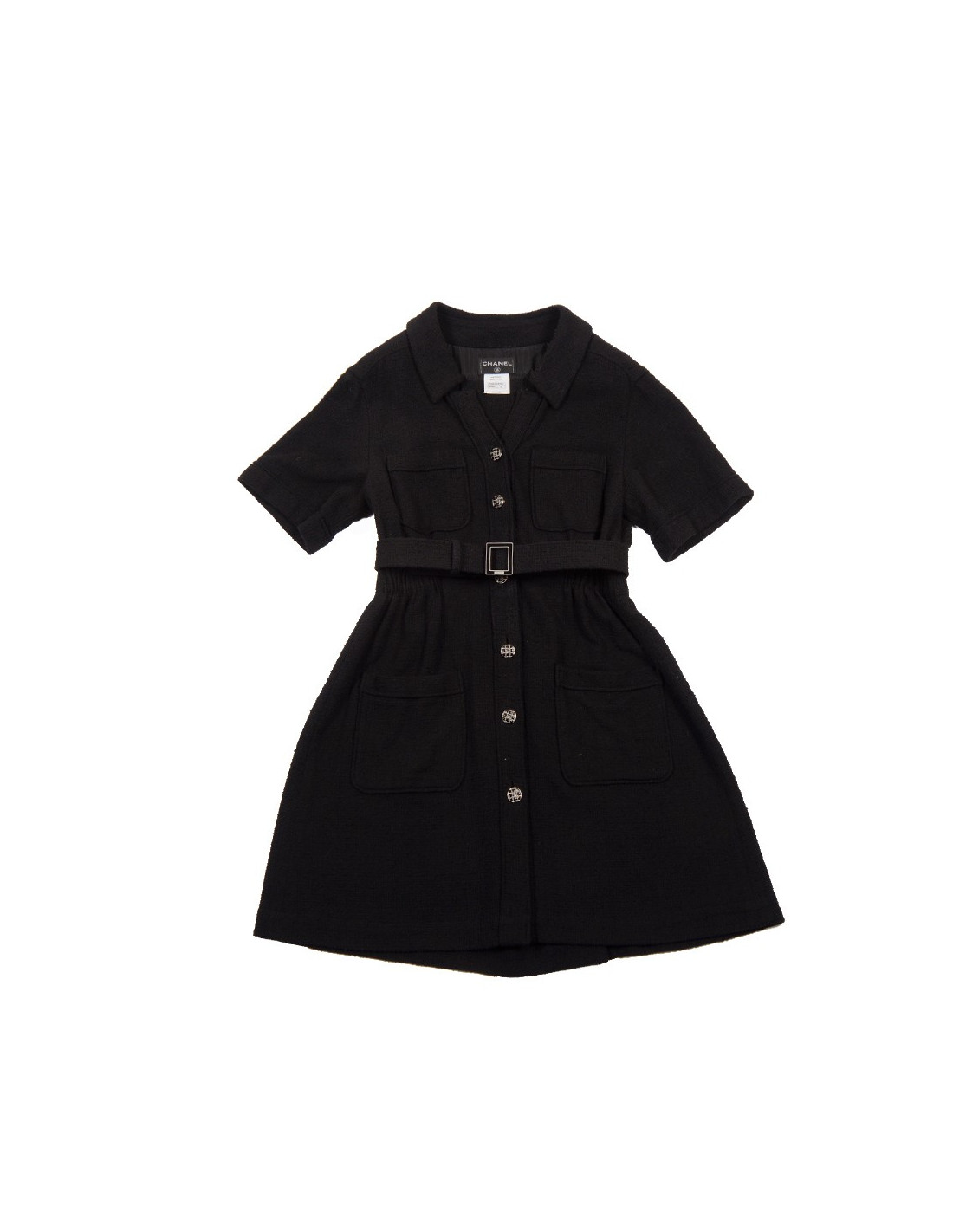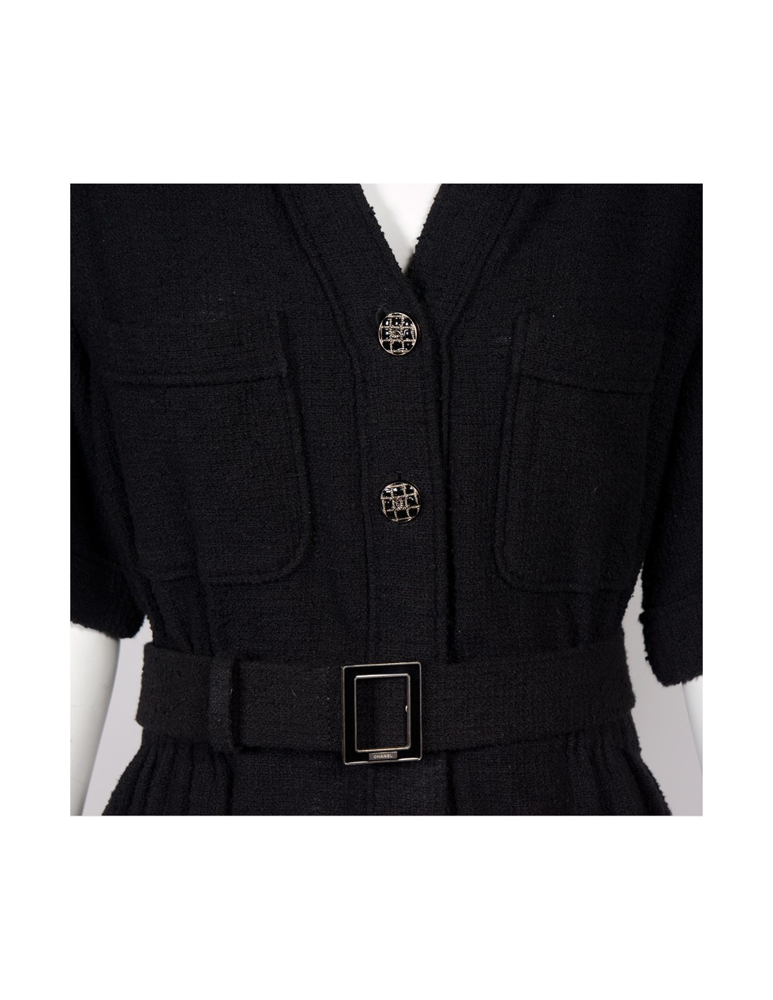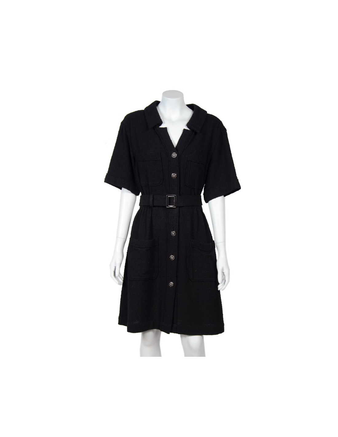 Superbe robe "Paris-Singapour" d'un grand classicisme , taille 42 Chanel en tweed noir. Elle a des manches courtes, deux poches sur la poitrine, une taille resserrée par un gros élastique et deux autres grandes poches. Elle se ferme de haut en bas par des boutons argentés grillagés avec un double "C" au centre. Afin de marquer davantage la taille il y a une ceinture doublée de cuir noir avec une boucle rectangulaire émaillée noire.