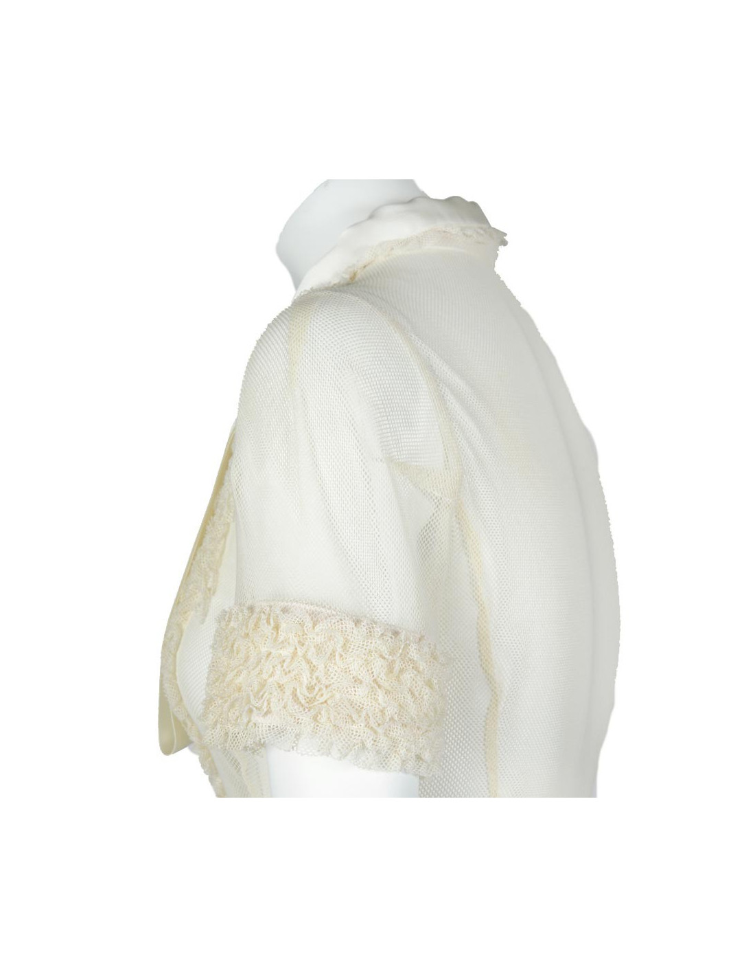 Robe Red Valentino, T42 italien (équivaut à un 38 français), haut chemisier façon dentelle à jabot, manches courtes avec une bande dentelle reprenant les motif du jabot. Un gros grain en satin écru.
