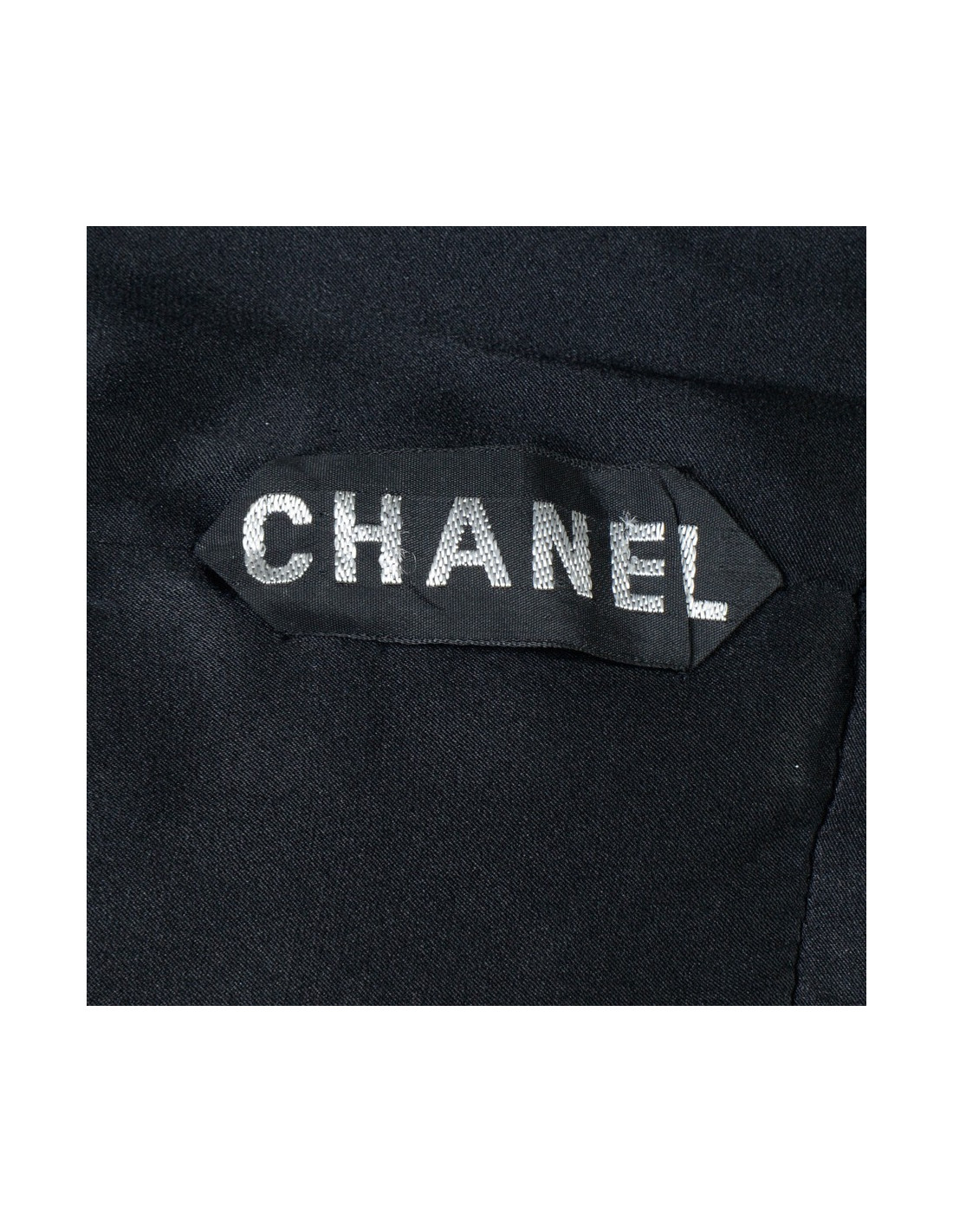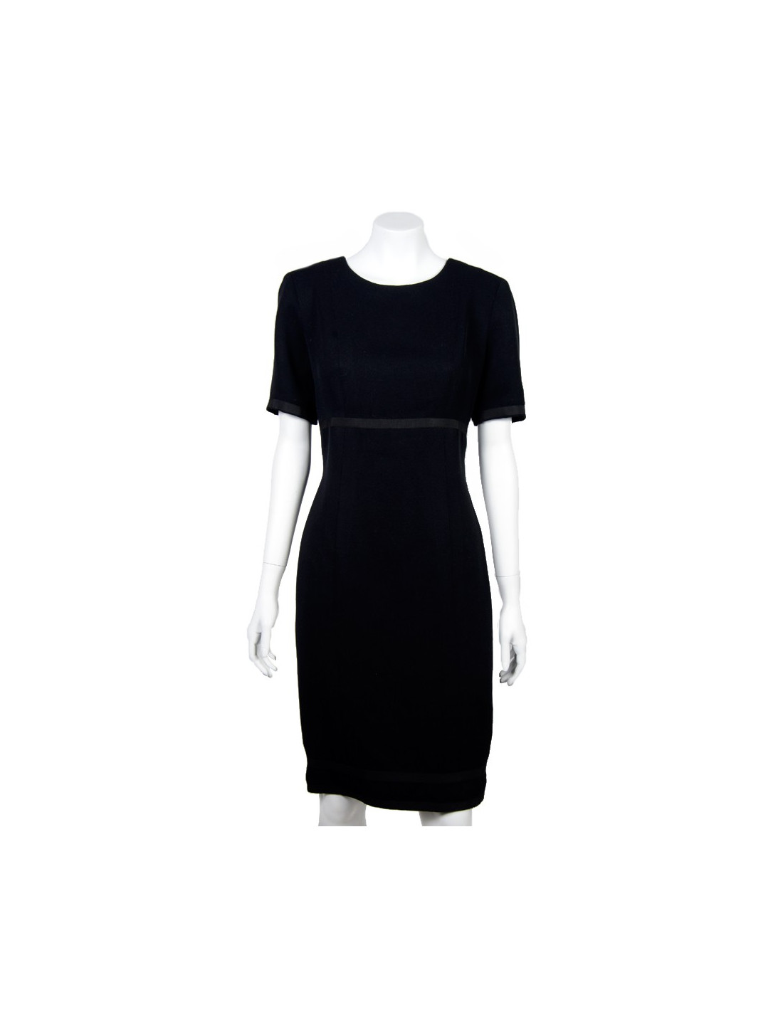 Magnifique robe de cocktail noire Chanel haute couture en piqué de soie, la robe se ferme dans le dos par une fermeture zippée. La robe est définie par un ruban noir à la poitrine, un ruban en bas de chaque manche et deux rubans noirs en bas de la robe. Pas d'étiquette de taille, équivaut à un 38. Très bon état.