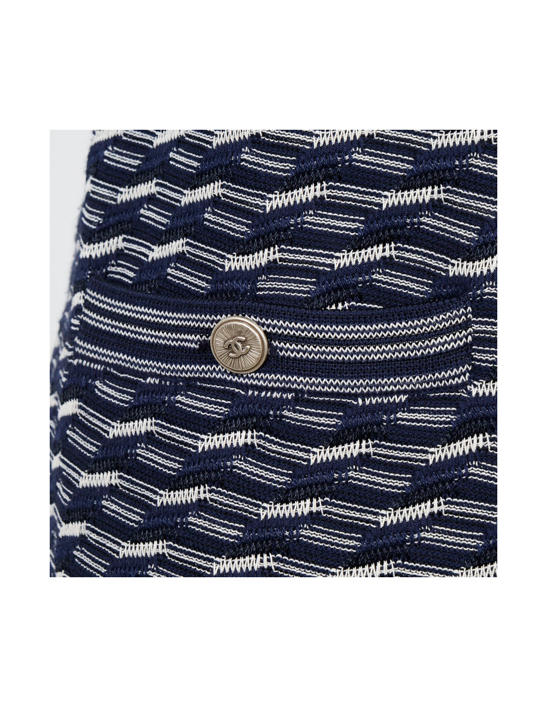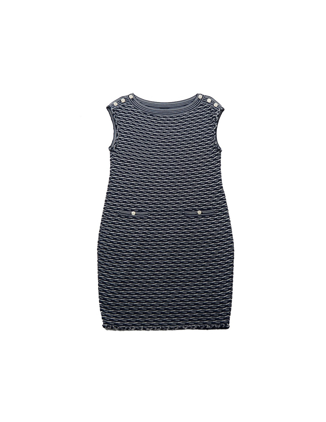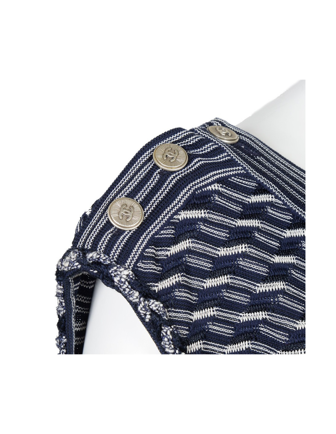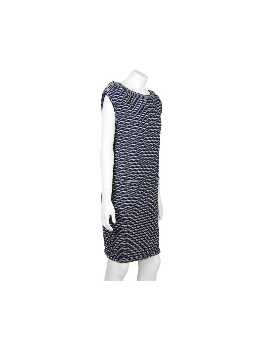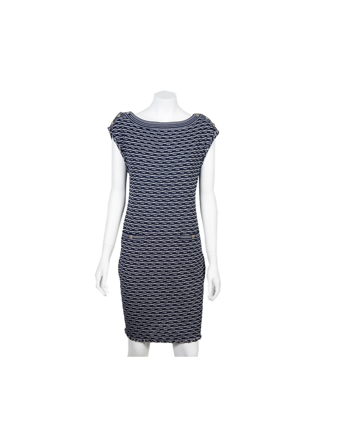 Robe Chanel T 40 de couleur bleu marine et blanche, en viscose stretch. Collection récente. Composée de deux fausses poches au bas de la robe et trois boutons sur chaque épaule. La robe se porte assez prés du corps, elle épouse parfaitement les formes. En très bon état.
