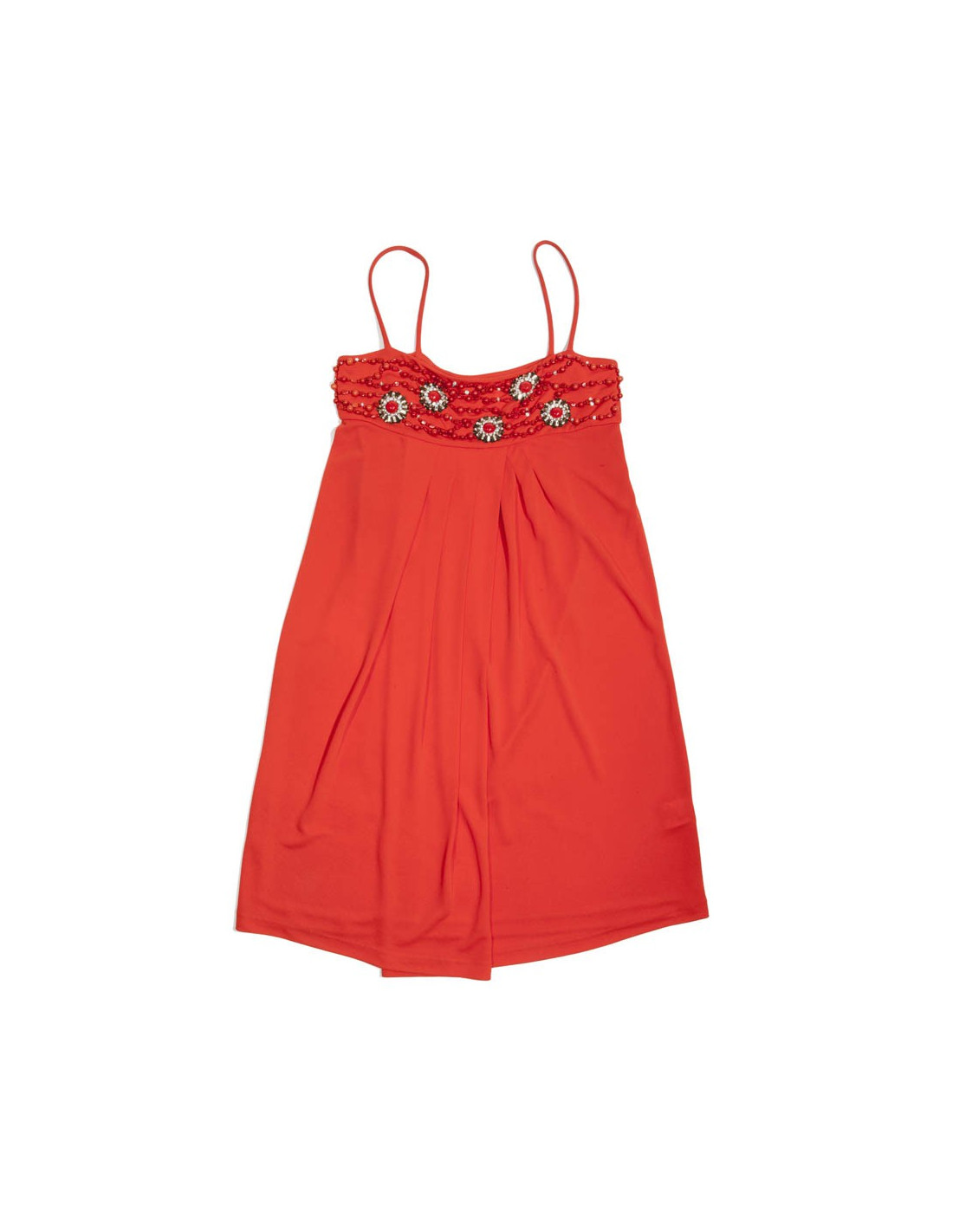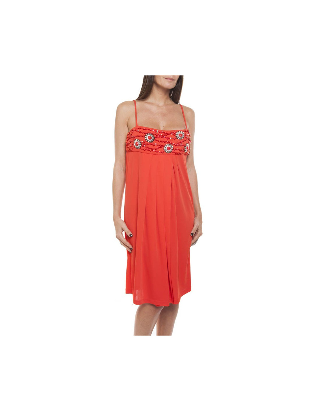 Robe d'été Valentino en jersey couleur corail brodée sur la poitrine des perles façon corail et des cristaux de Swarovski.