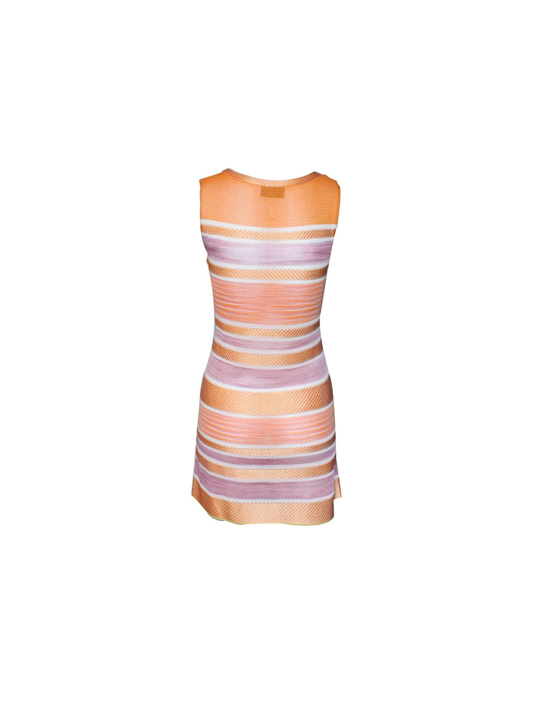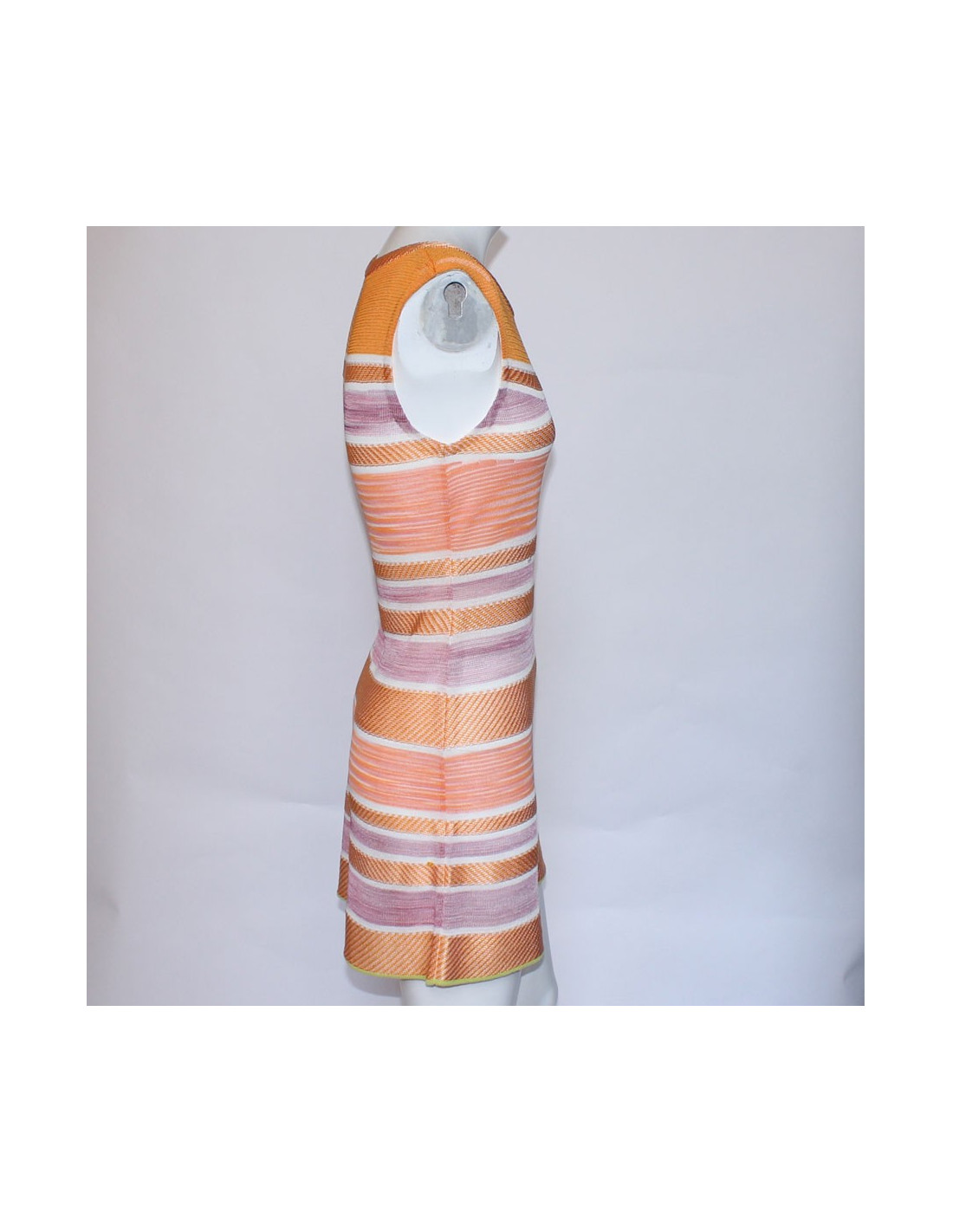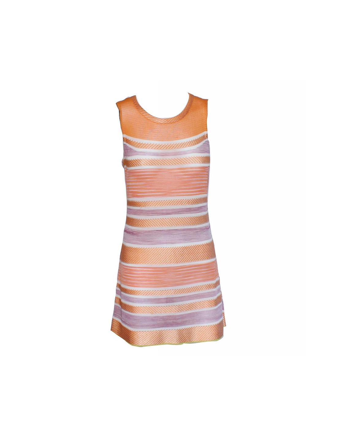 Robe d'Été Missoni (sans étiquette de taille et matière) manches américaines, dans les tons orange, mauve, blanc et borée d'un vert anis. Correspond à une taille 40
