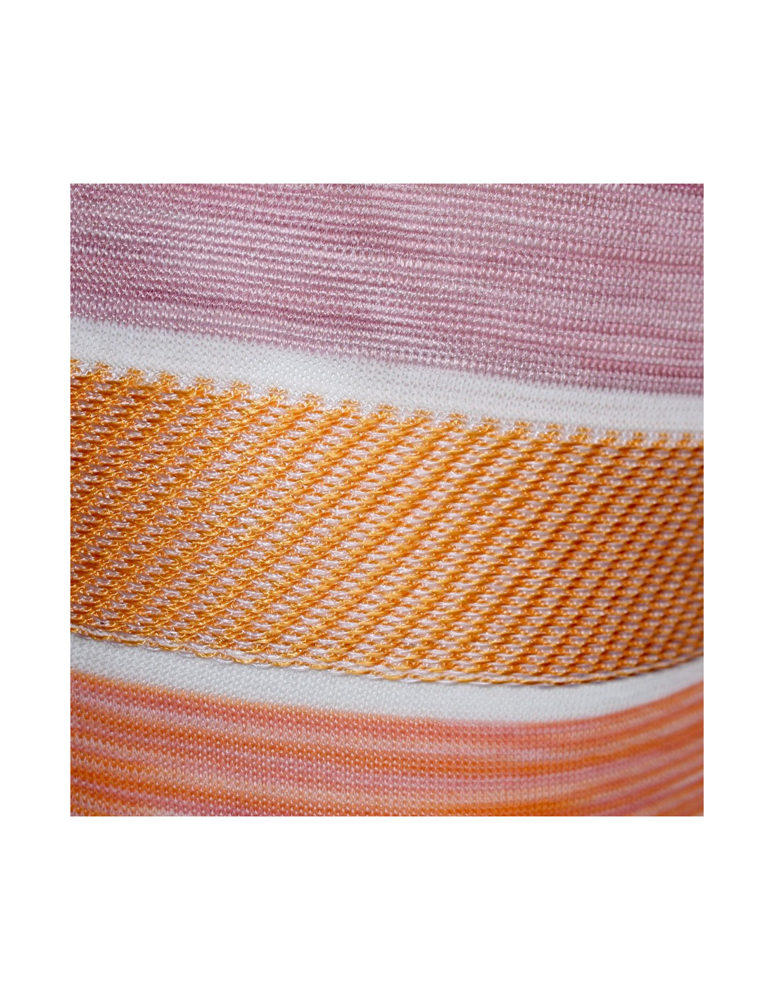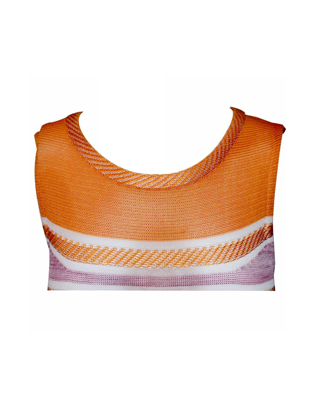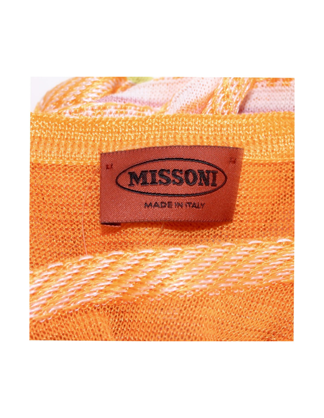 Robe d'Été Missoni (sans étiquette de taille et matière) manches américaines, dans les tons orange, mauve, blanc et borée d'un vert anis. Correspond à une taille 40