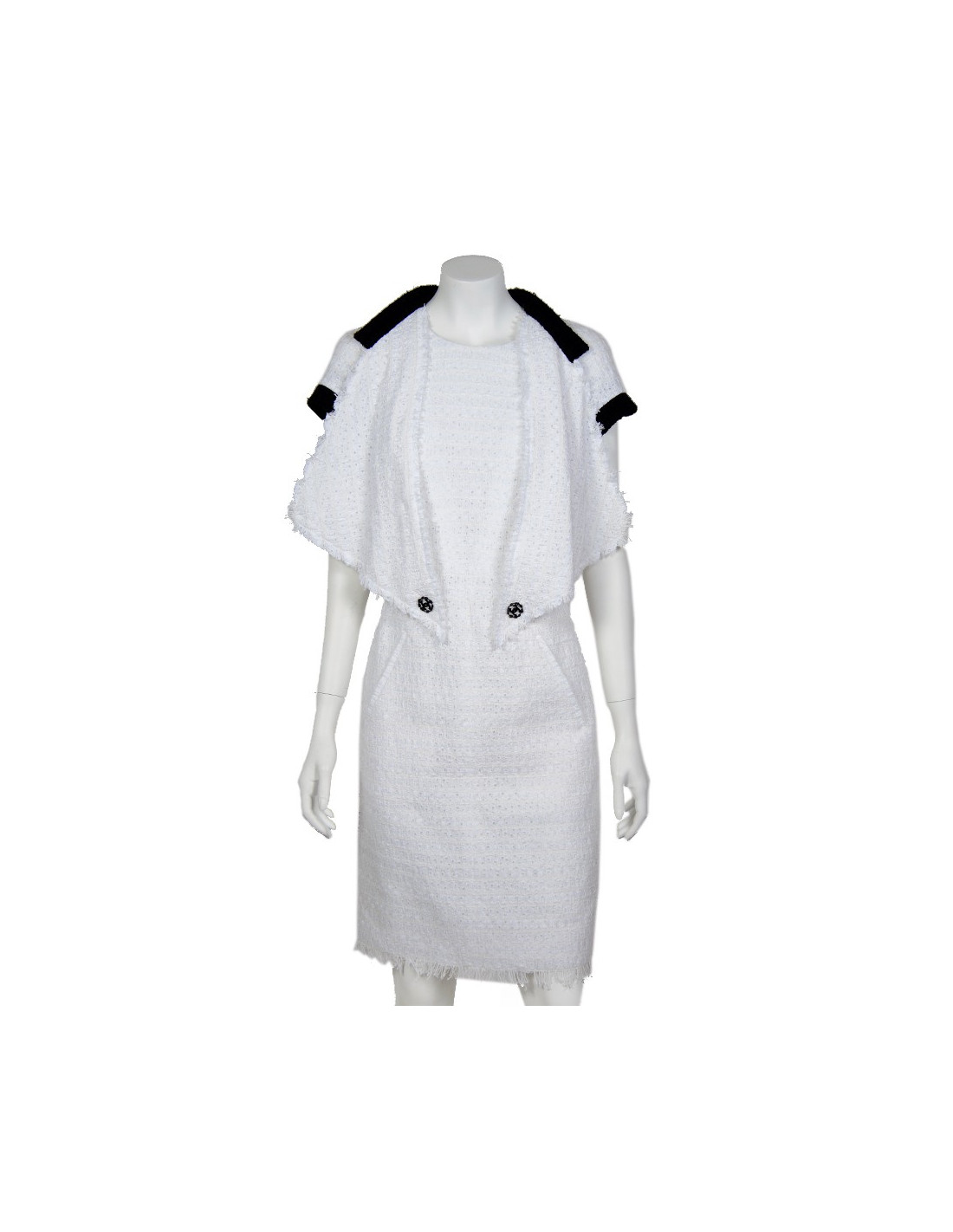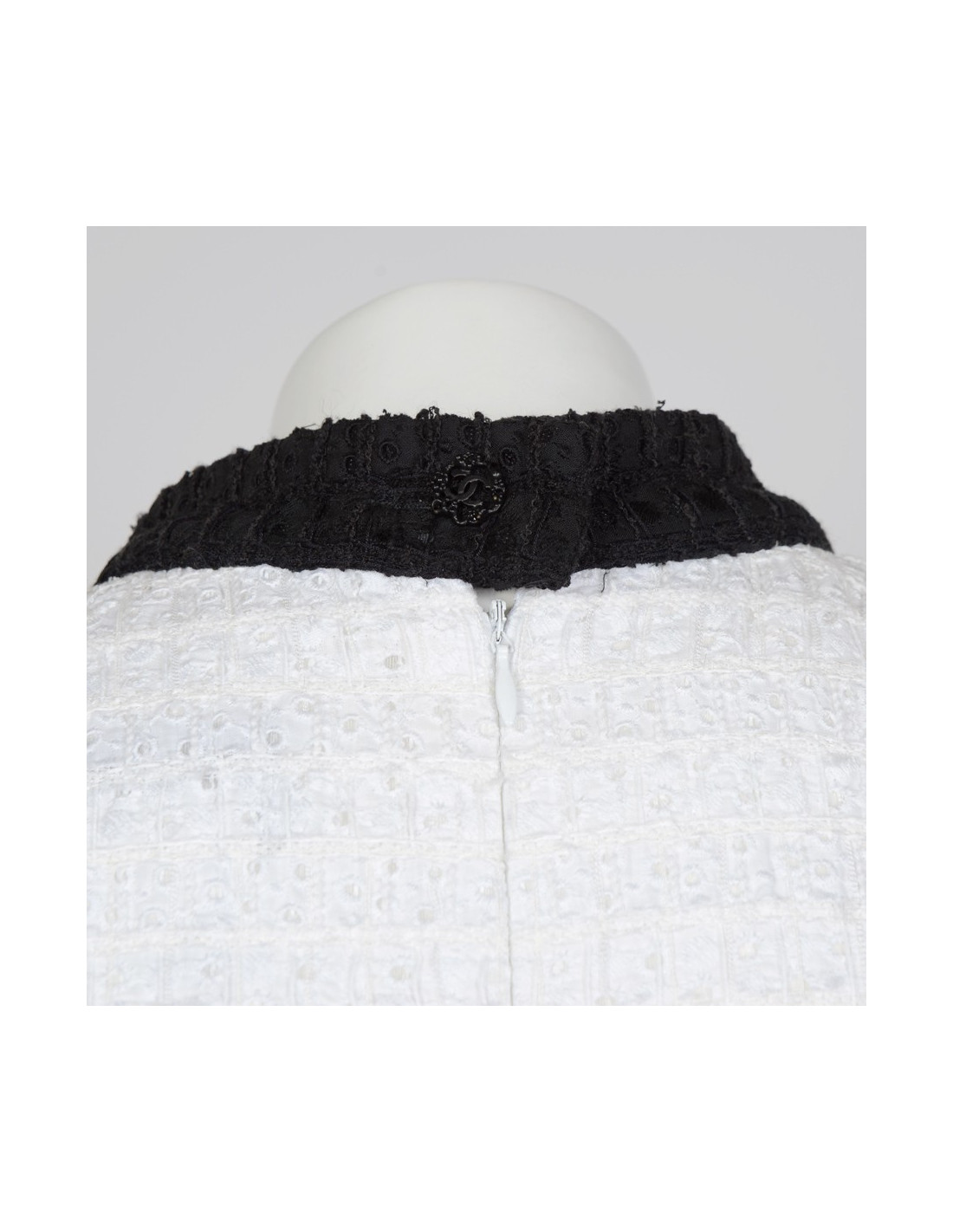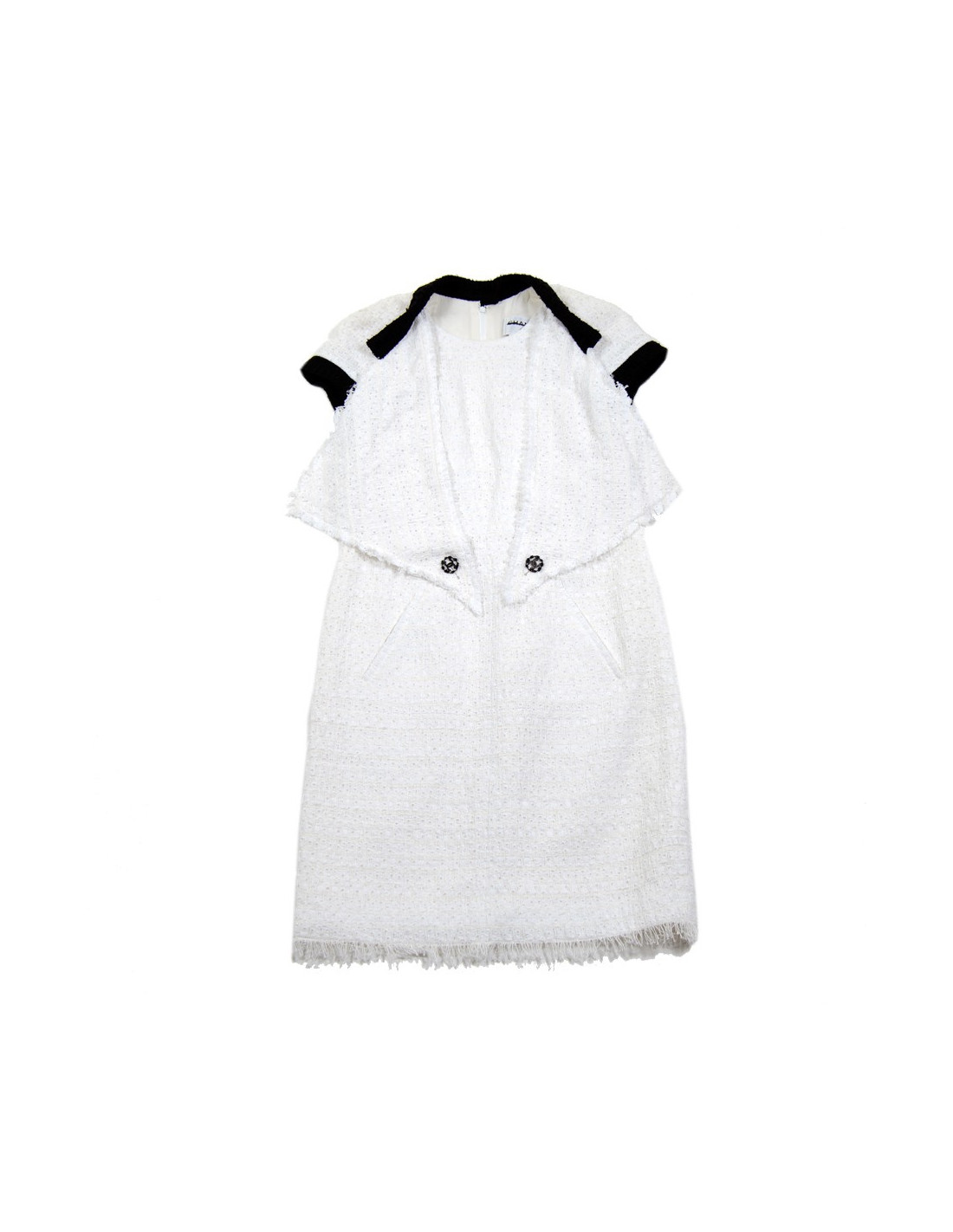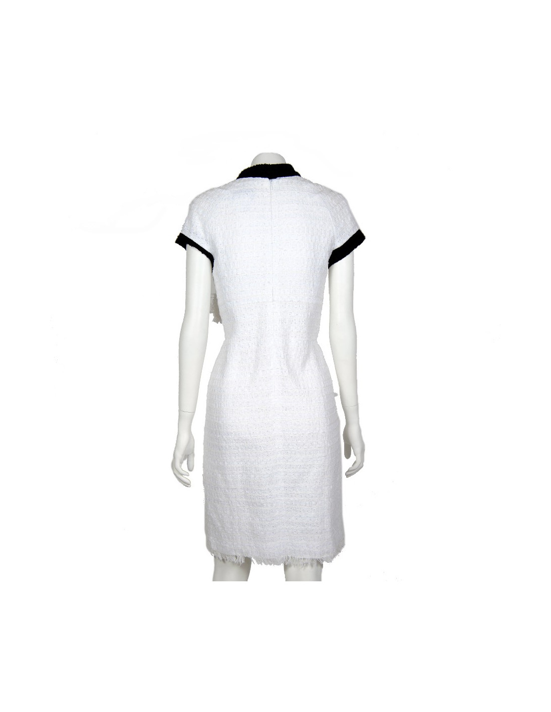 Robe Chanel blanche et noire T 38 FR, avec encolure et bords des manches noirs. Tissu façon tweel en coton perforé. Col rond. Deux poches avant.Robe cintré avec fermeture zippée au dos. 's des soldes.