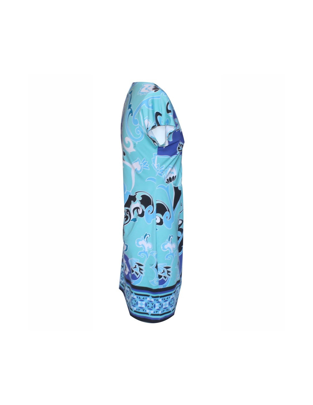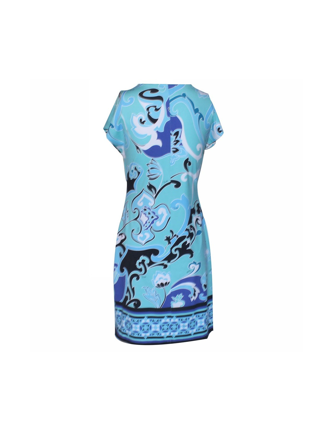 Robe Émilio Pucci T38 aux motifs célèbres de cette grande maison, dans les tons bleu, jade, violet, blanc et noir. Manches courtes et col V. Très bon état.