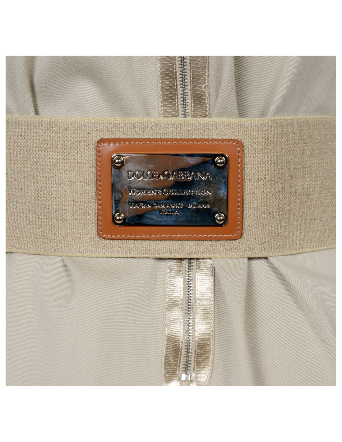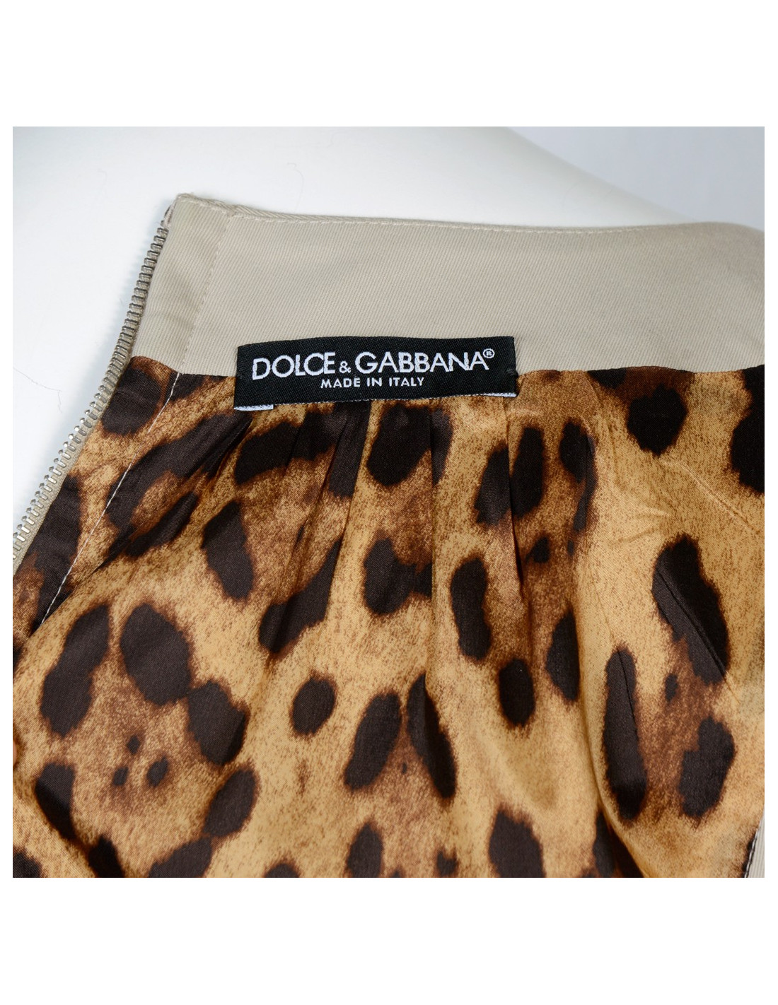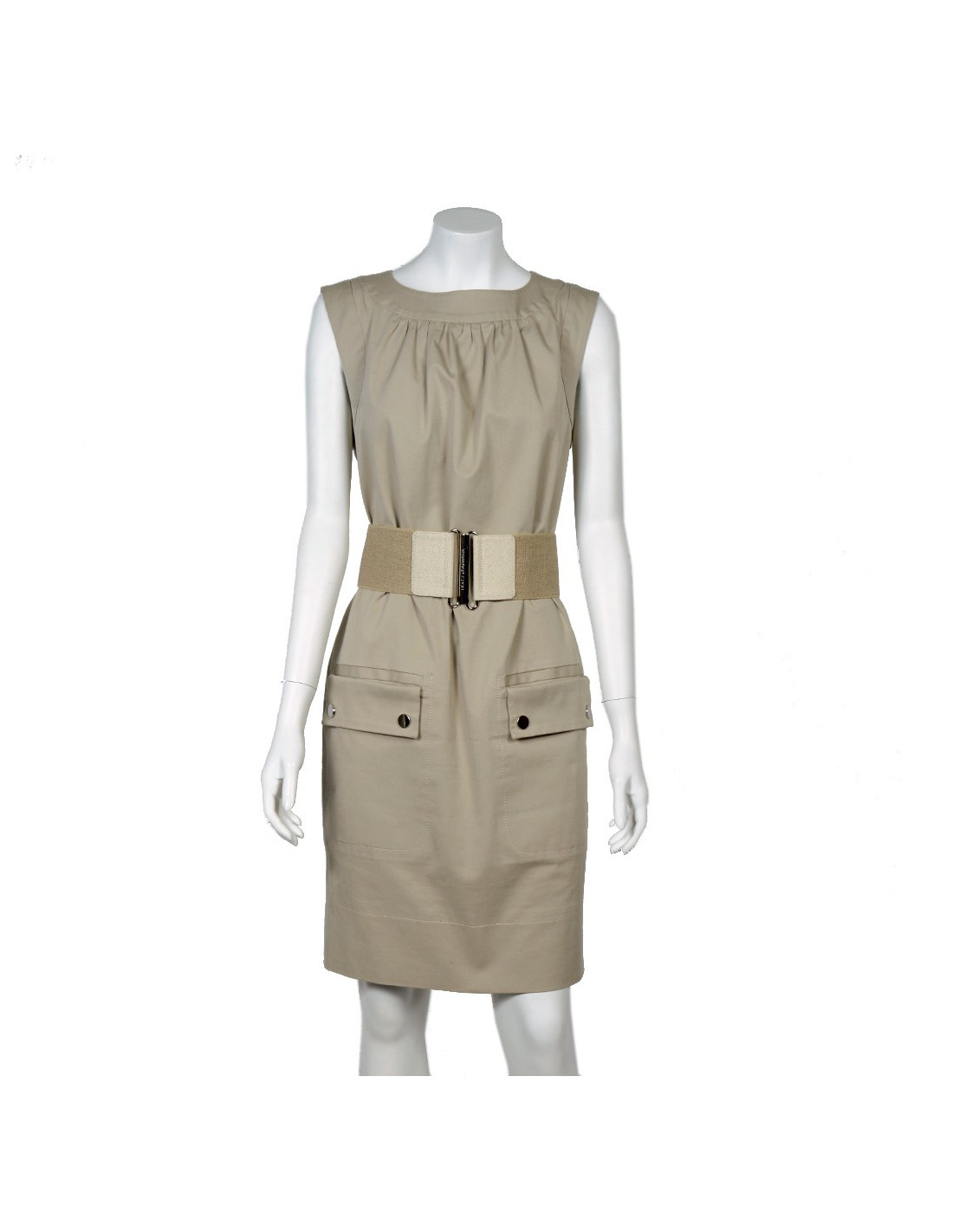 Robe Dolce & Gabbana en coton de couleur beige. Taille 44 italien équivaut à une taille 40 française. La doublure est en imprimé léopard. Fermeture zippée dans le dos. Une poche plaquée de chaque côté. Une large ceinture en stretch vient resserer la taille. Au centre, une plaque en cuir verni et en métal argenté avec les inscriptions "Dolce & Gabbana ...." En très bon état.
