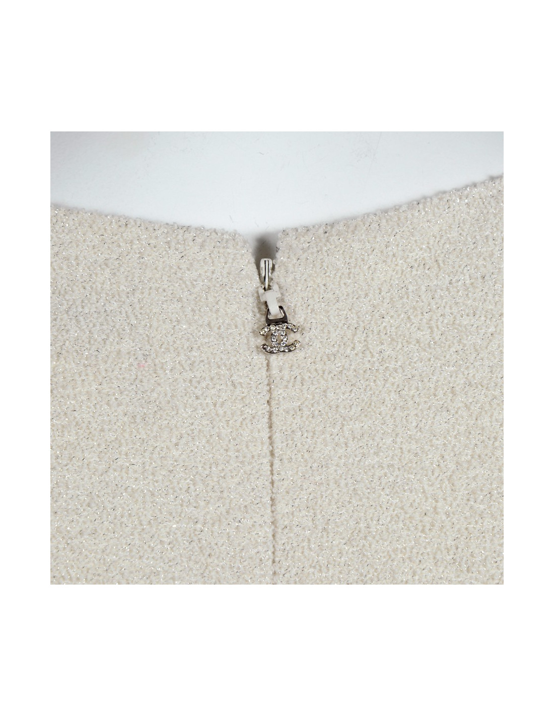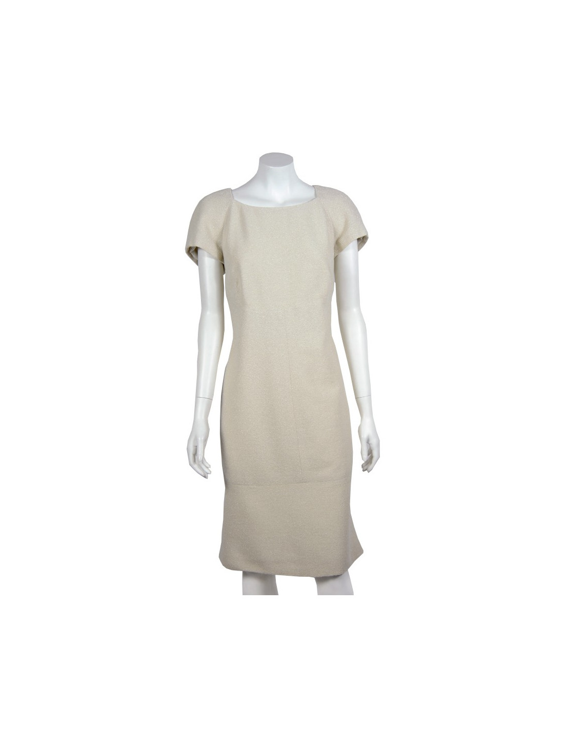 Indémodable robe de la maison Chanel taille 42 FR en laine et soie, couleur écrue et incrustations de fils argentés, coupe droite, manches courtes bouffantes. La doublure est en soie avec impressions Chanel. La robe se ferme au dos par une longue et fine fermeture zippée.