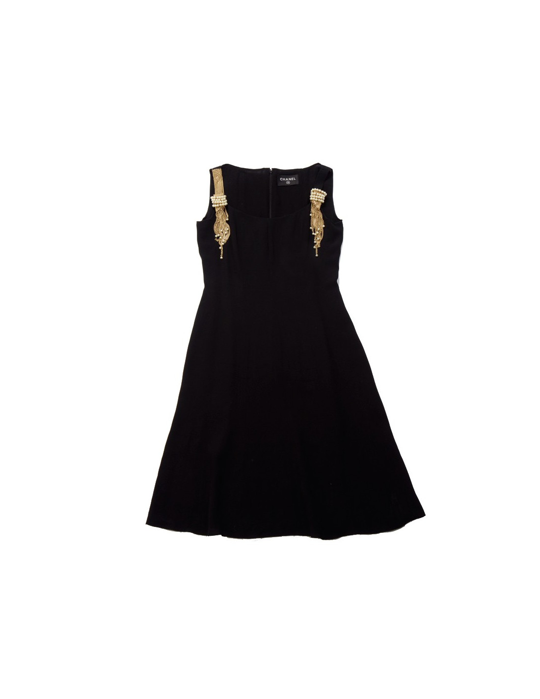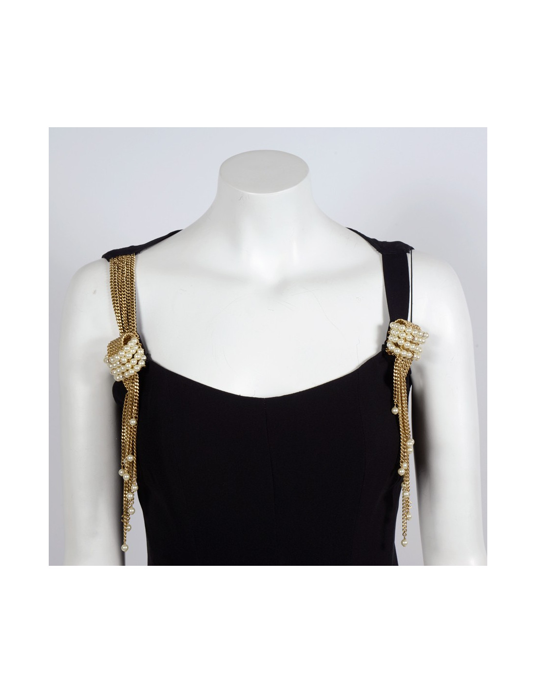 Ravissante robe de cocktail sans manche de la Maison Chanel en crêpe de soie noire. La robe est sublimée par des chaines et perles nacrées accrochées aux épaules. Elle se ferme au dos par une longue et fine fermeture zippée. Il n'y pas d'étiquette de taille, équivaut à un taille 38 FR. Elle est en très bon état