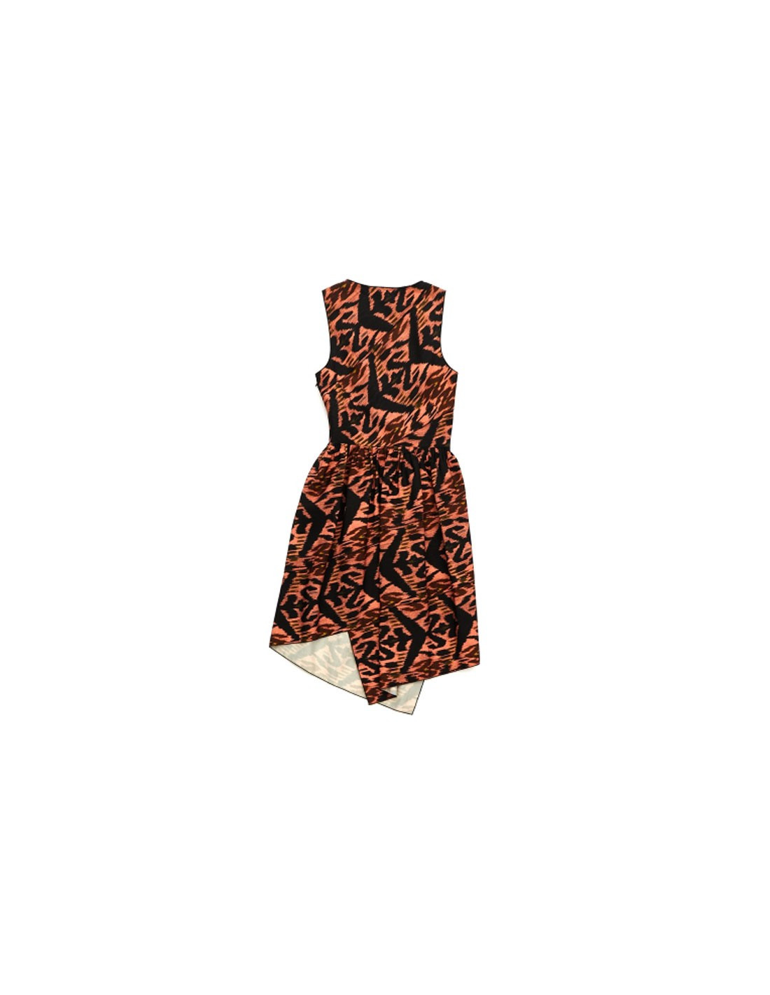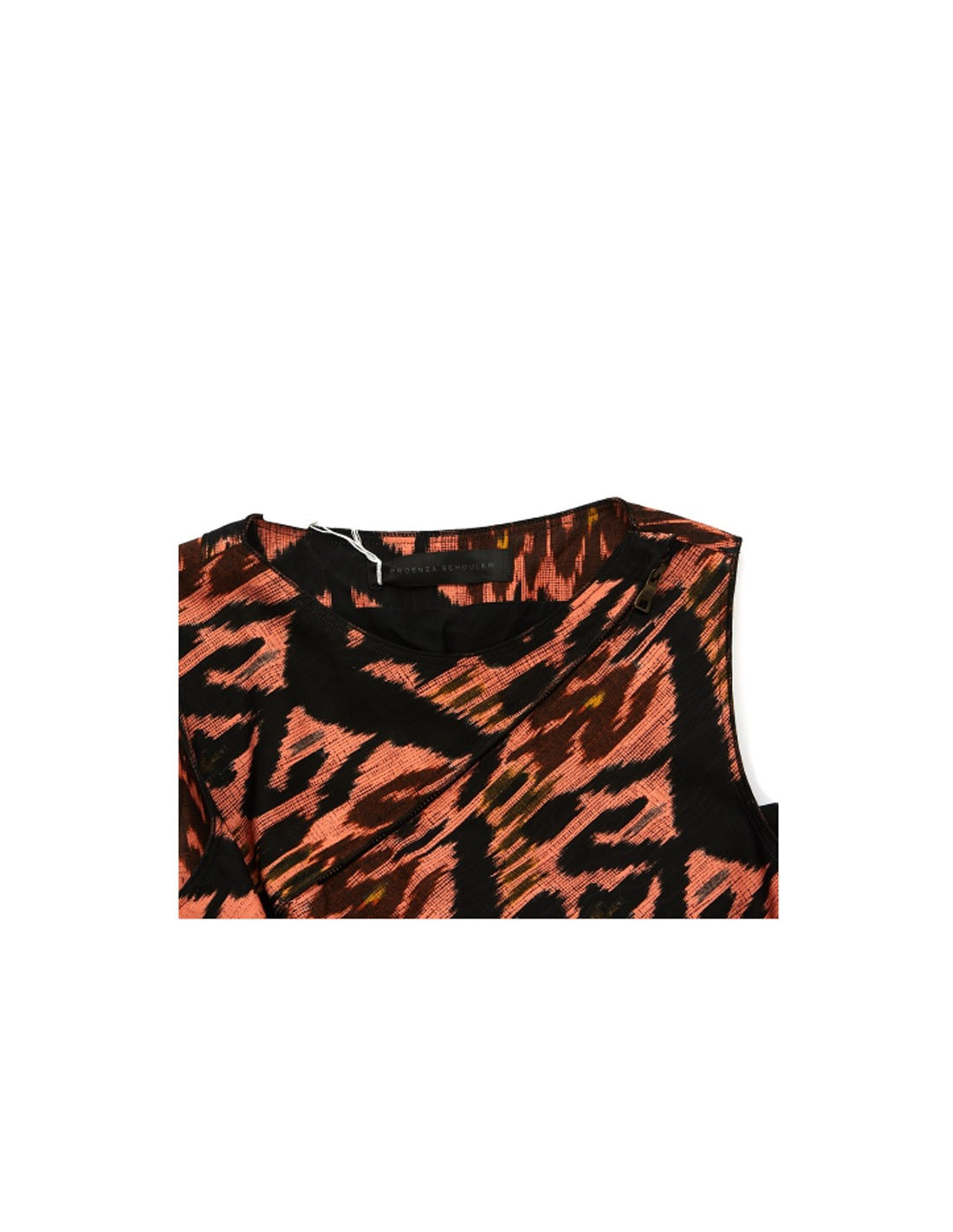 Robe Proenza Schouler courte sans manche noire à motifs ethniques vieux rose et kaki, col rond, zip latéral invisible.