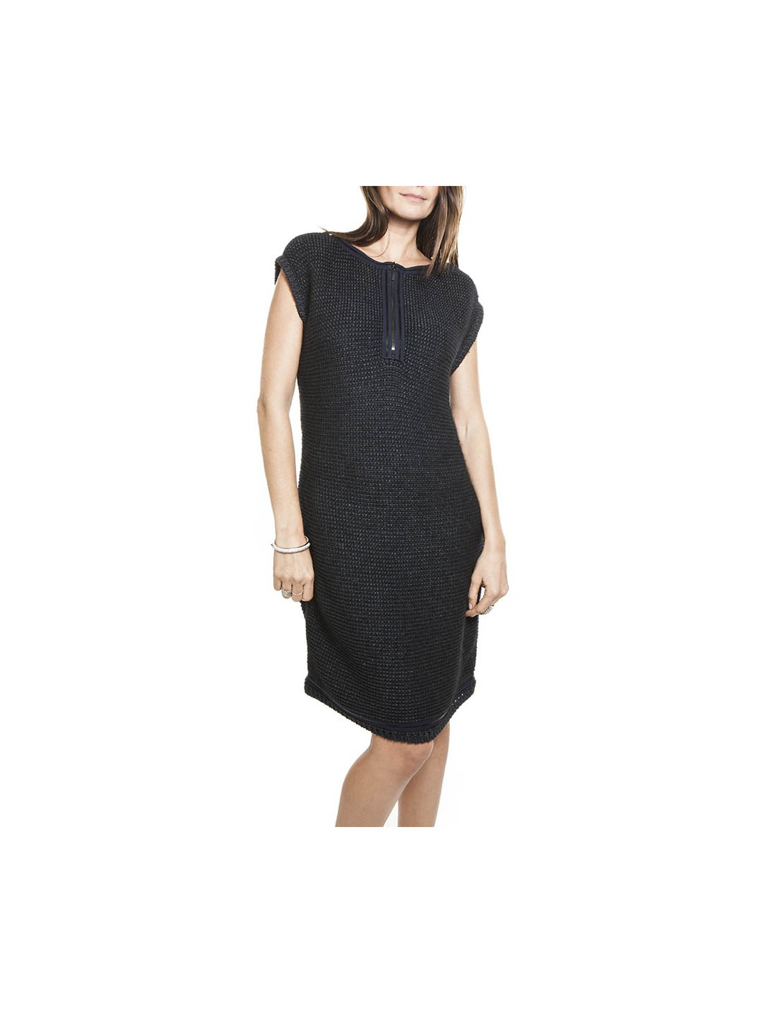 Une fermeture éclair entre le col et la poitrine.