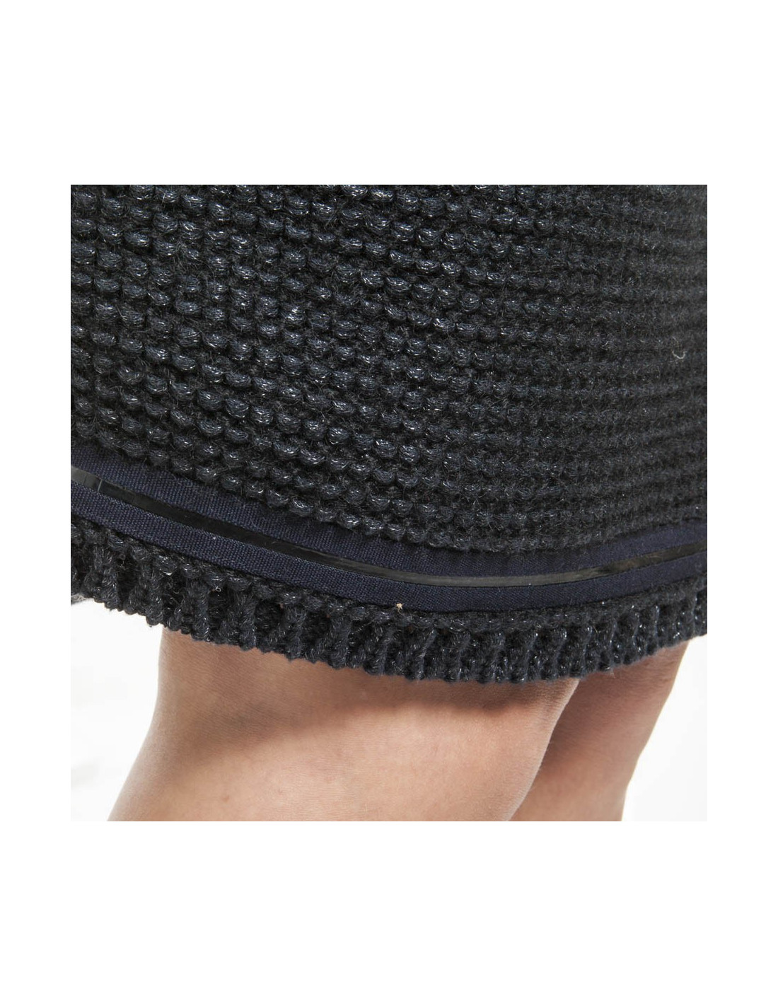 Elégante robe CHANEL en tricot bleu marine et noir sans manche gansée d'un ruban de gros grain bleu marine et