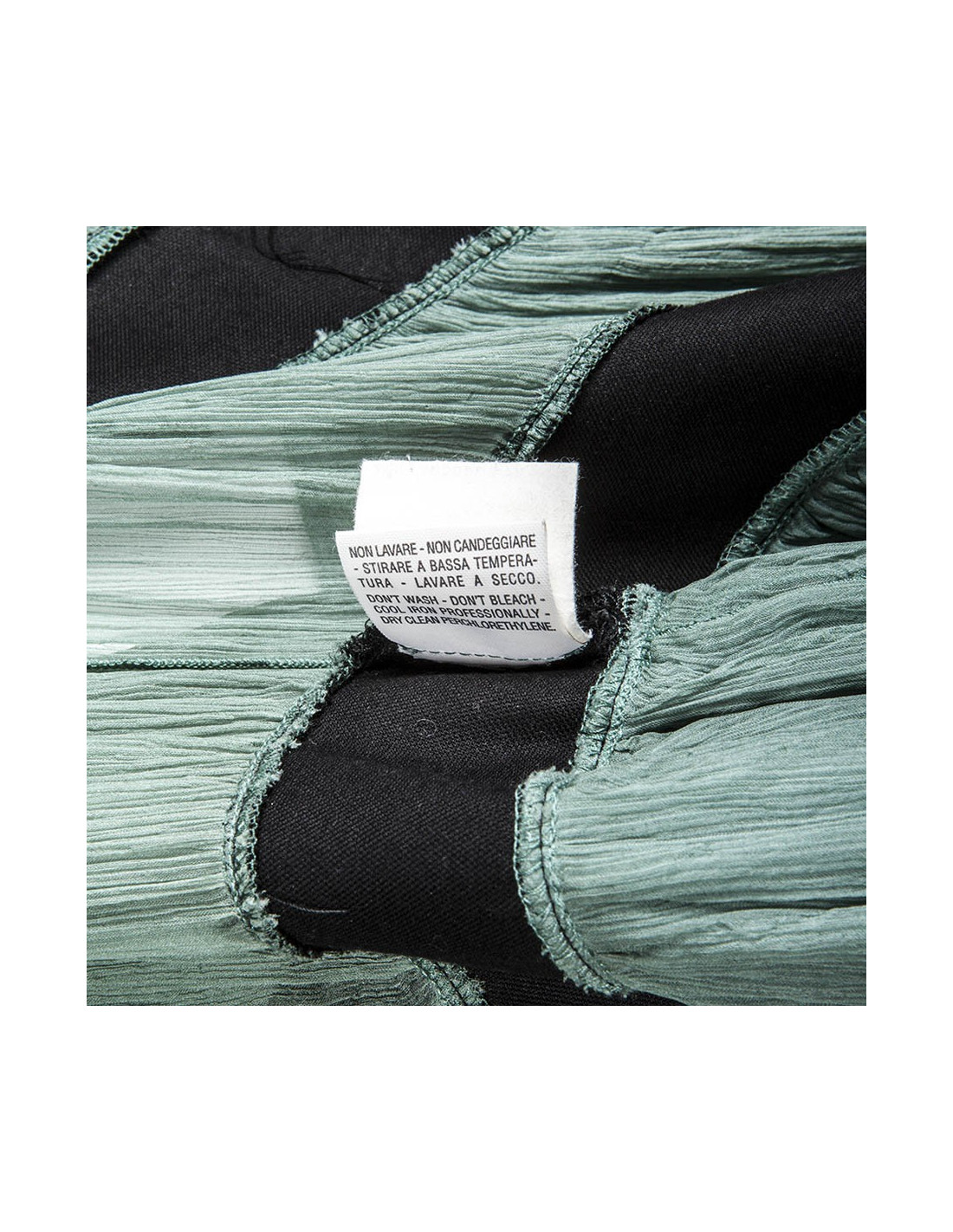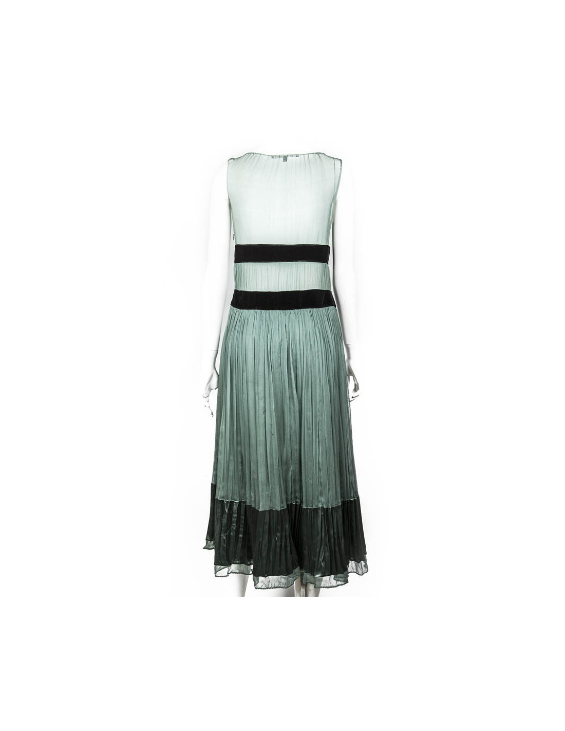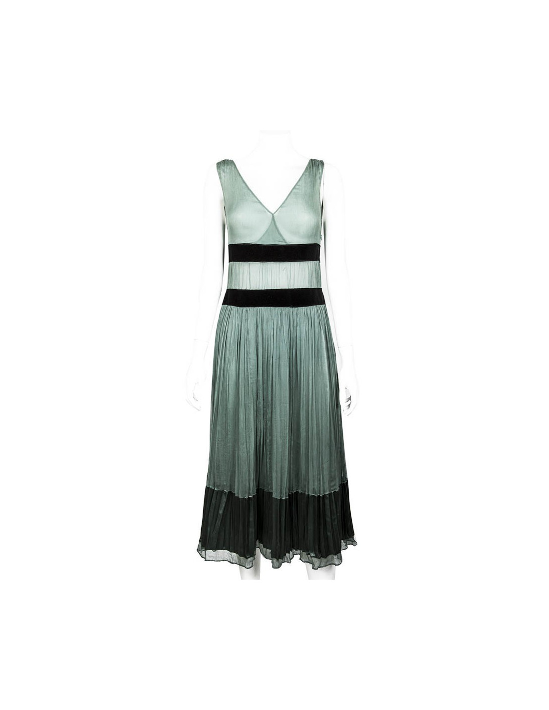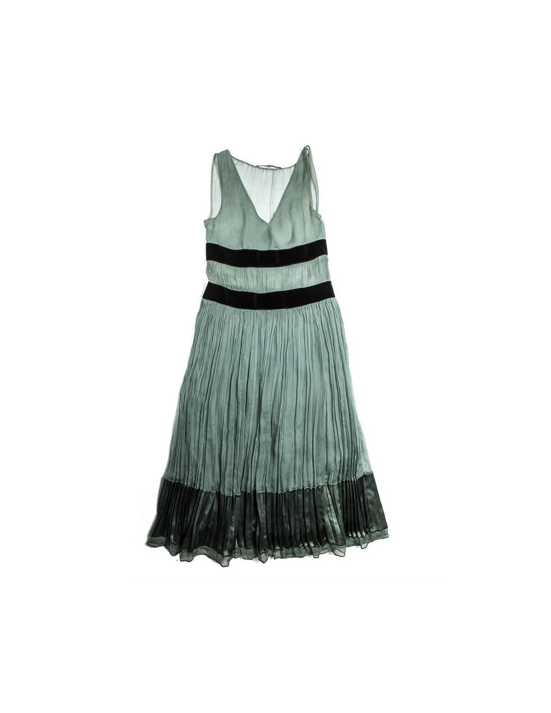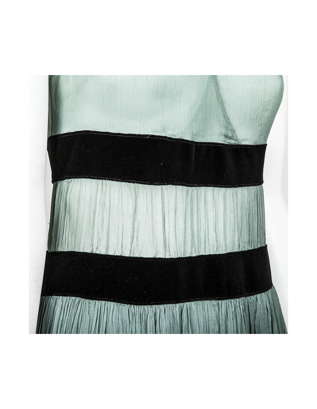 En pure soie, marquée à la taille de velour noir et soulignée d'un plissé soleil de satin au bas. Cette robe aux allures de déesse grecque est une aude à la féminité. En bon état. Quelques fils tirés.