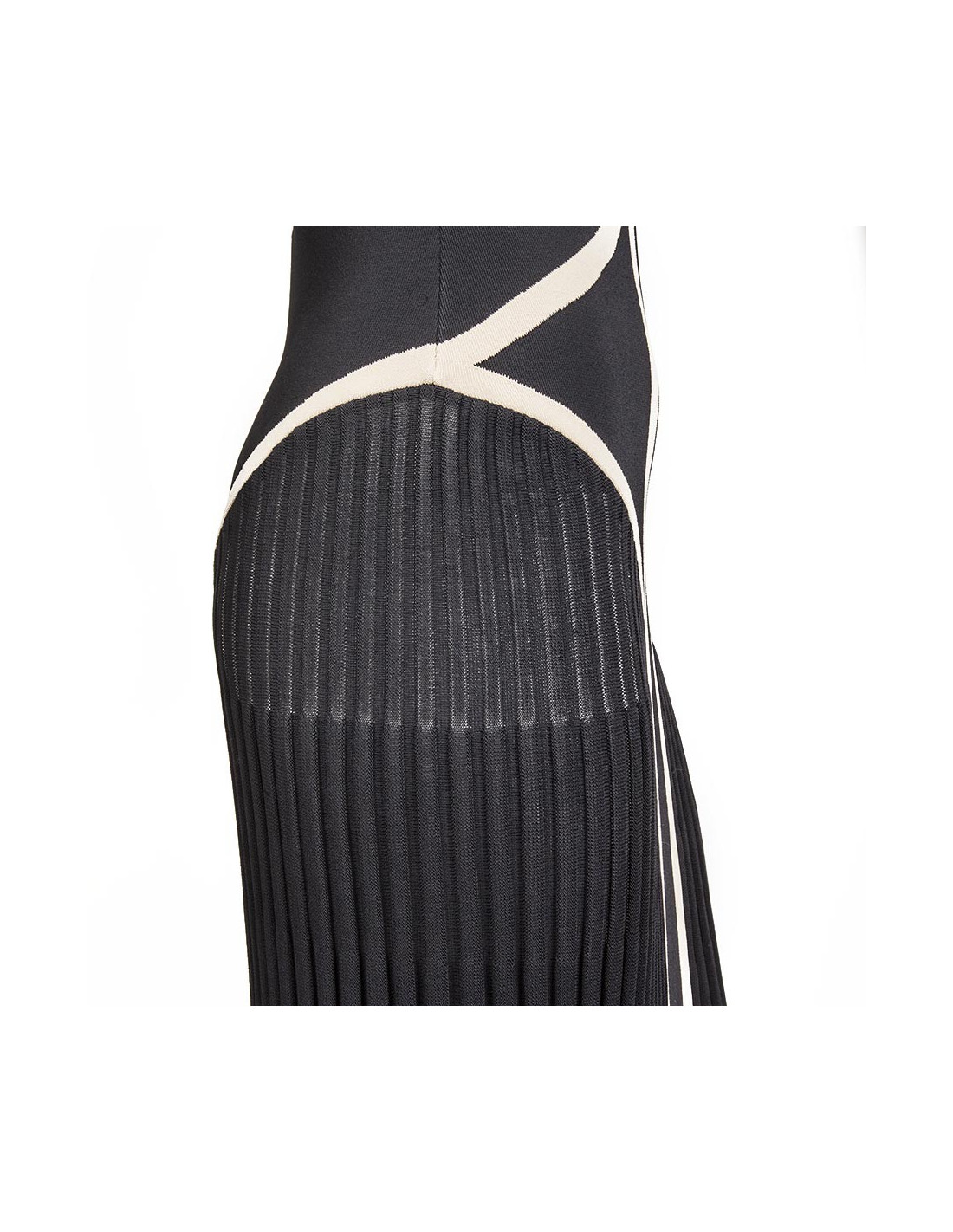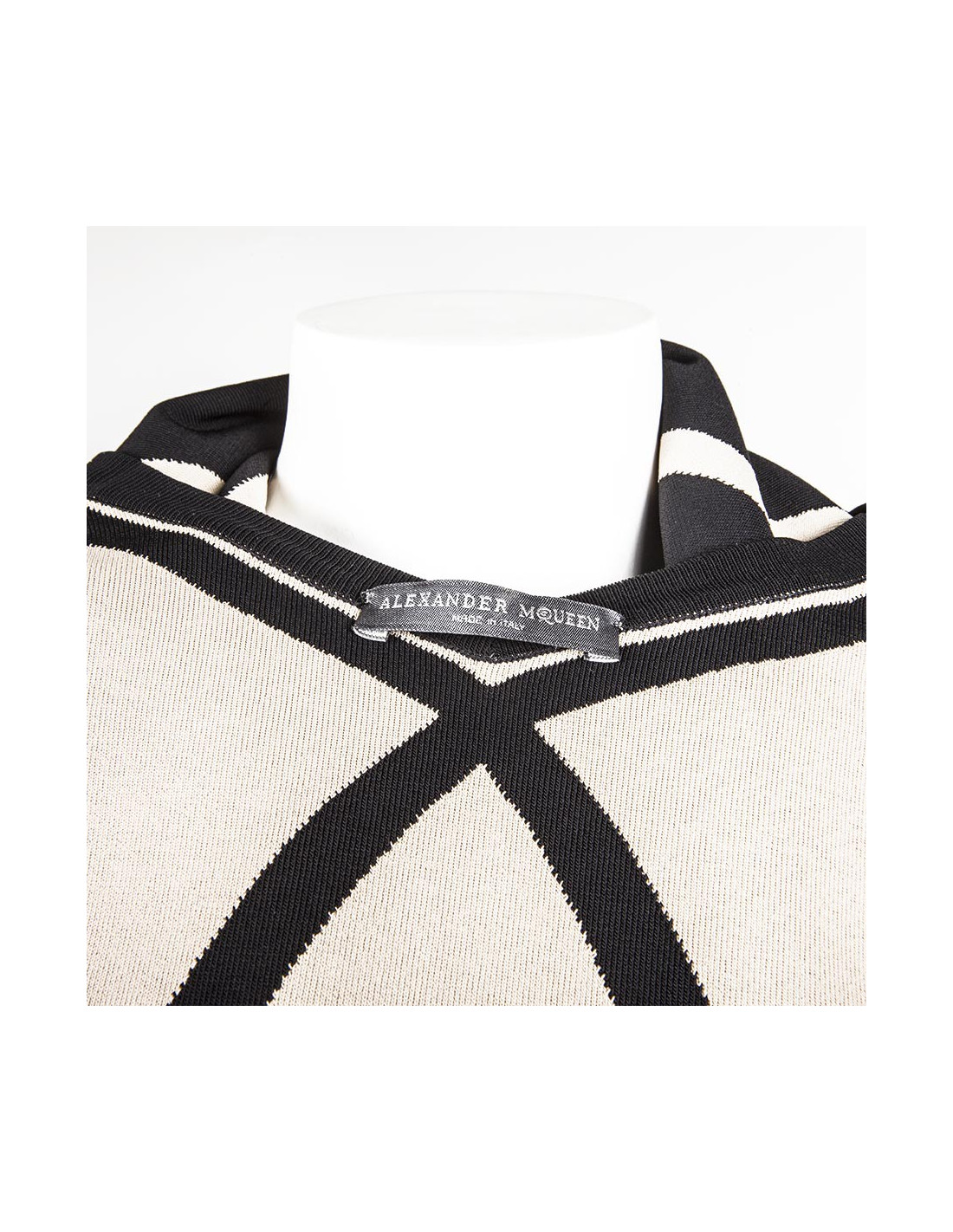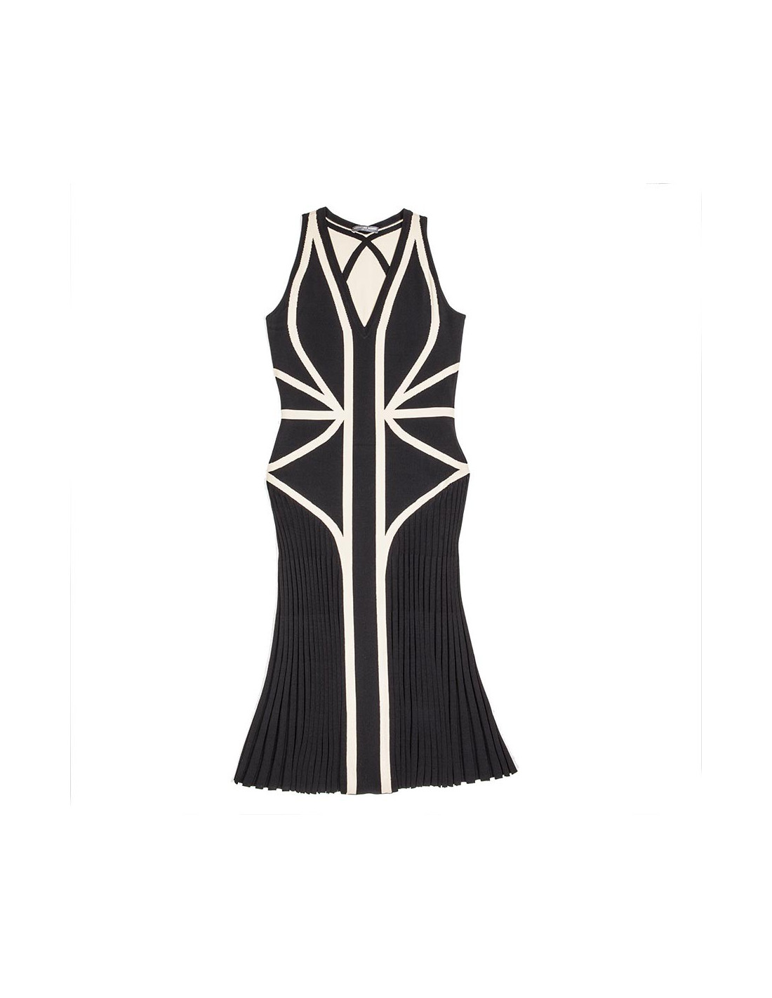 Robe sans manches en viscose rigide et élasthanne, bicolore beige et noir, Alexander Mc Queen taille 36 FR (absence d'étiquette de taille). Coupe fourreau, plissée à partir des hanches.