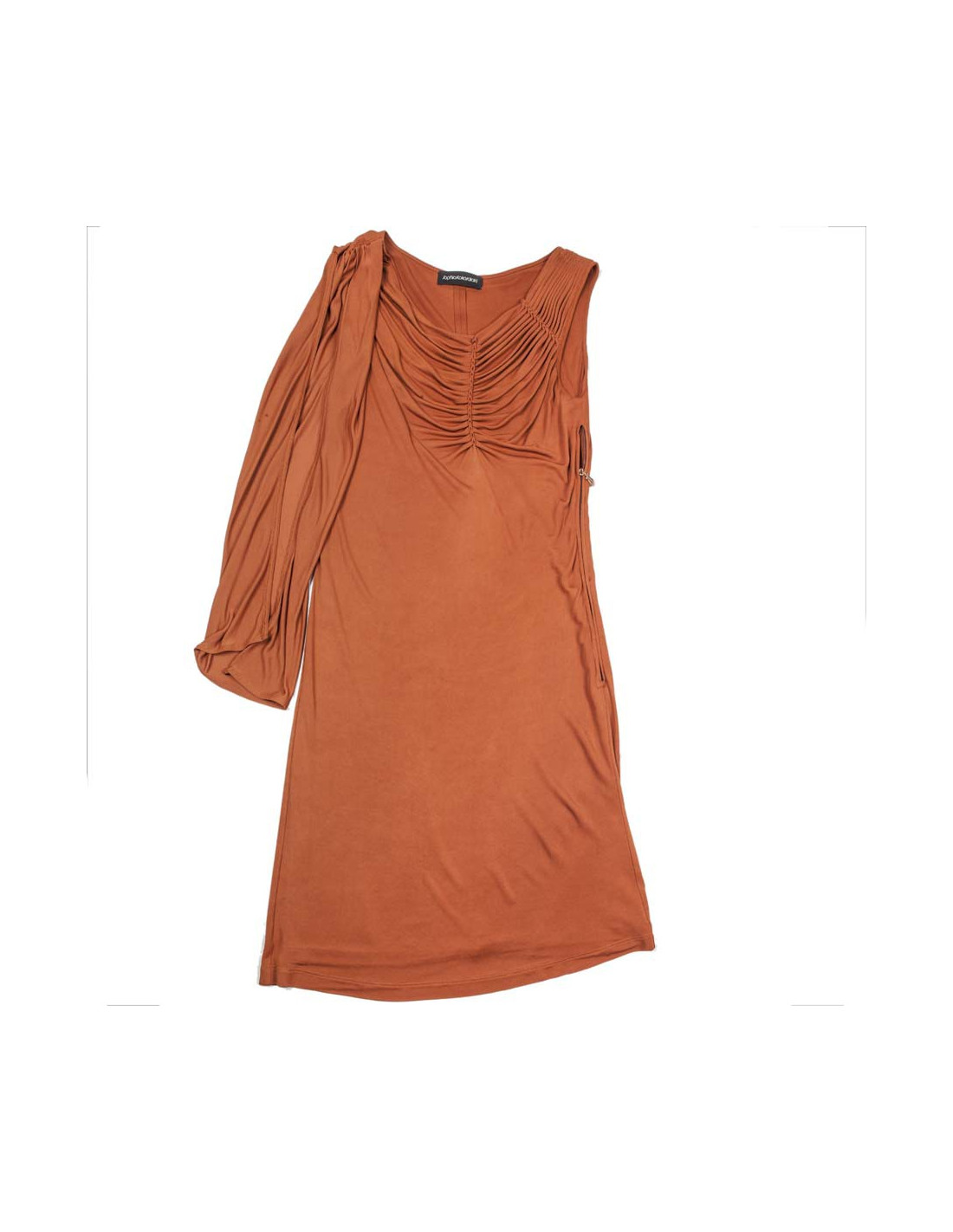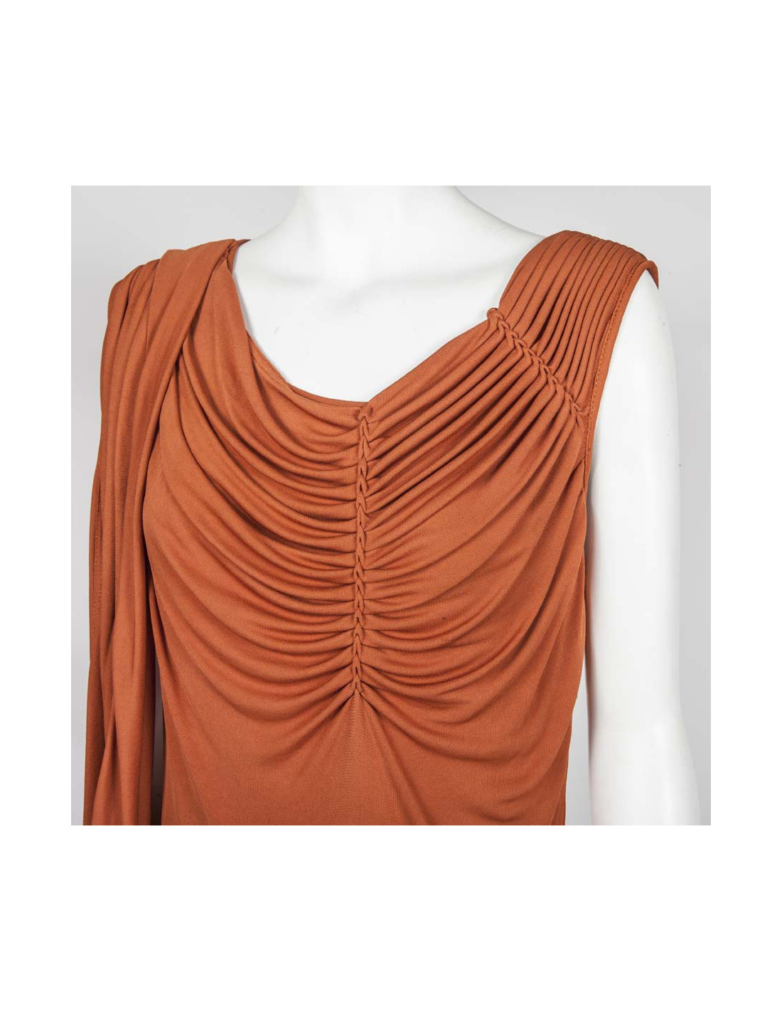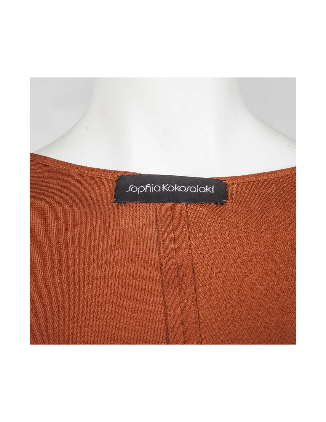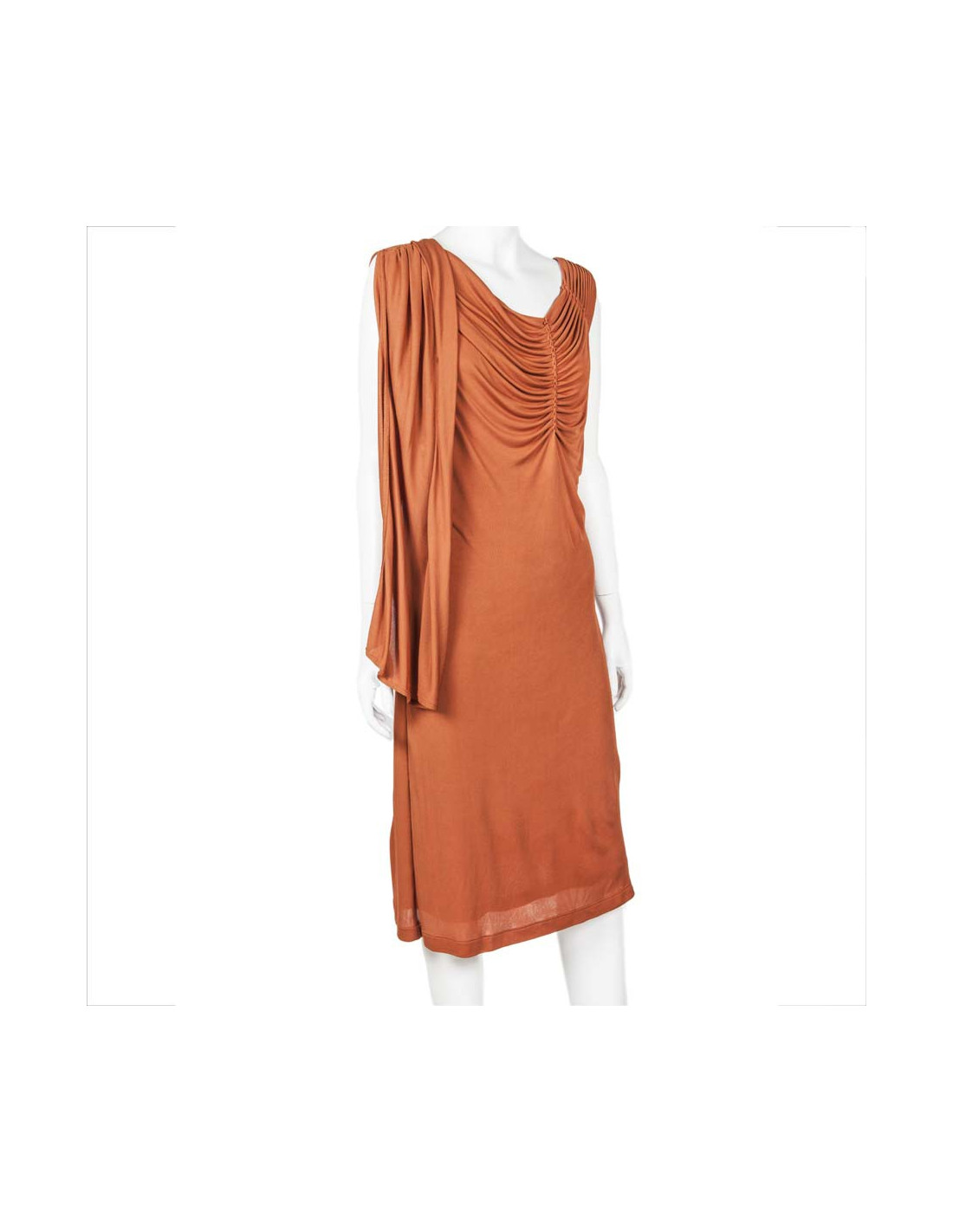 Robe en viscose couleur rouille Sophia Kokosalaki taille 44 IT / 40 FR. Coupe droite, tissu fluide drapé, doublée dans la même matière, à fermeture zippée sur le côté gauche.