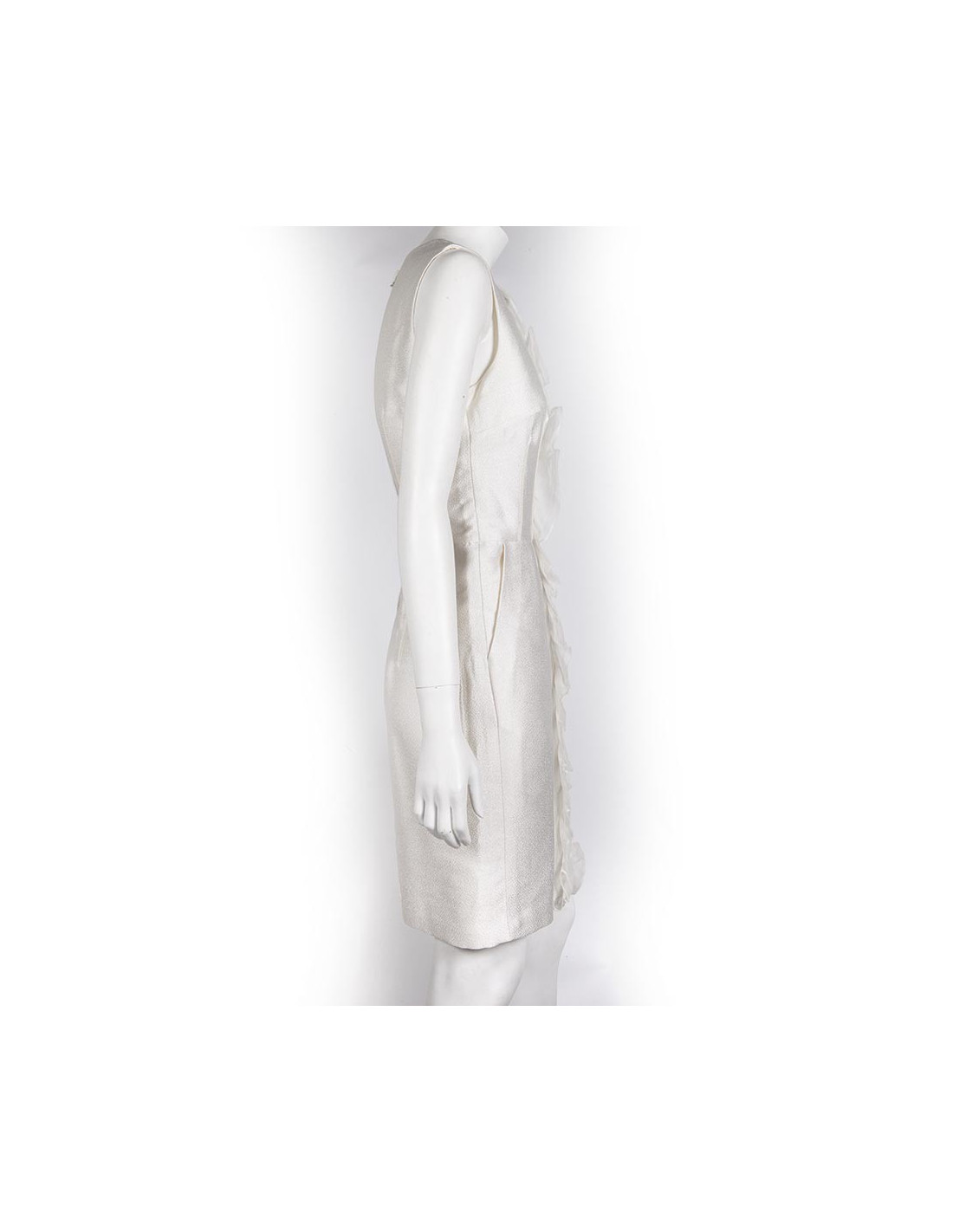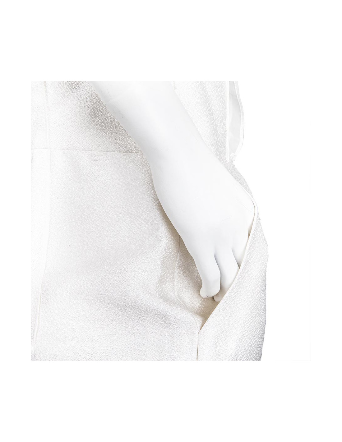 Détails : Incarnant l'élégance intemporelle et le savoir-faire italien raffiné, cette superbe robe sans manches D&G, taille IT 42 (FR 38), est une pièce maîtresse. Confectionnée dans un luxueux acétate blanc texturé, elle est sublimée par un magnifique panneau central de volants délicats en soie qui confère un éclat satiné captivant, offrant un contraste textural sophistiqué. Entièrement doublée de soie blanche douce, elle assure un confort absolu et un tombé impeccable. Pratique et chic, elle est dotée de deux poches latérales discrètes et d'une légère fente à l'arrière pour une aisance de mouvement optimale. Une fermeture éclair dissimulée garantit une silhouette épurée. Présentée en très bon état, cette robe D&G est une pièce polyvalente, idéale pour des événements de jour élégants ou des soirées distinguées.