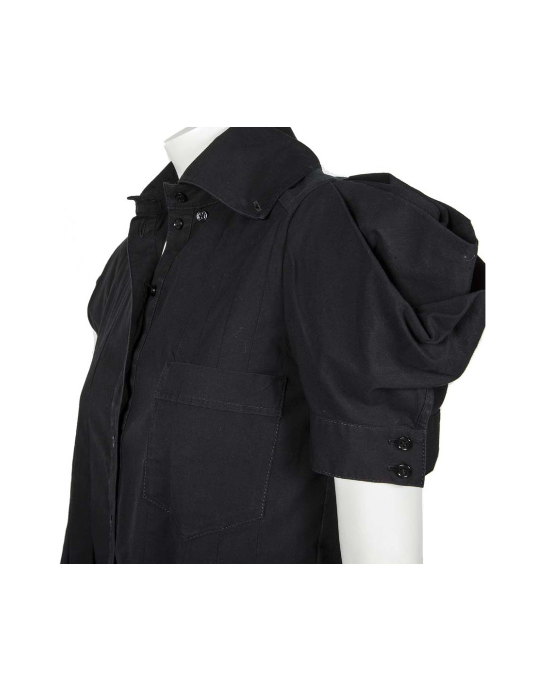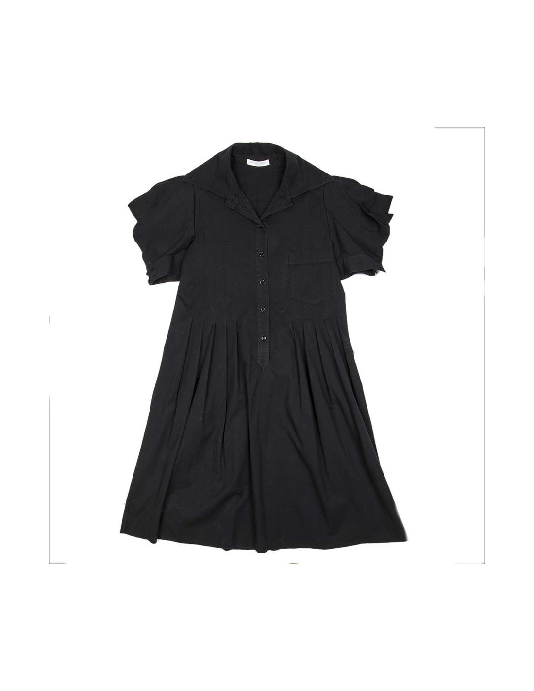 Robe coupe droite, plissée à l'avant et à l'arrière, col marin, composée d'une poche à gauche de la poitrine, se ferme par une rangée de boutons.