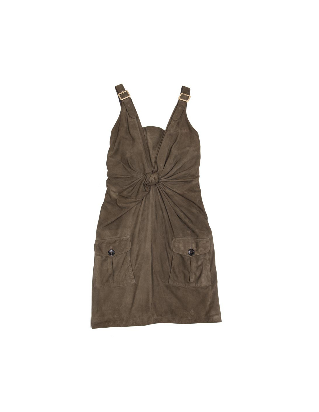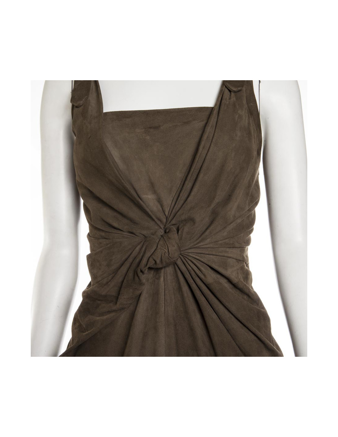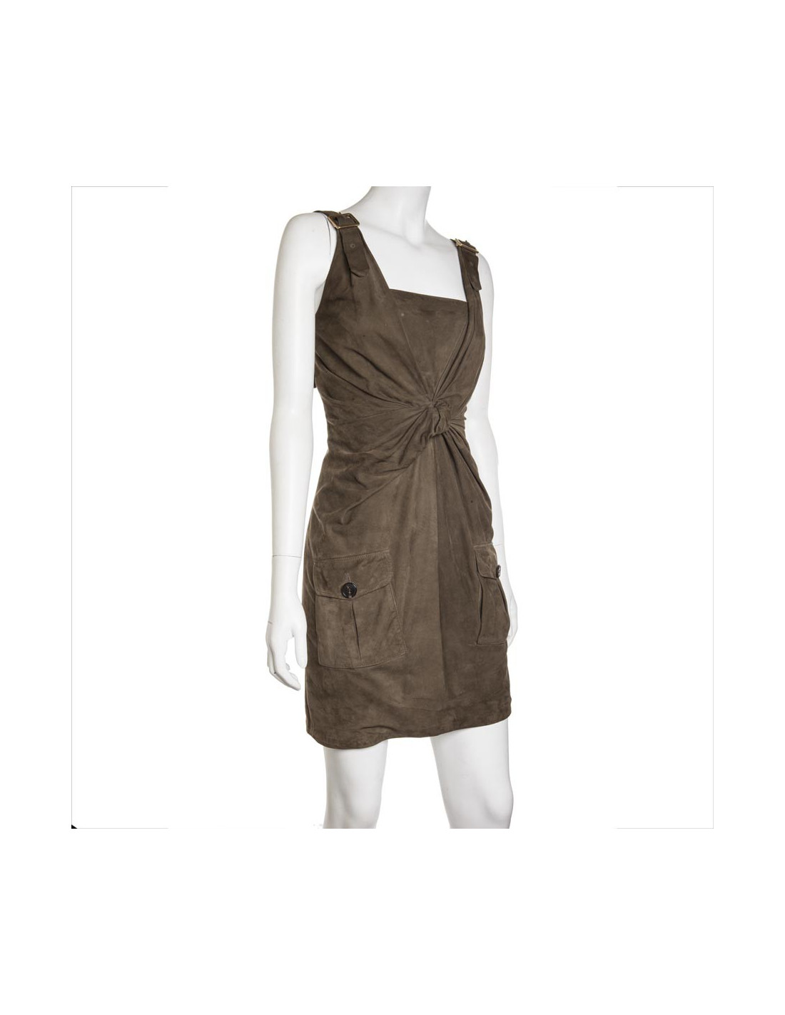 Robe à bretelles en daim kaki Christian Dior taille 36. Les bretelles, à crans, sont attachées chacune par une paire de boucles dorées siglées "Christian Dior". Cintrée, elle est drapée grâce à un noeud au niveau de la poitrine. Doublée de soie kaki, composée de deux poches fermées à boutons siglés Dior.