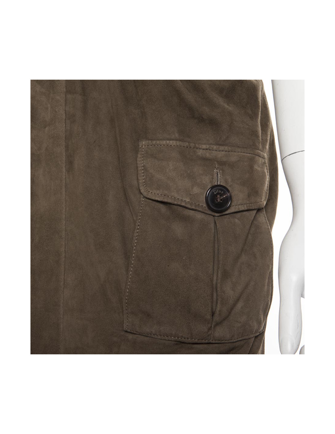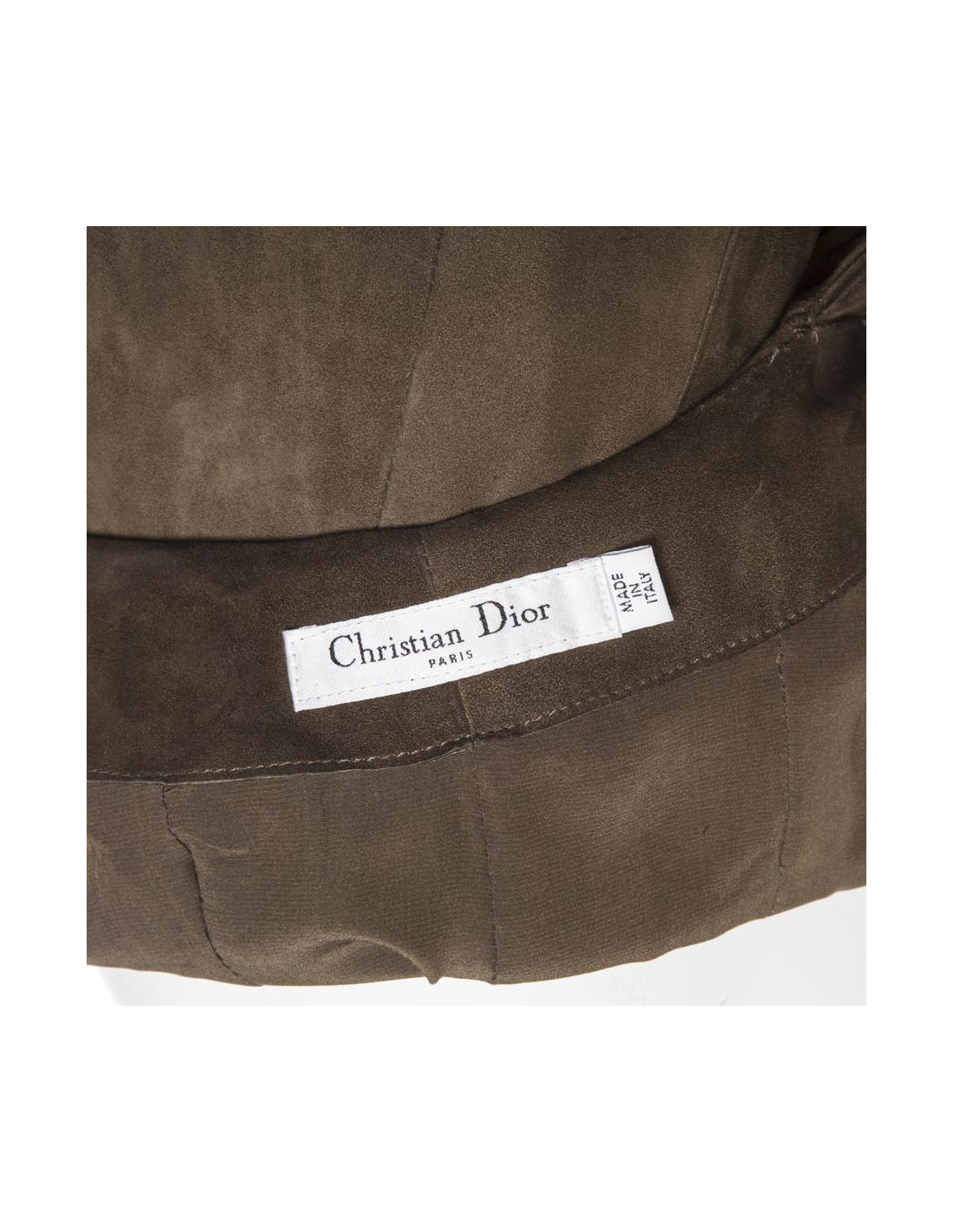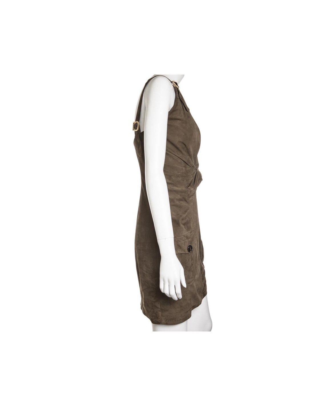 Robe à bretelles en daim kaki Christian Dior taille 36. Les bretelles, à crans, sont attachées chacune par une paire de boucles dorées siglées "Christian Dior". Cintrée, elle est drapée grâce à un noeud au niveau de la poitrine. Doublée de soie kaki, composée de deux poches fermées à boutons siglés Dior.