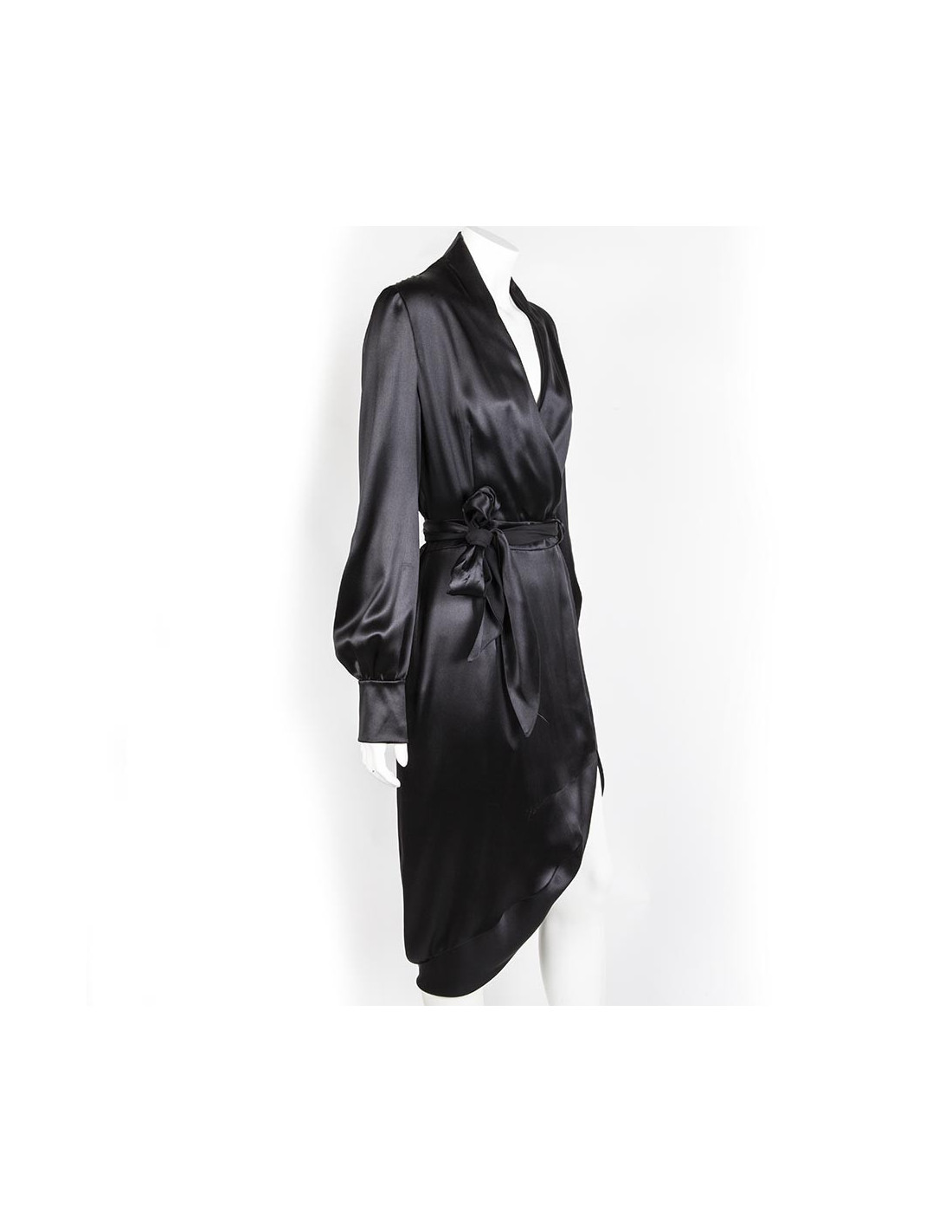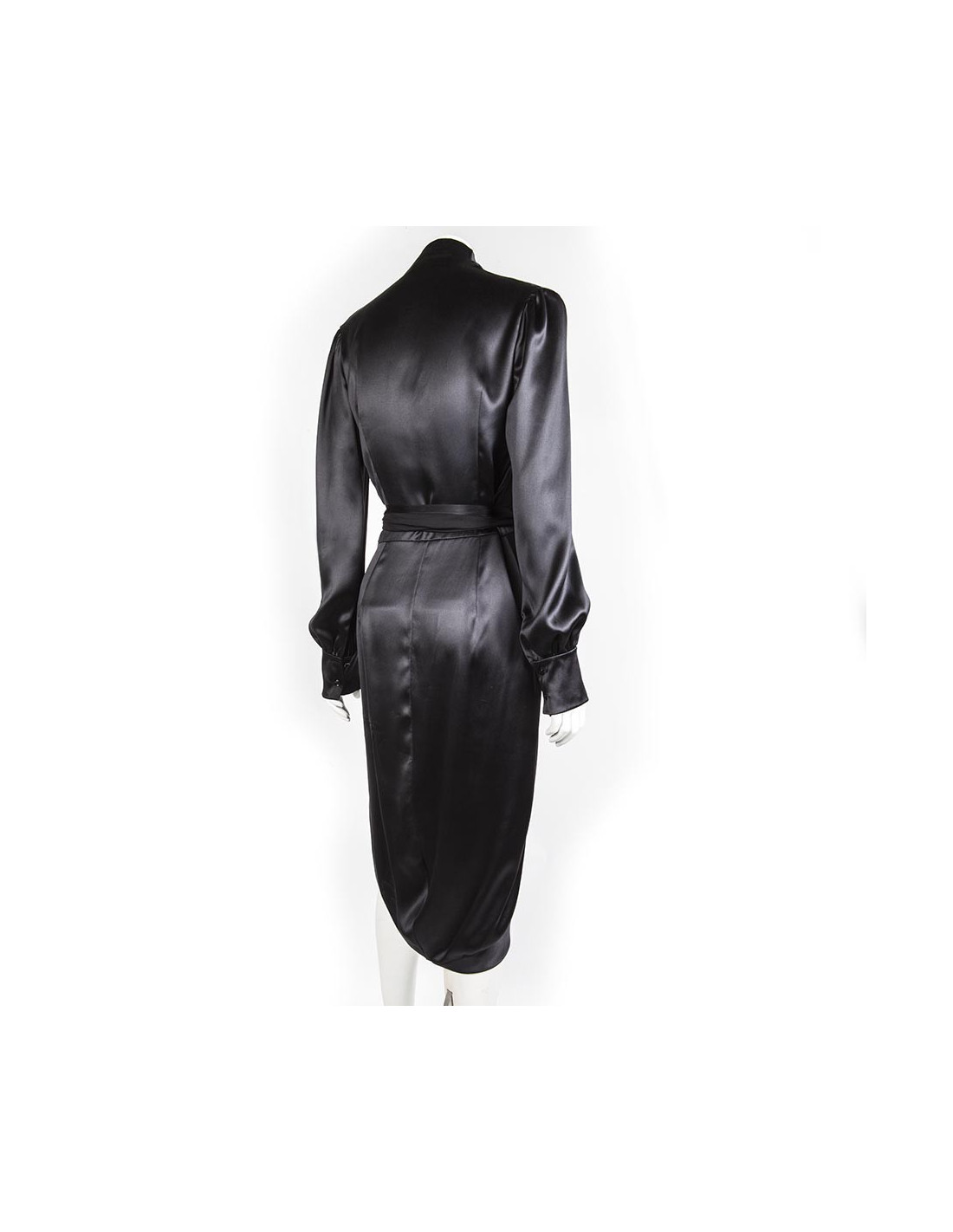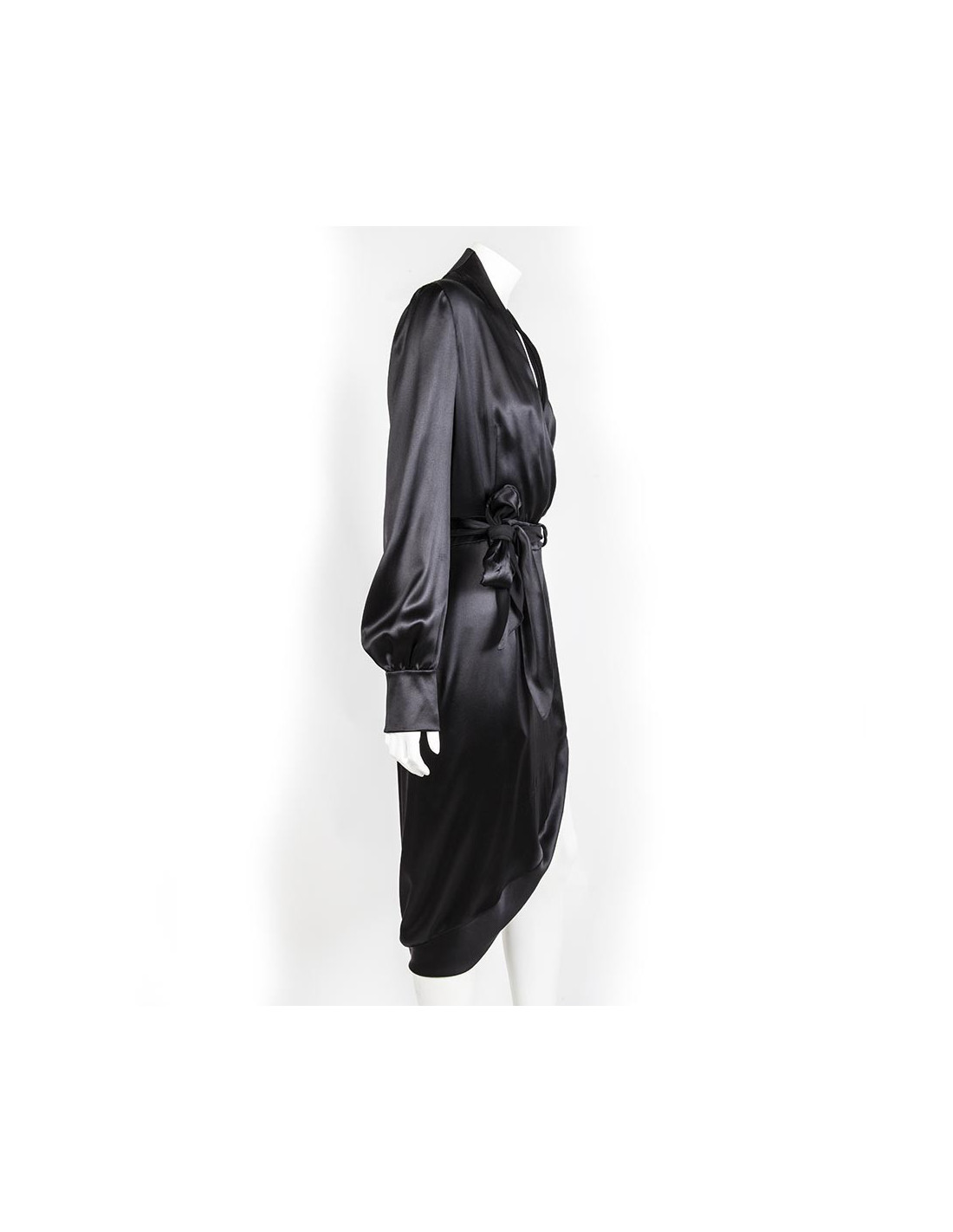 Très élégante robe asymétrique en soie noire Yves Saint Laurent taille 38 FR. Décolleté croisé, cintrée, ornée d'un noeud sur le côté gauche, elle est composée d'un discret zip sous le bras gauche.