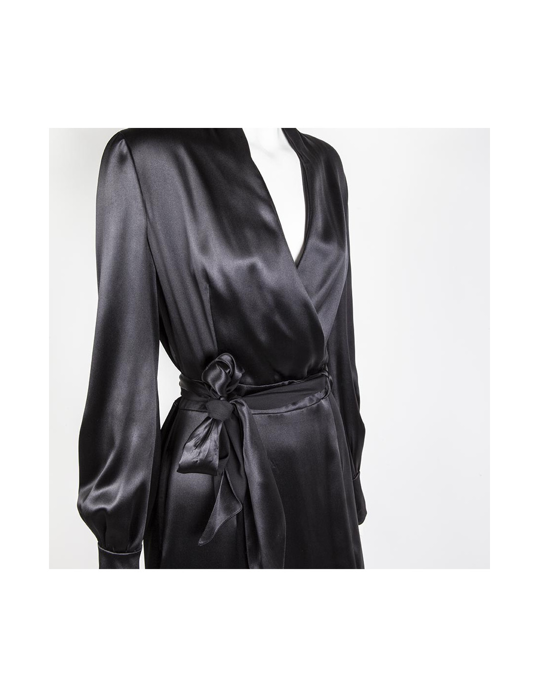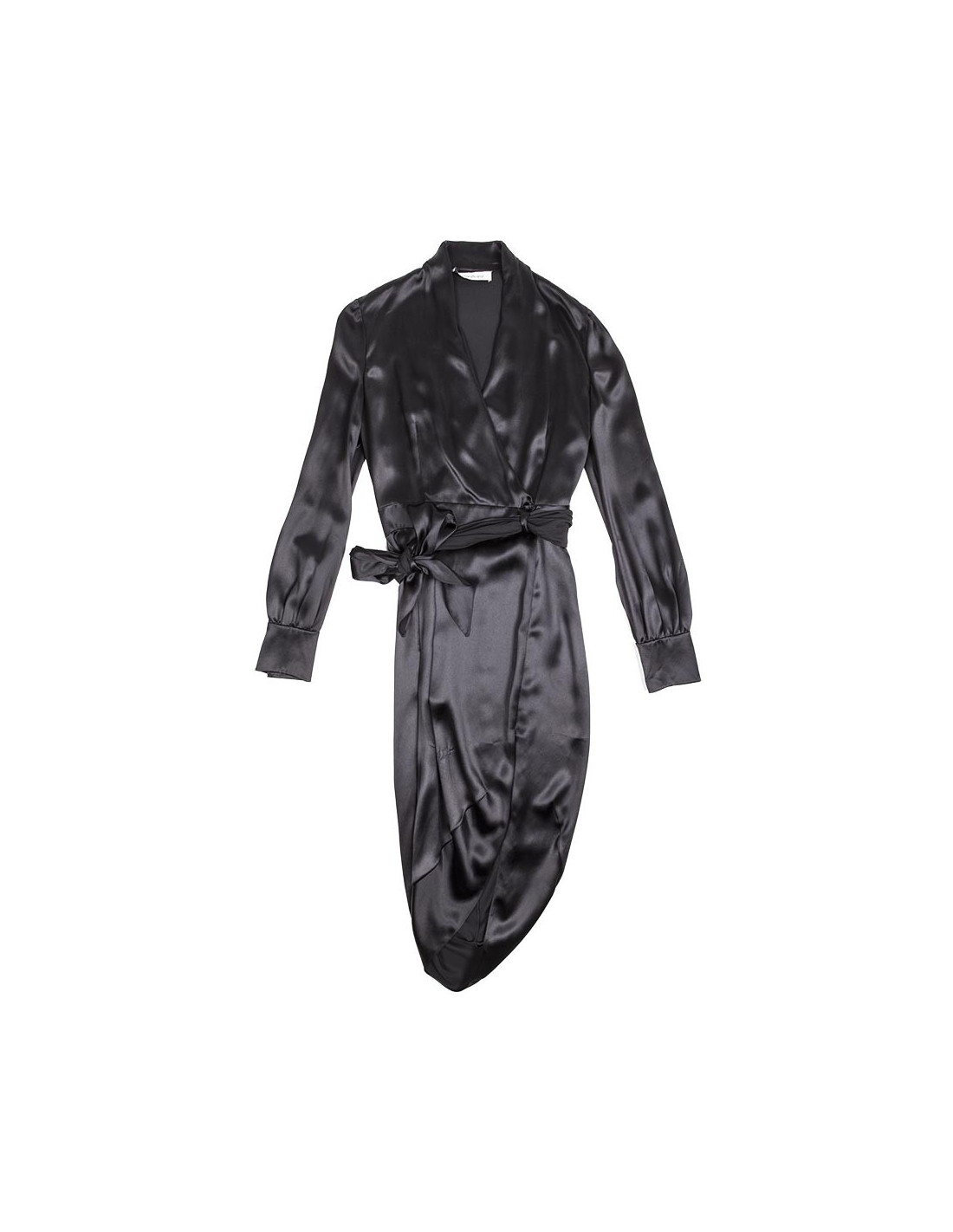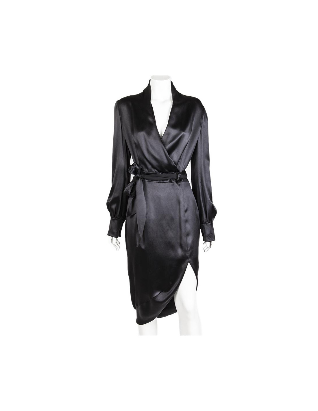 Très élégante robe asymétrique en soie noire Yves Saint Laurent taille 38 FR. Décolleté croisé, cintrée, ornée d'un noeud sur le côté gauche, elle est composée d'un discret zip sous le bras gauche.