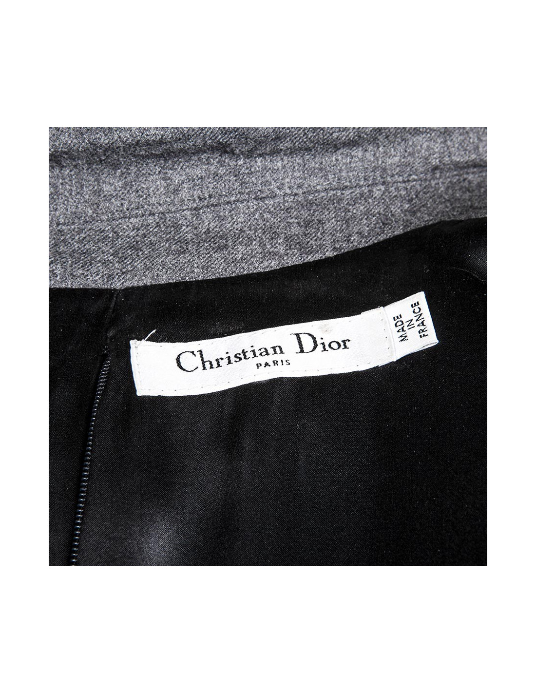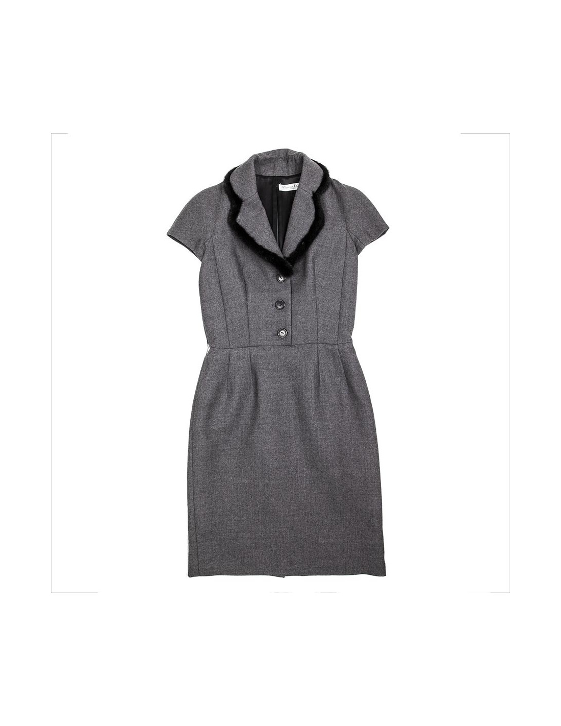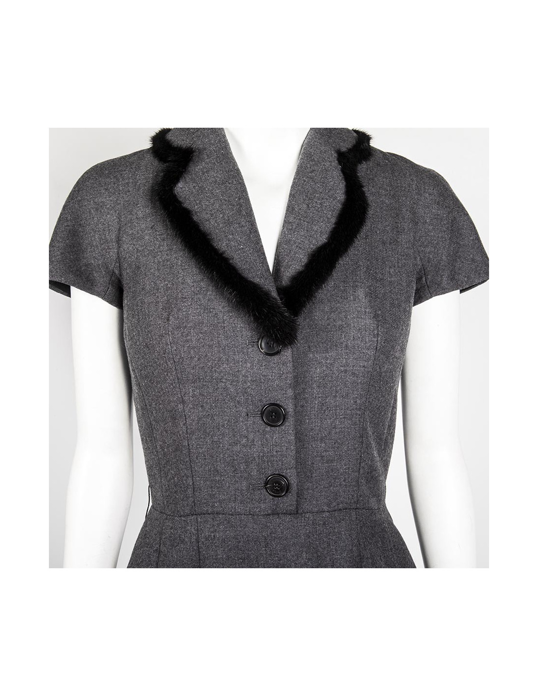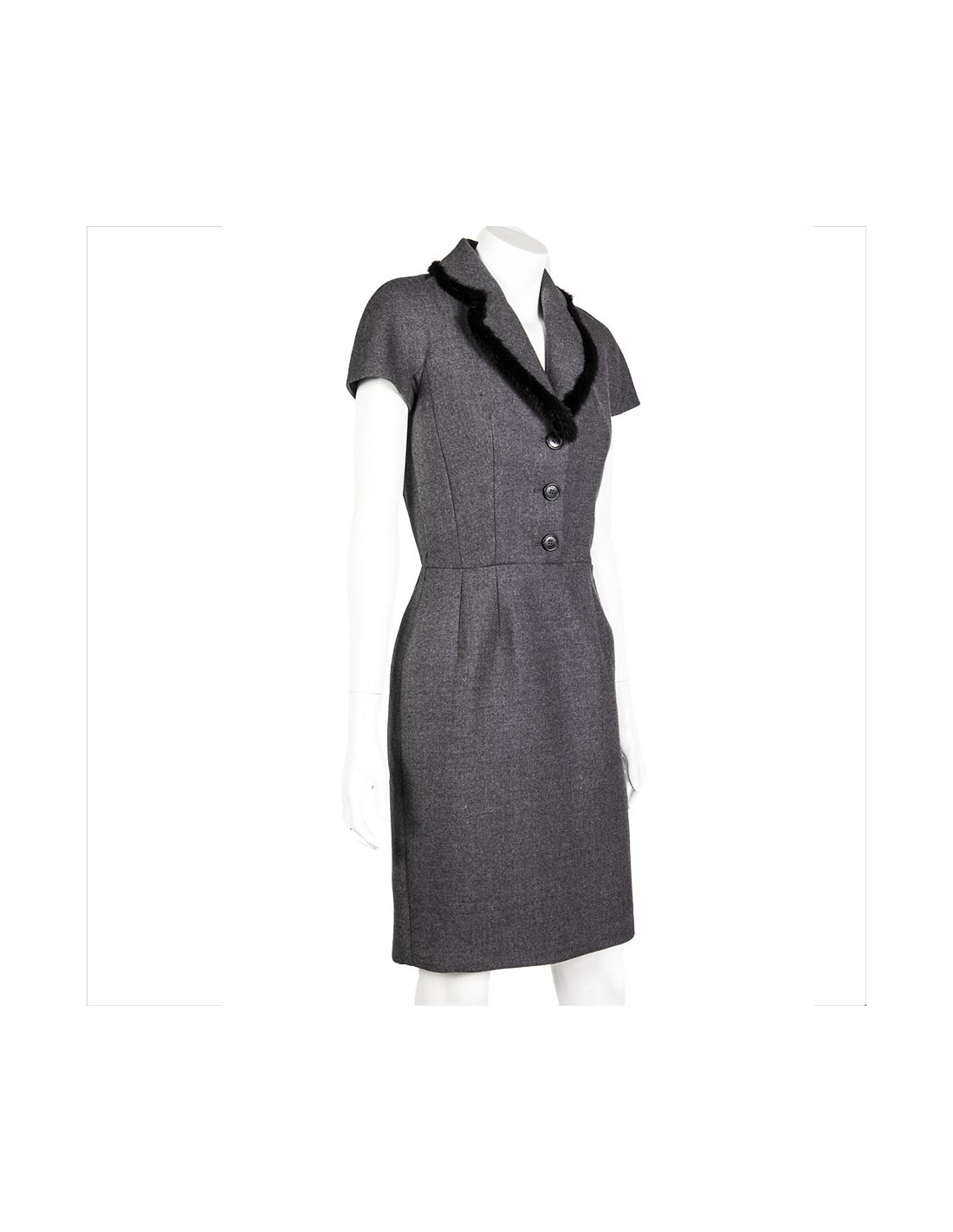 Robe fourreau en laine grise manches raglans Christian Dior taille 36 fr. Fermée par trois boutons marrons siglés Dior, le col est en vison noir véritable. La robe est doublée de soie et zippée à l'arrière.