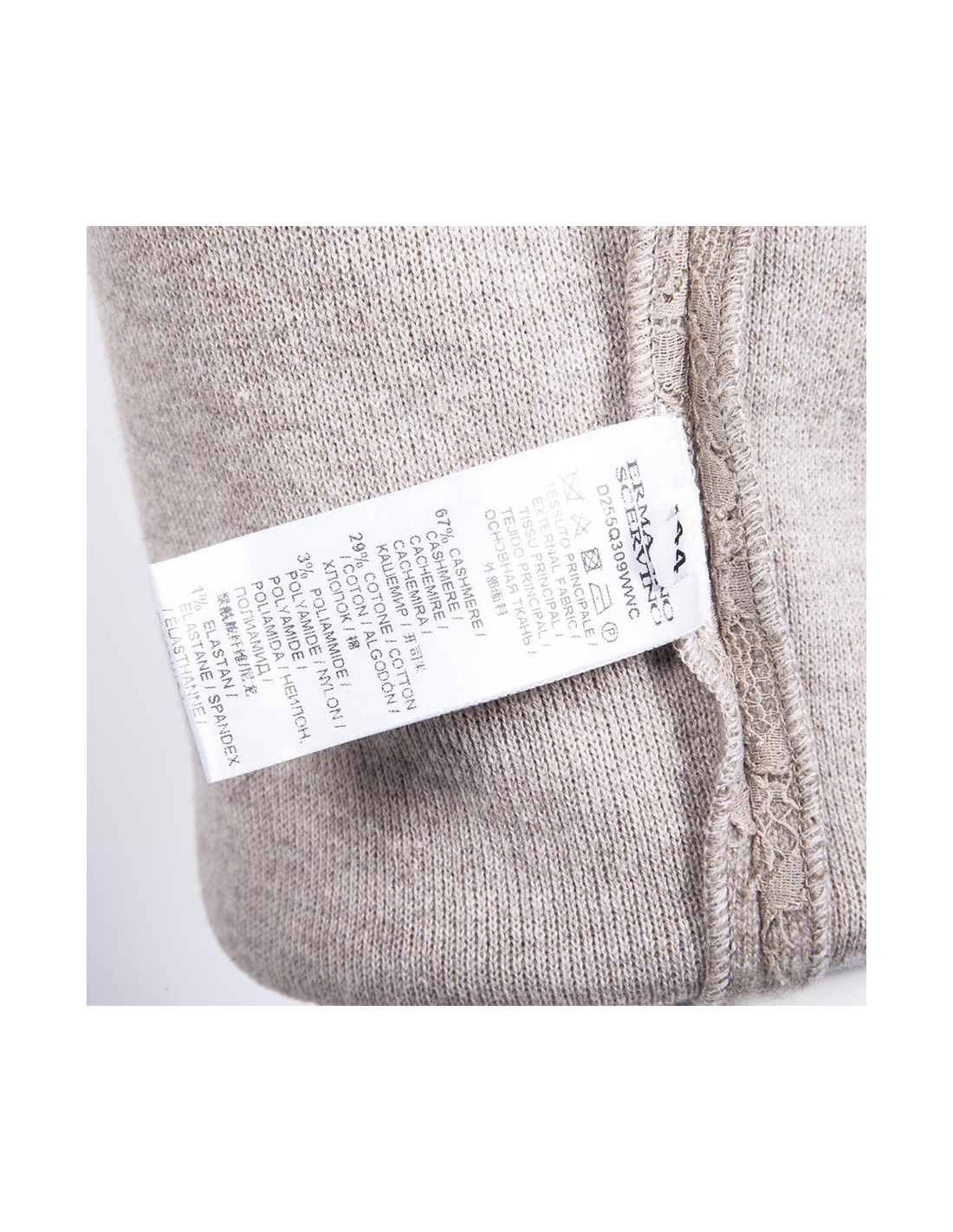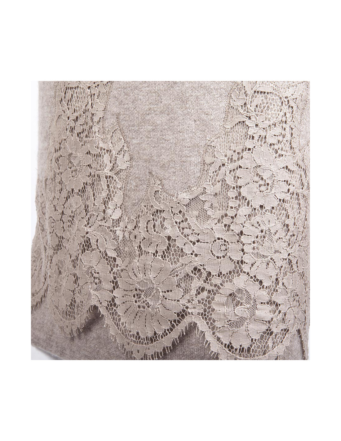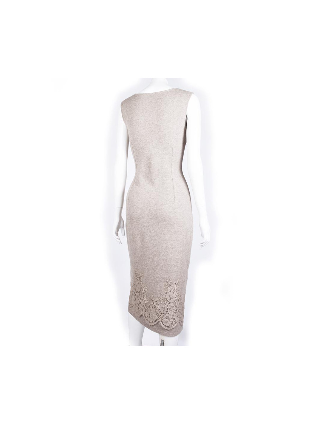 Robe longue fourreau sans manches en cachemire Ermanno Scervino taille 44 Italienne, correspondant à une taille 40 française. La robe est ornée de pièces de dentelle beige sur la partie inférieure. Simple et élégante, elle est zippée sur le côté gauche.