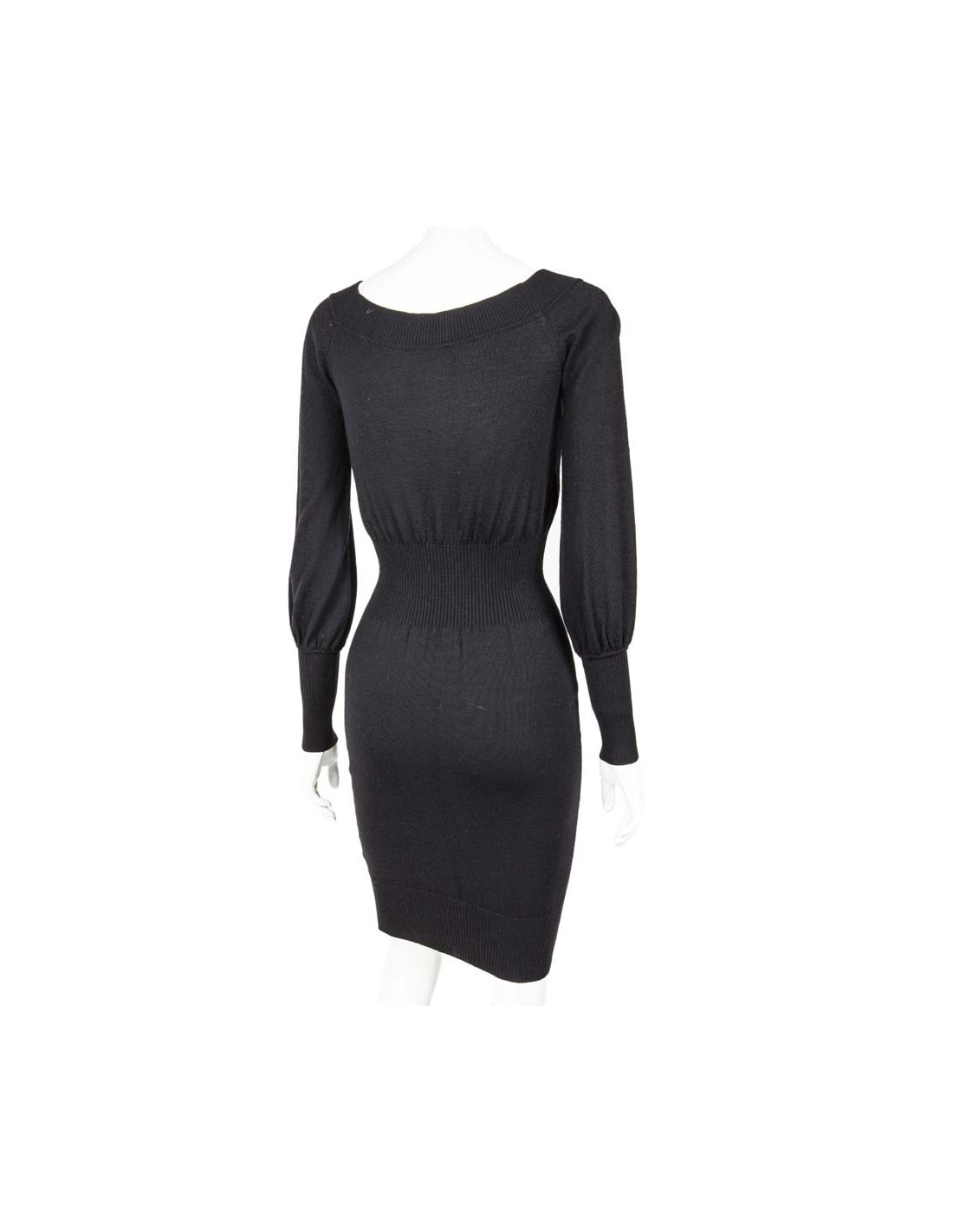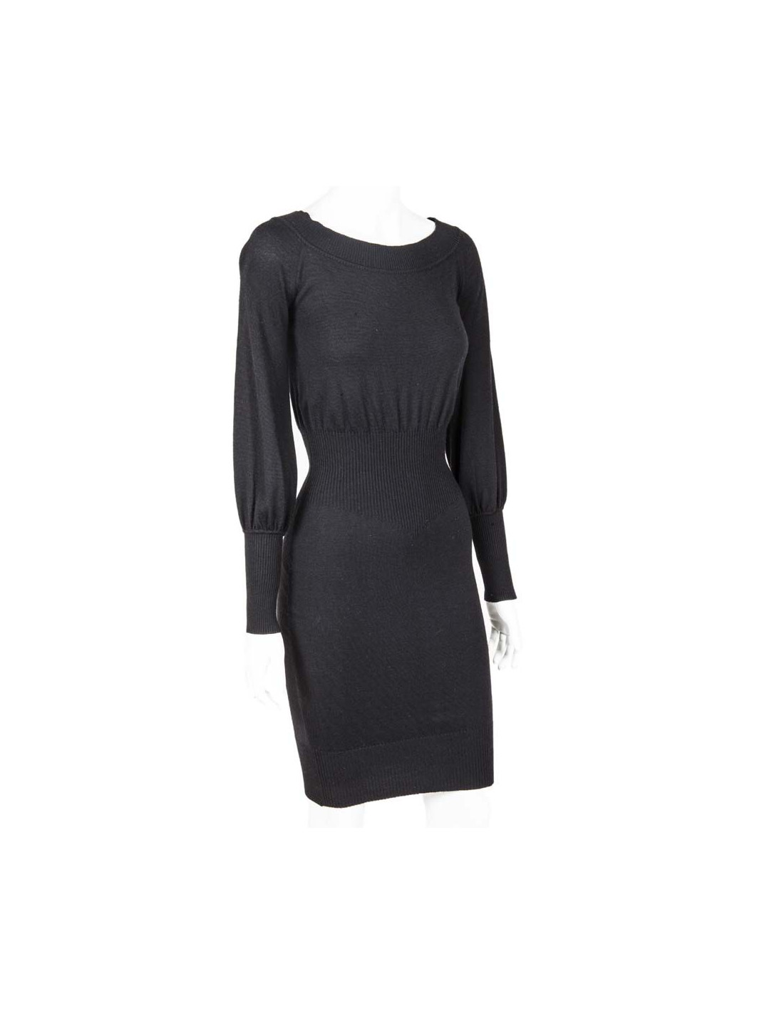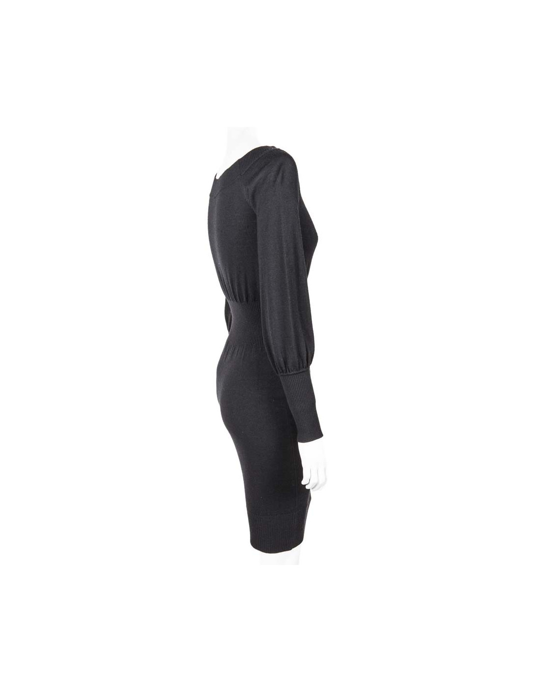 Robe en laine noire Alexander McQueen taille XS. Cintrée, elle est renforcée à la taille, aux poignets et au col, large et arrondi, créant sur le buste et la partie inférieure un élégant drapé et un effet bombé au niveau des manches et de la partie inférieure de la robe.