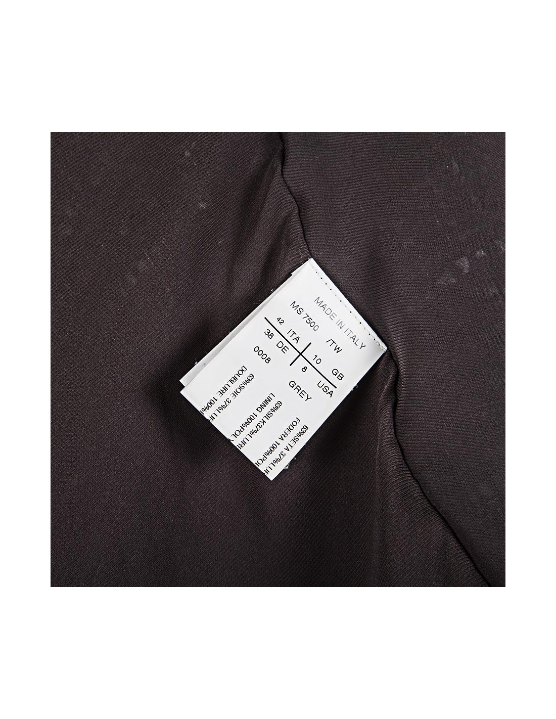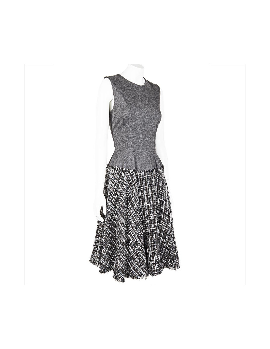 Robe Maurizio Pecoraro sans manches, en soie et lurex (voir étiquette) grise, taille 38 fr. La robe est cintrée, la partie inférieure est en Tweed gris, très fluide et de grande ampleur. La partie supérieure est discrètement zippée au dos, la robe est doublée de polyester, fluide et agréable.