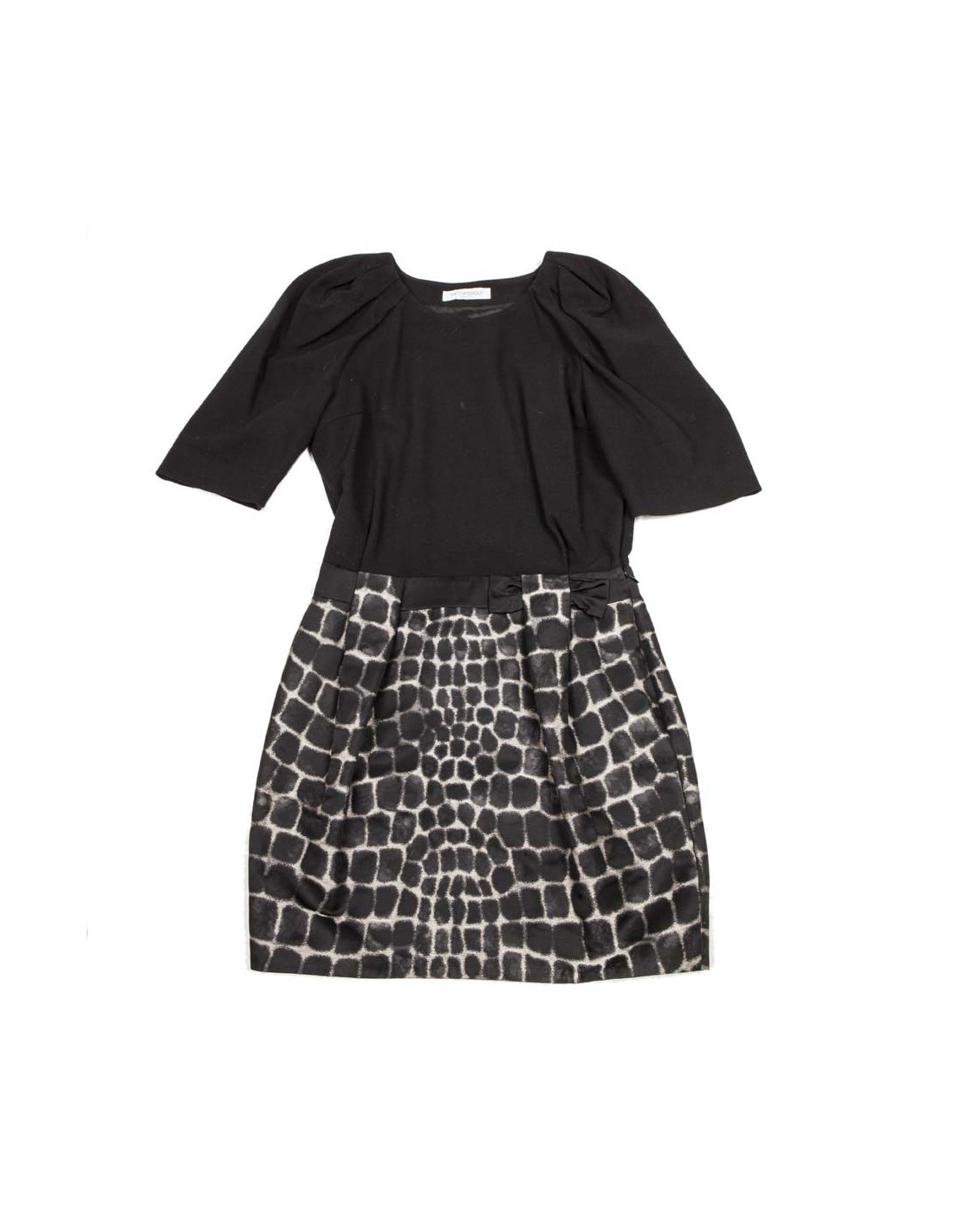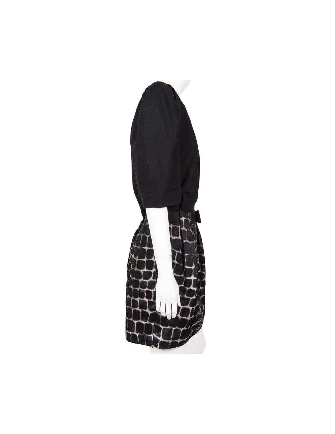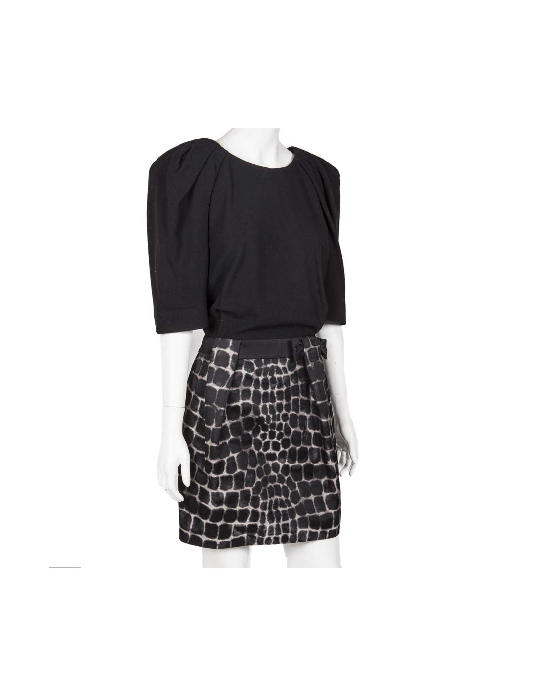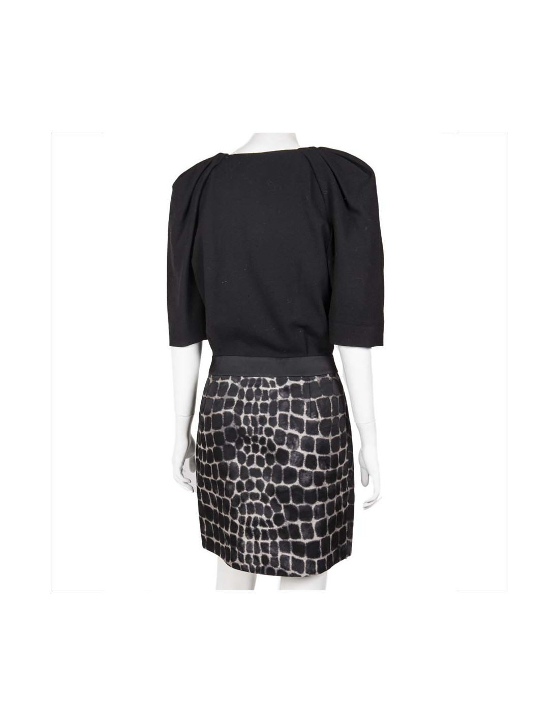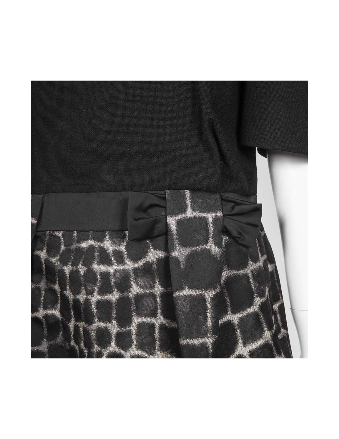 Le haut est noir et le bas est imprimé beige et noir. Elle se ferme sur les côtés par des boutons pression et une fermeture éclair.