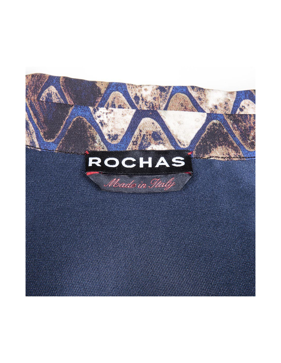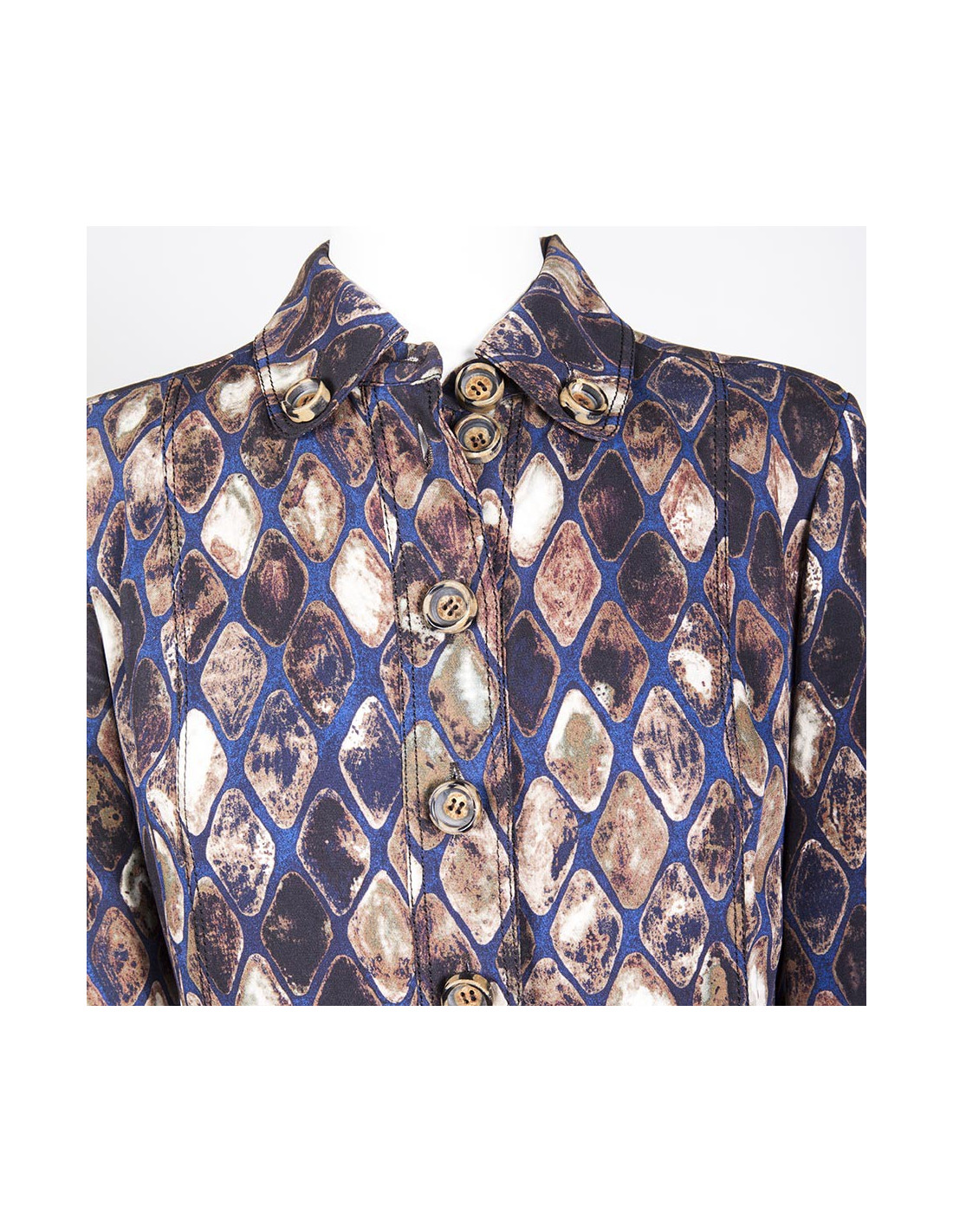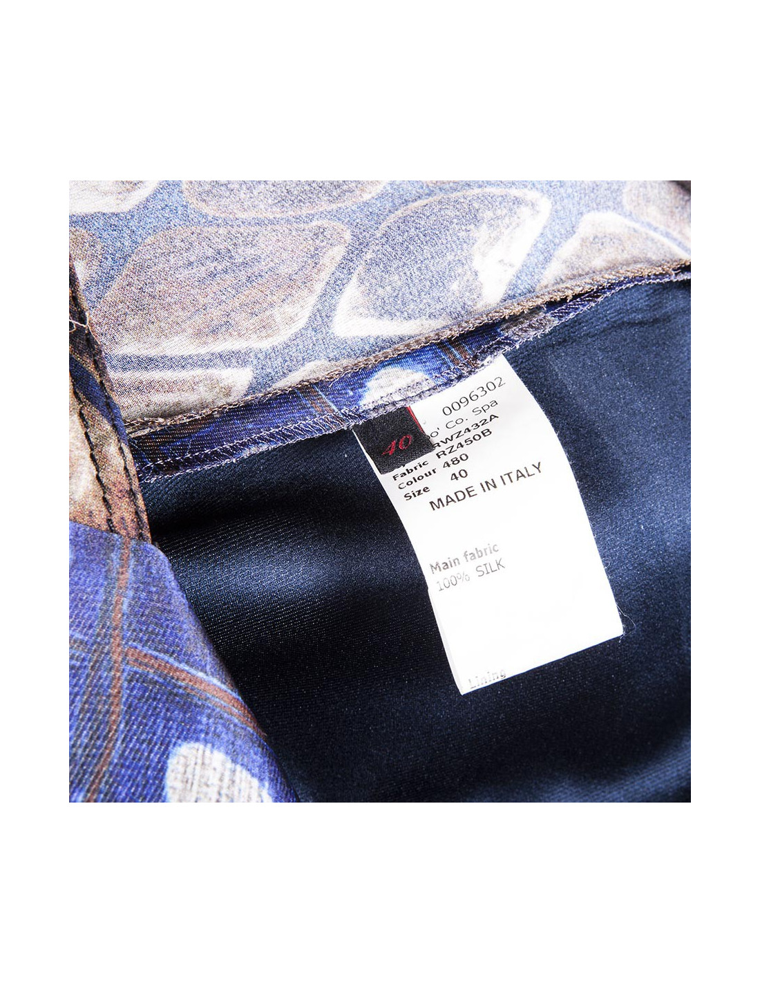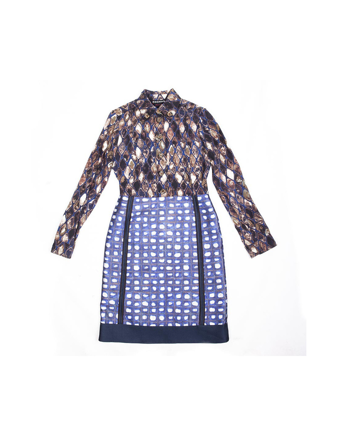 Le haut de la robe est dans un tissu en soie différent, donnant l'illusion d'une blouse. Boutons en corne. Couleurs : bleu, marron, beige, gris.