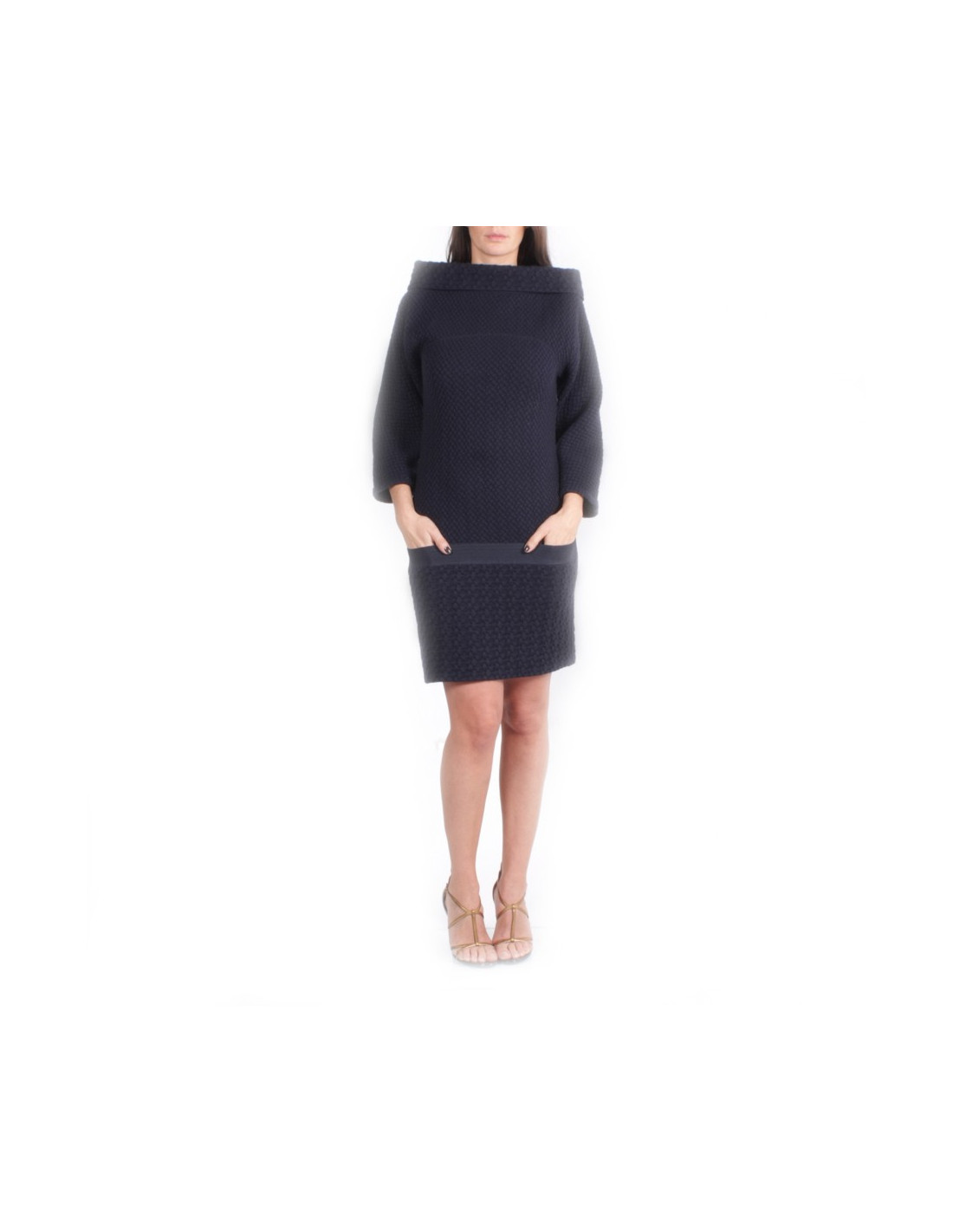 Robe Chanel bleu marine en laine stretch, col bateau à manche 3/4, en très bon état.