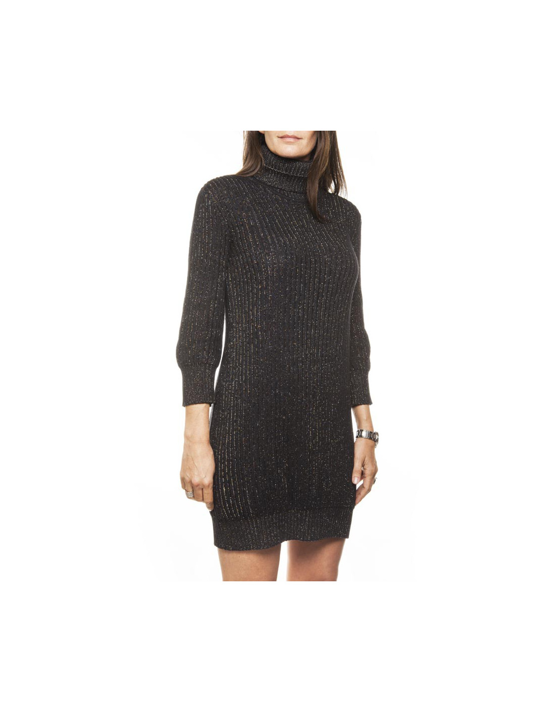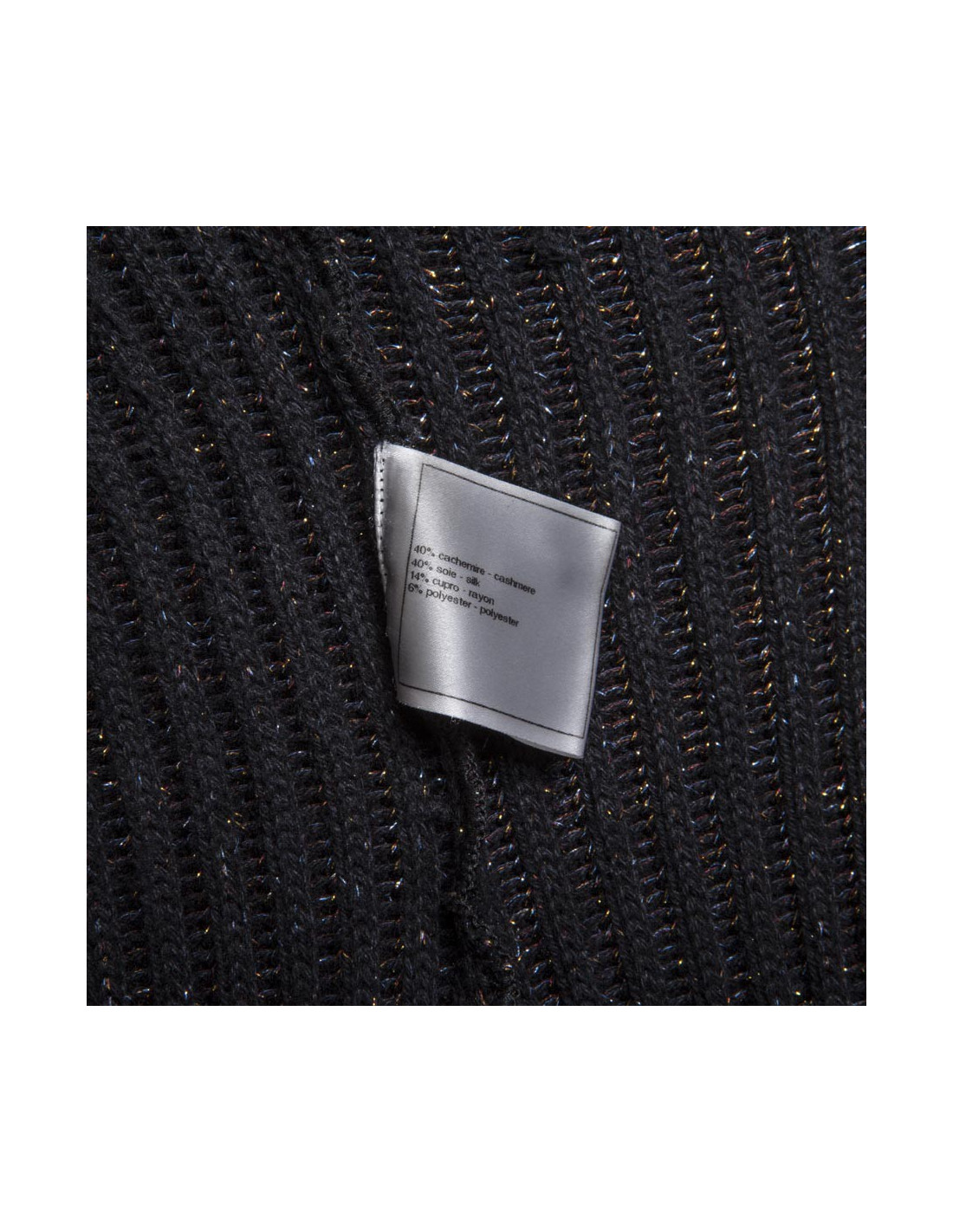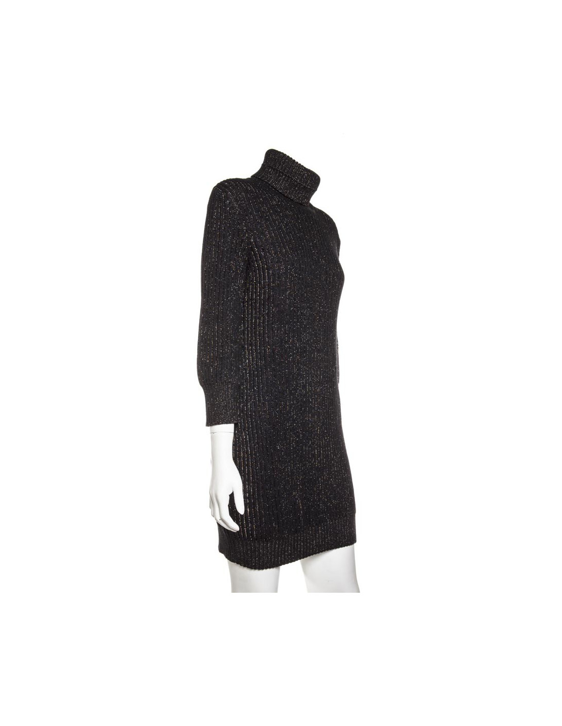 Collection récente. Robe en maille côtelée marron col roulé Chanel, cachemire et soie noir et fils de lurex multicolores, en très bon état. un mini écusson en métal or cuivré vieilli gravé "CC", cousu en bas de la robe a gauche.
