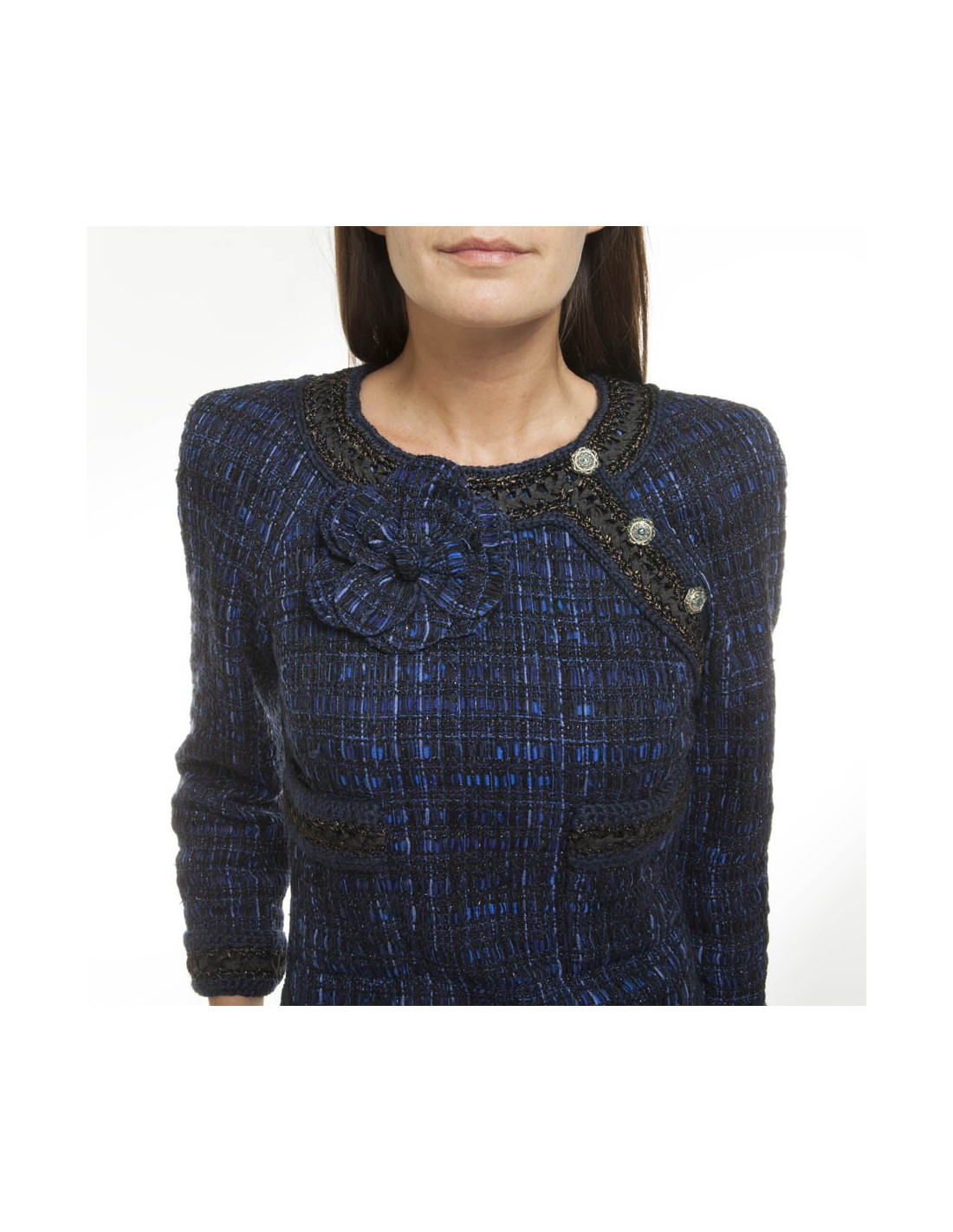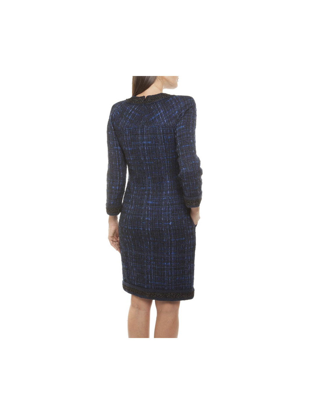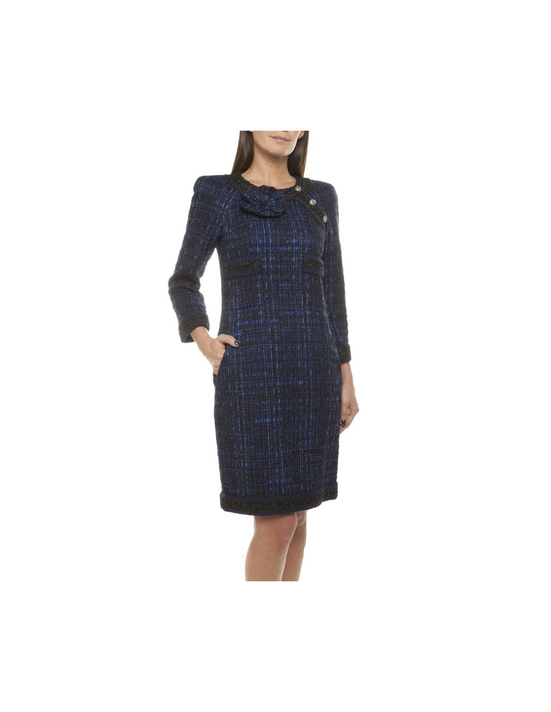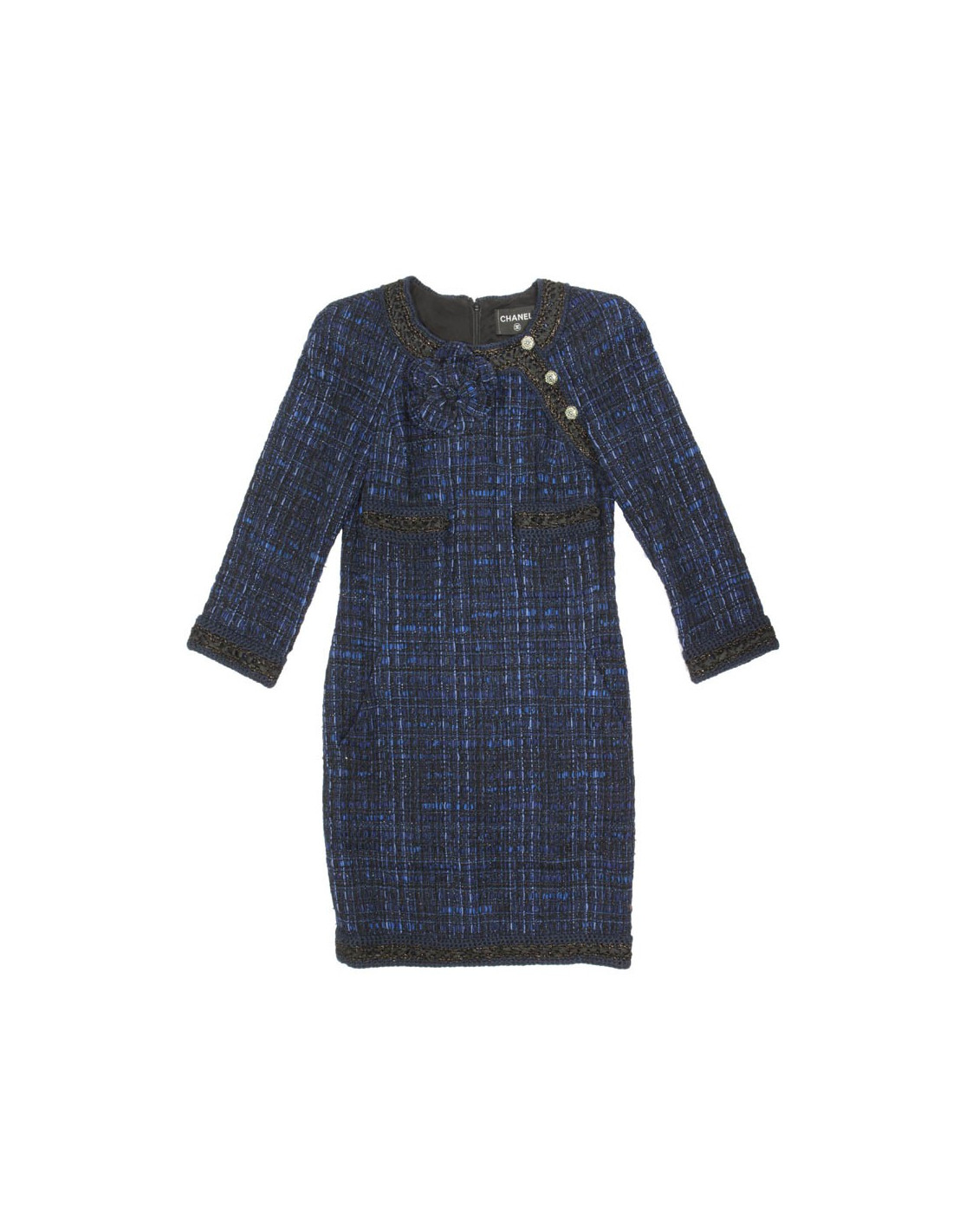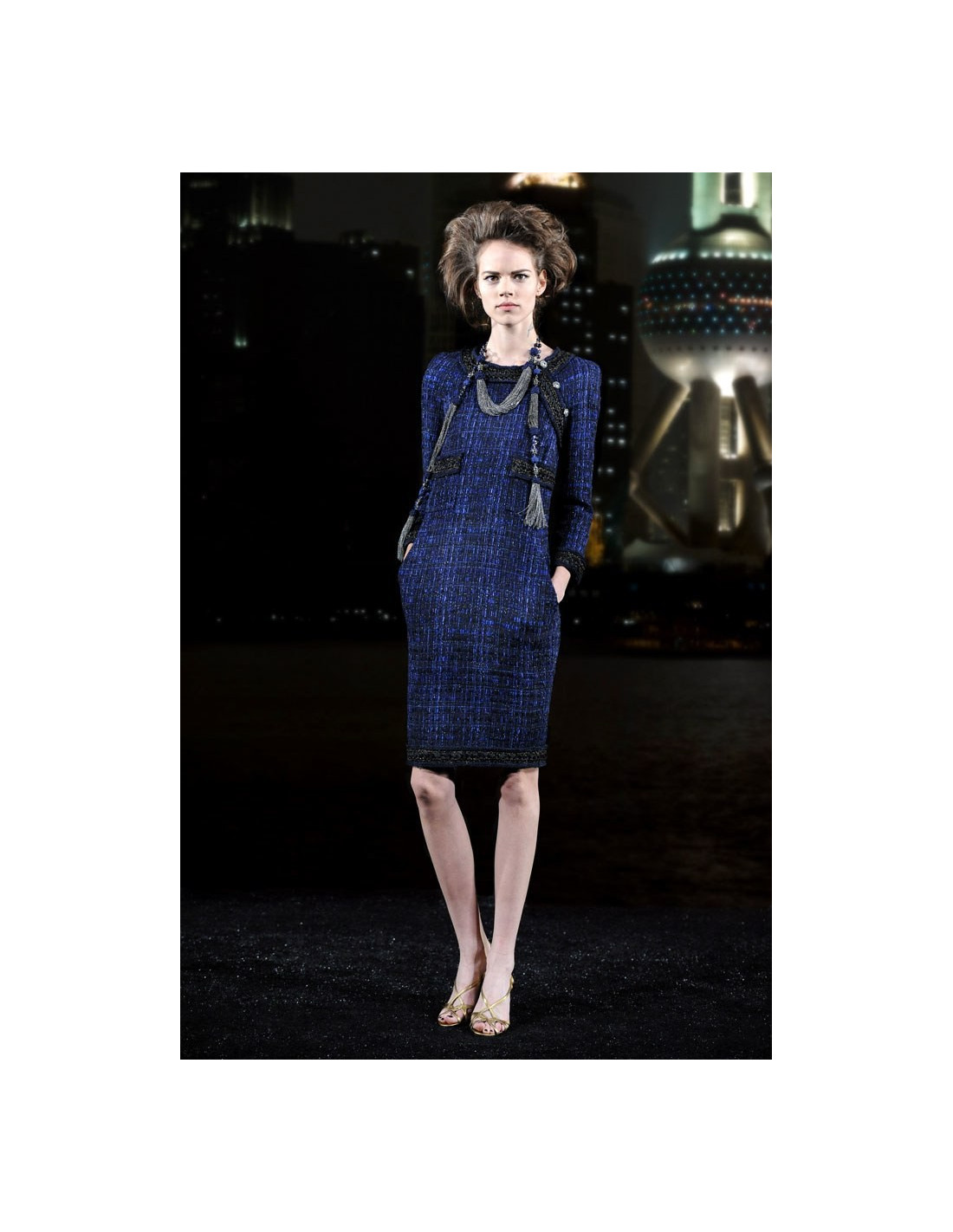 Robe CHANEL T38 "Paris-Shanghaï"en tweed bleu avec sa broche