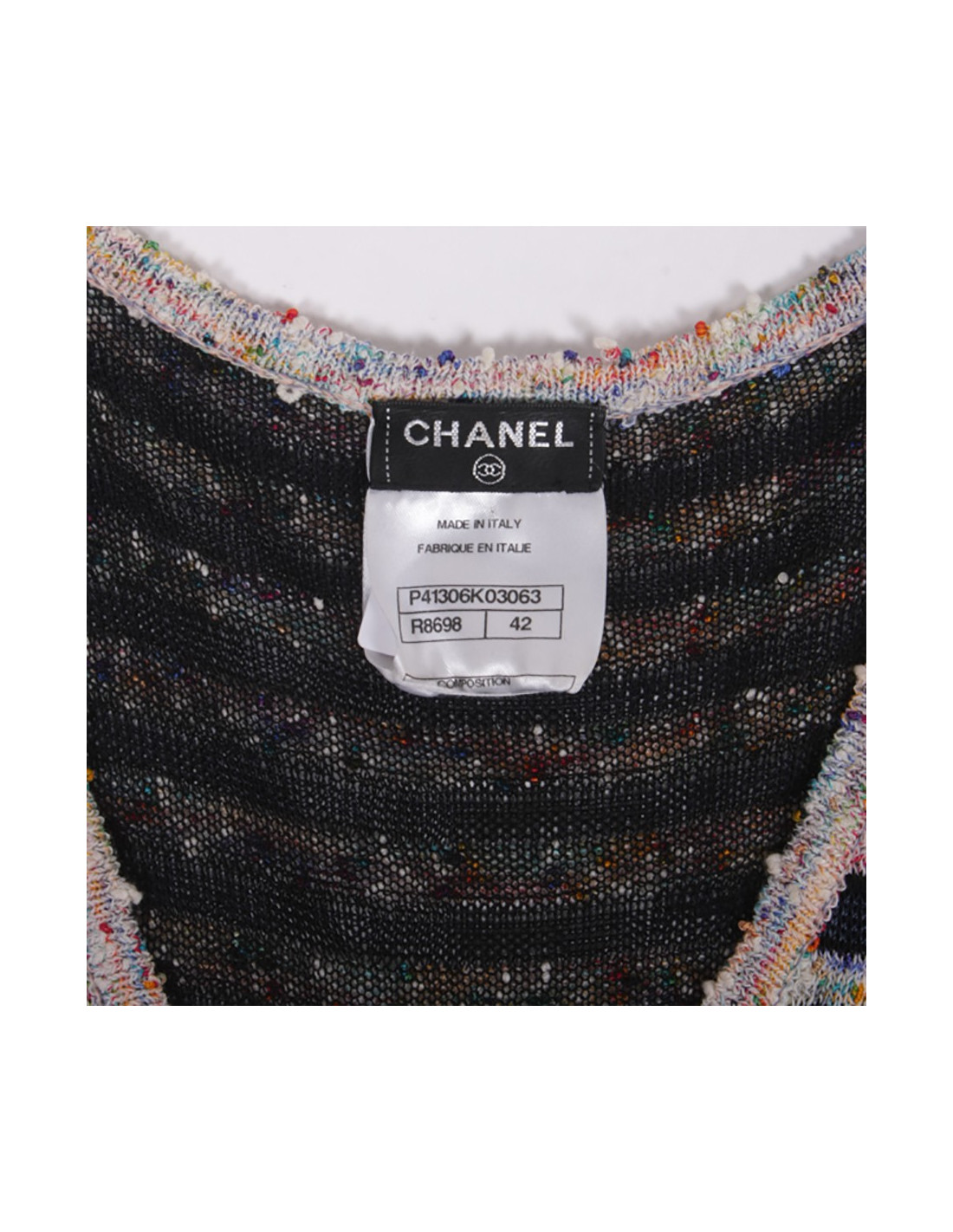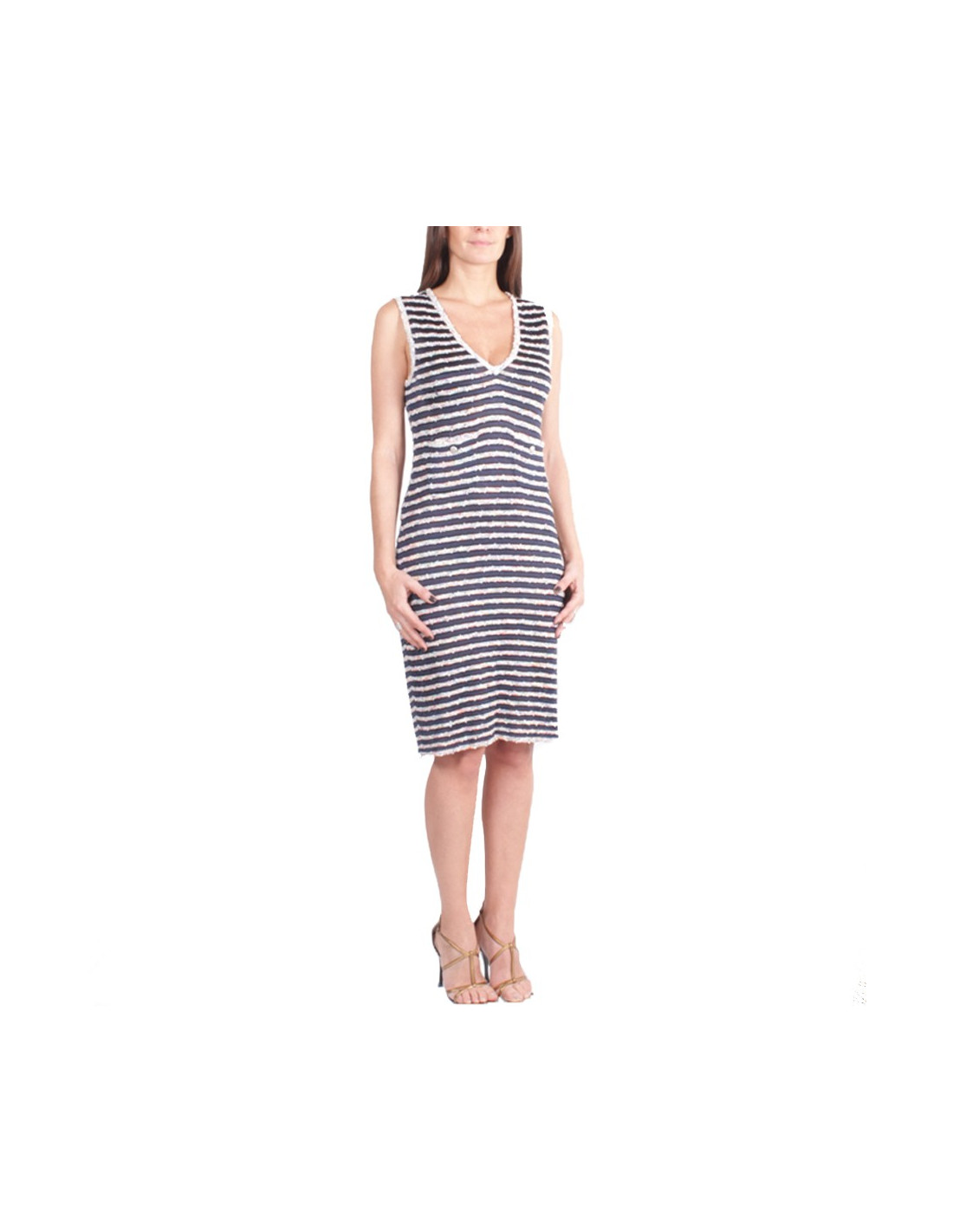 Robe d'été CHANEL col V sans manches en maille à rayures bleu nuit et multicolores