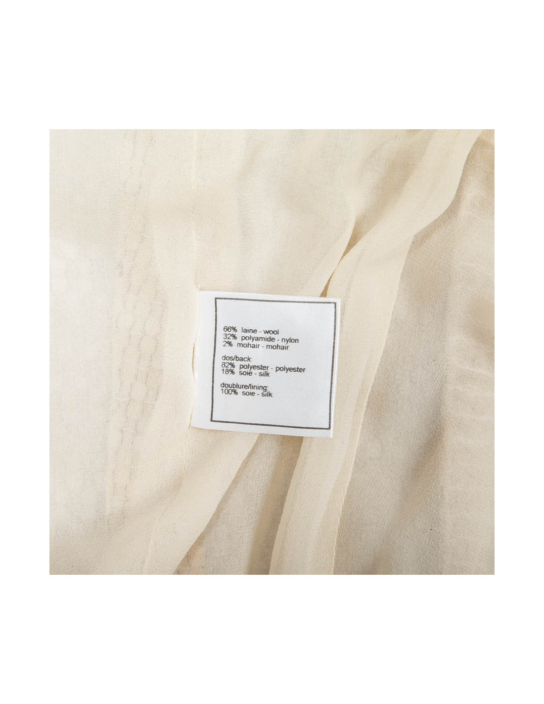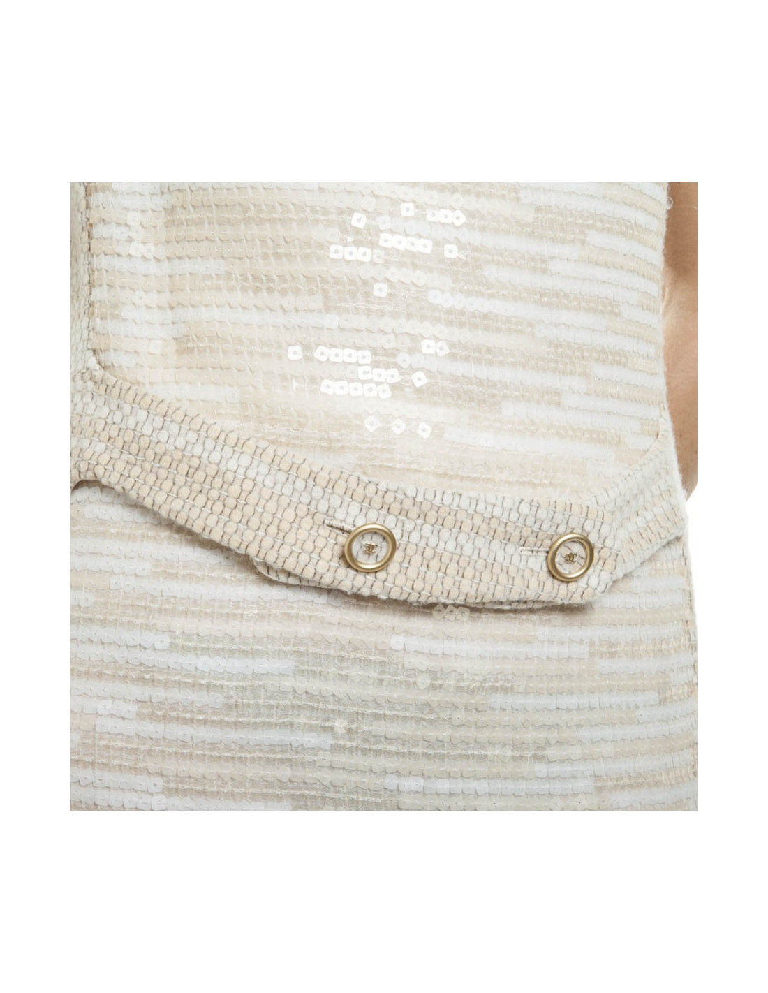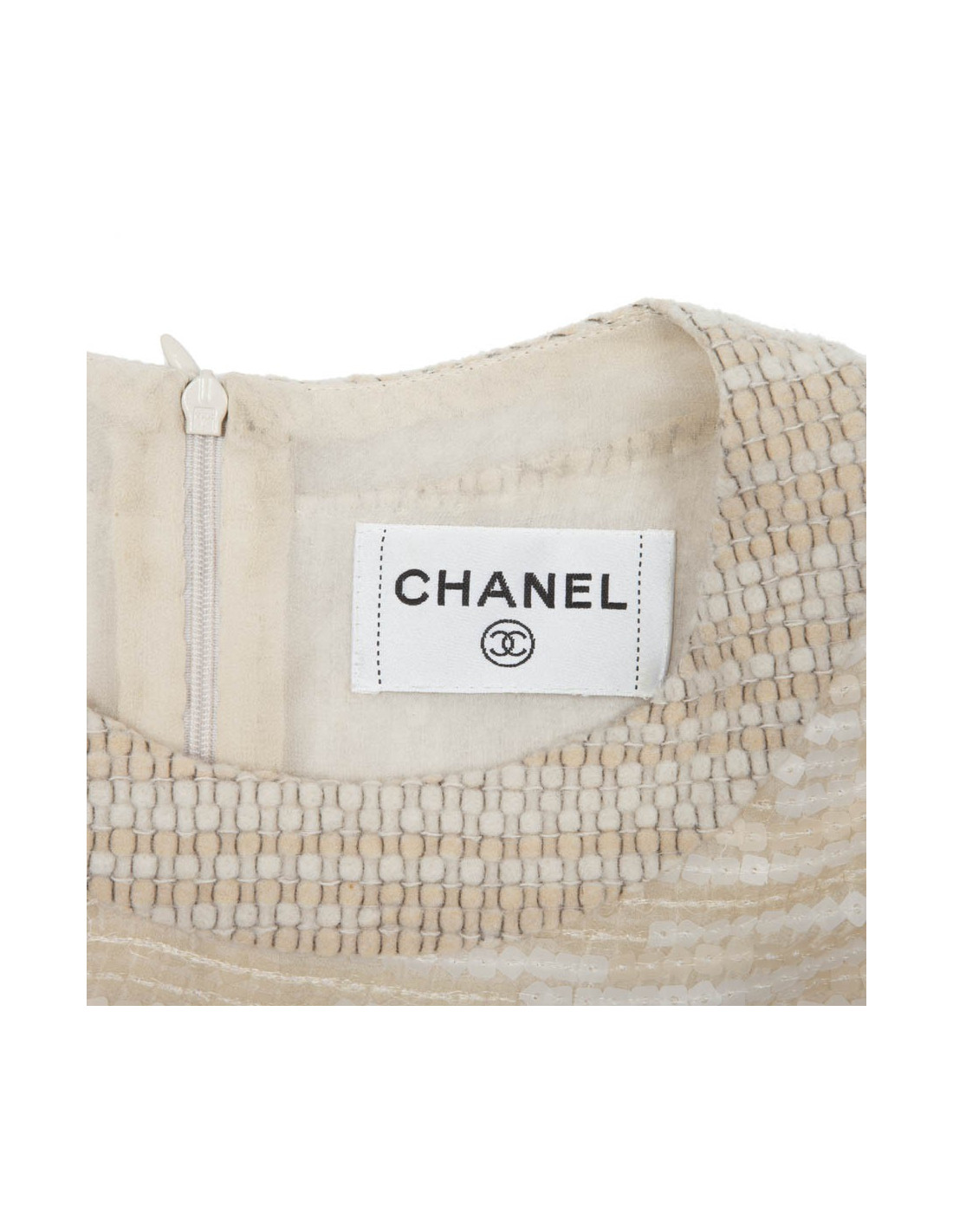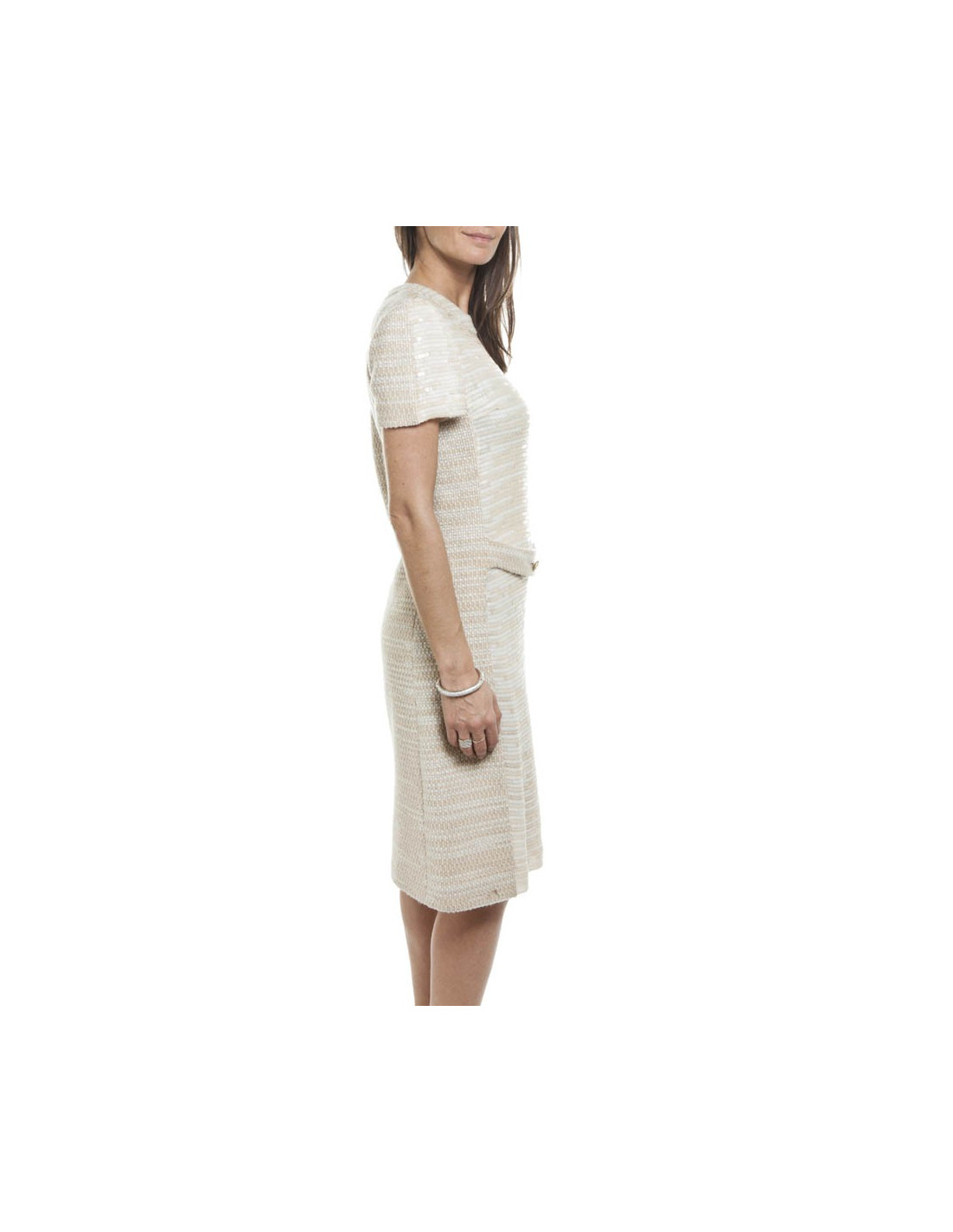 Robe en tweed laine et mohair dans les tons beige, agrémentée sur la partie avant de sequins du même ton. Fermeture zippée dans le dos.