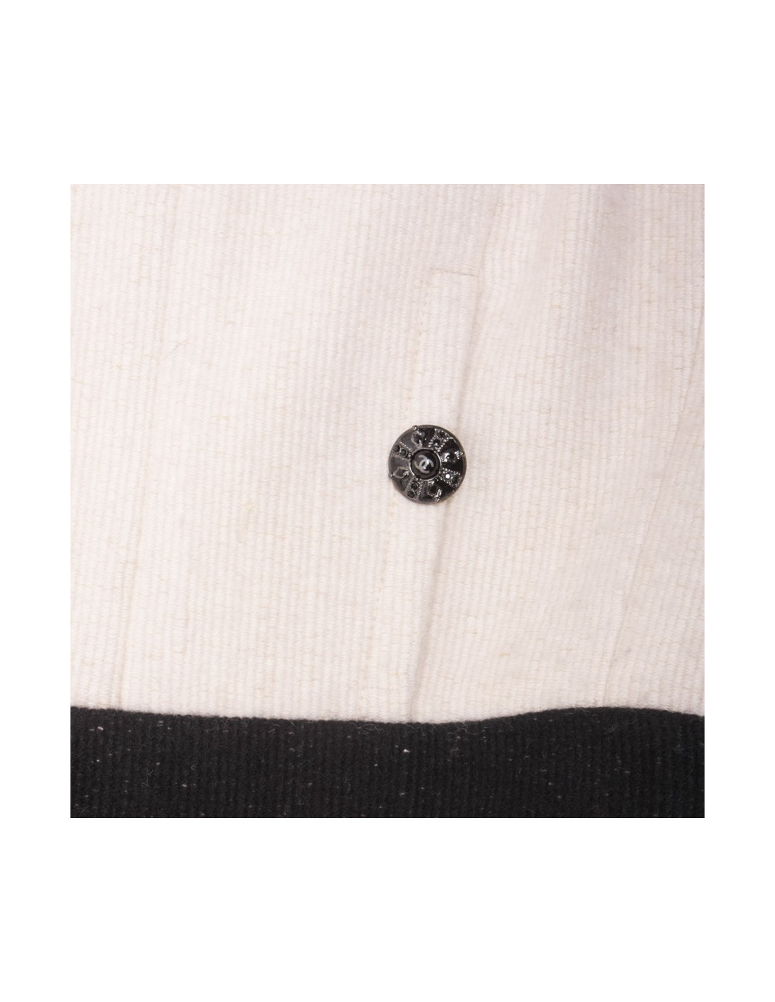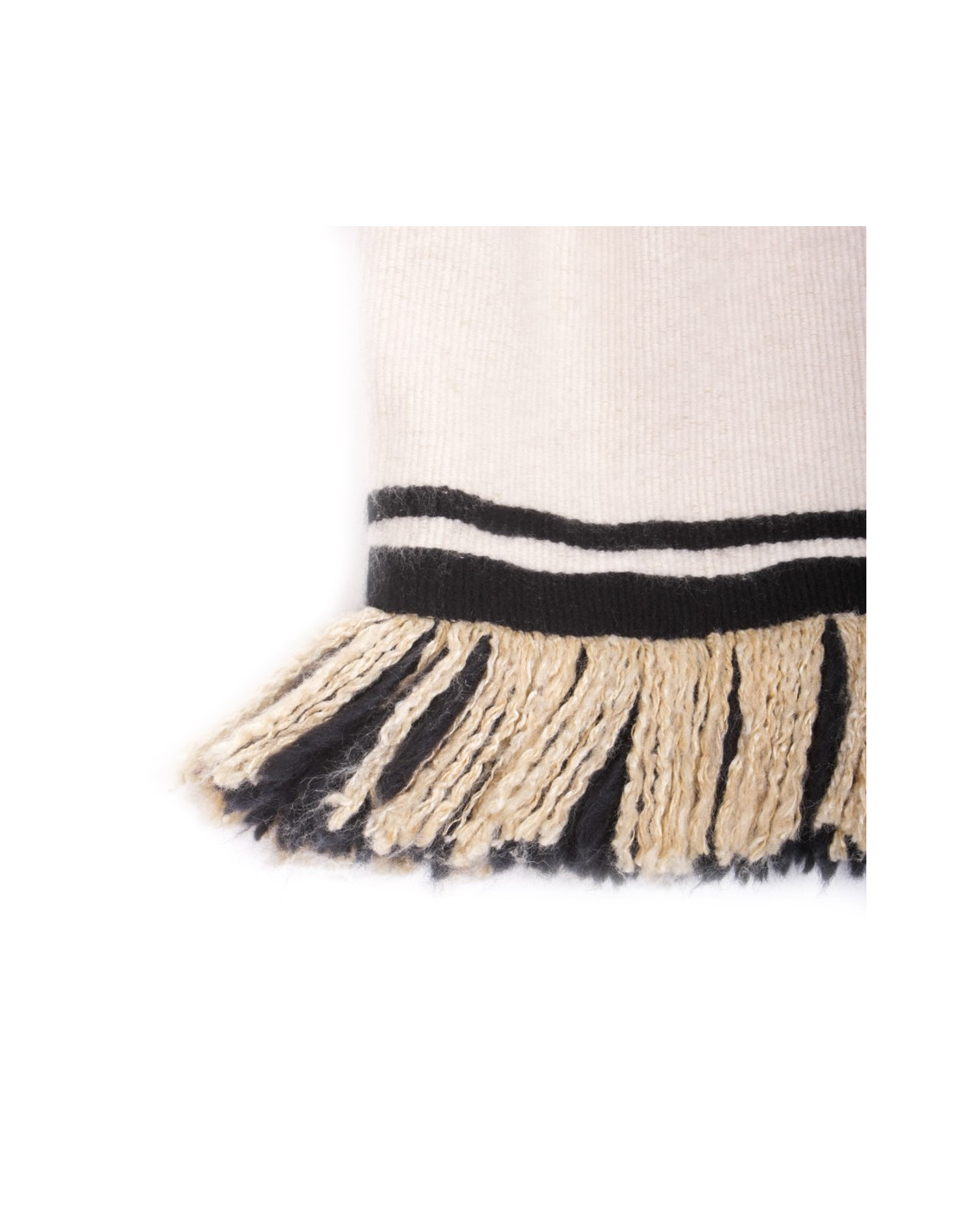 Elle est gansée et ceinturée de noir et se termine par le bas par 2 rangées de franges beige et noir.