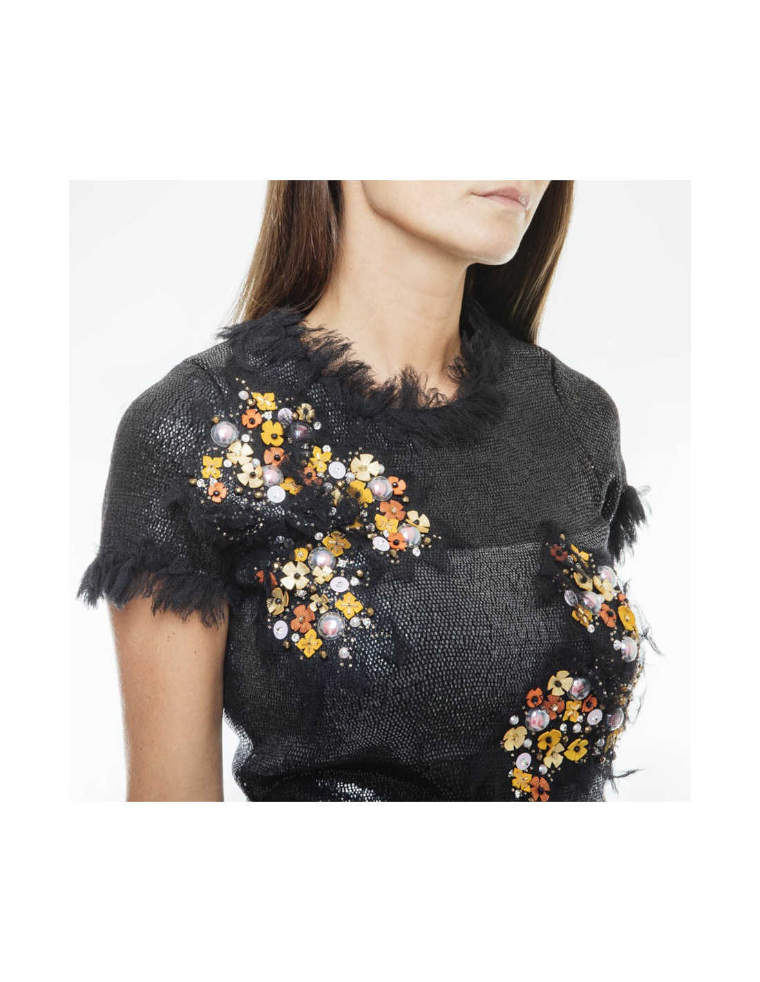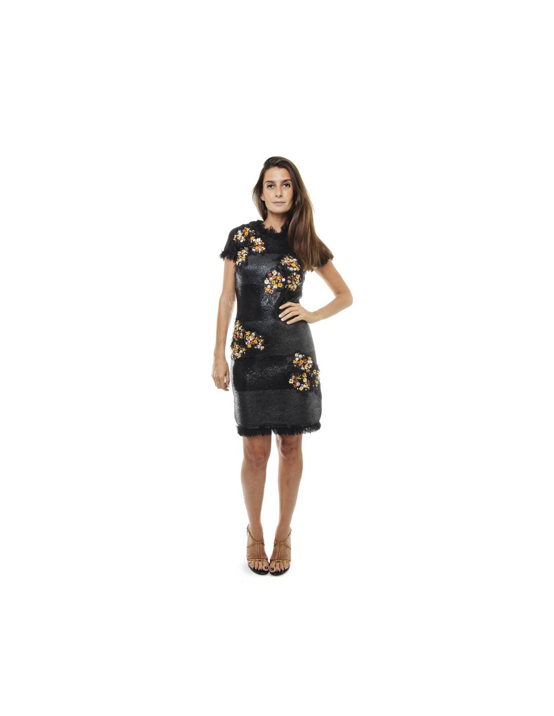 La robe est lamée noire et brodée de fleurs orange et or sur le devant, les manches sont courtes et il y a des petites franges en tulle autour du col, des manches ainsi que dans le bas .