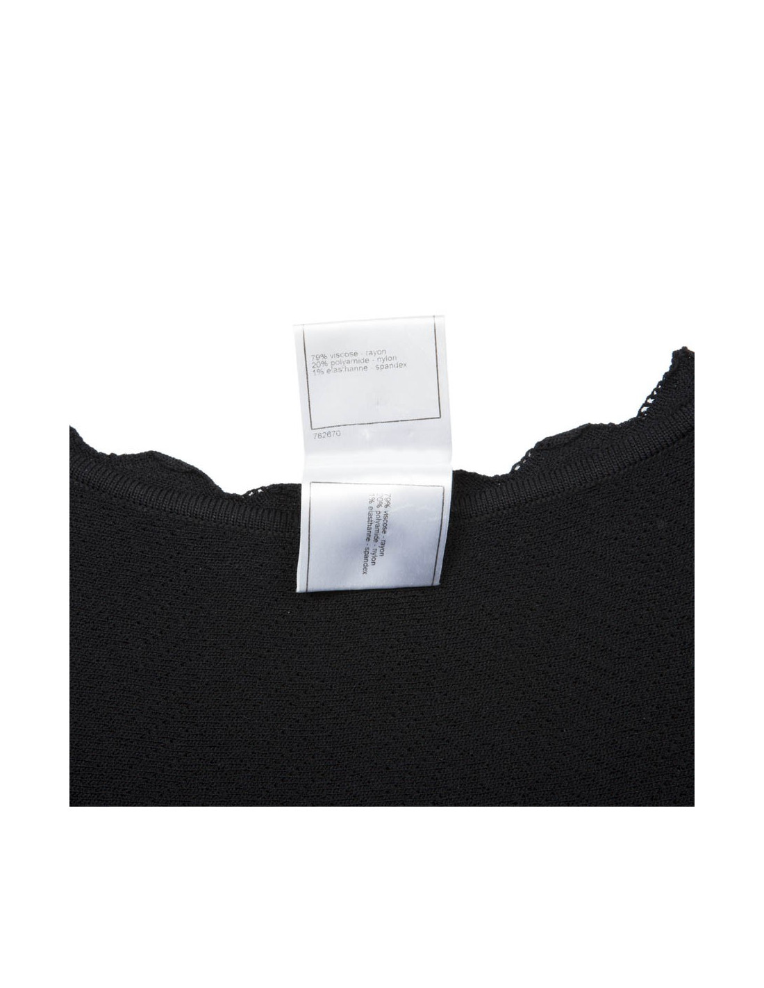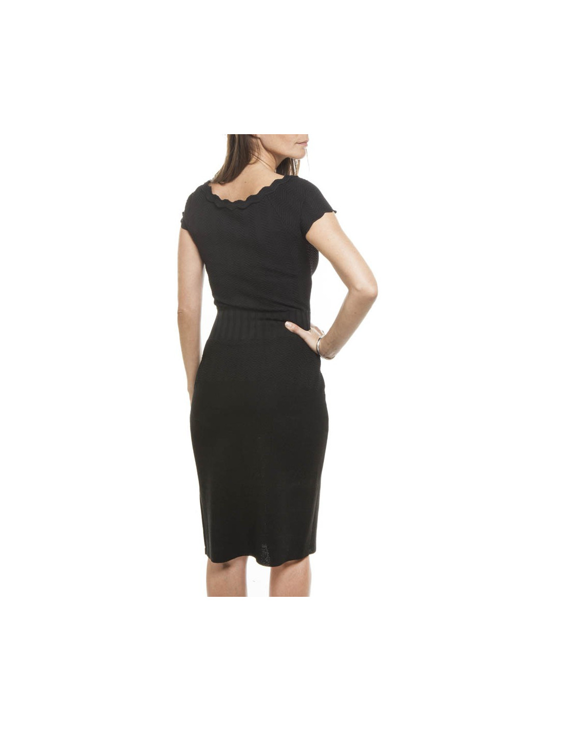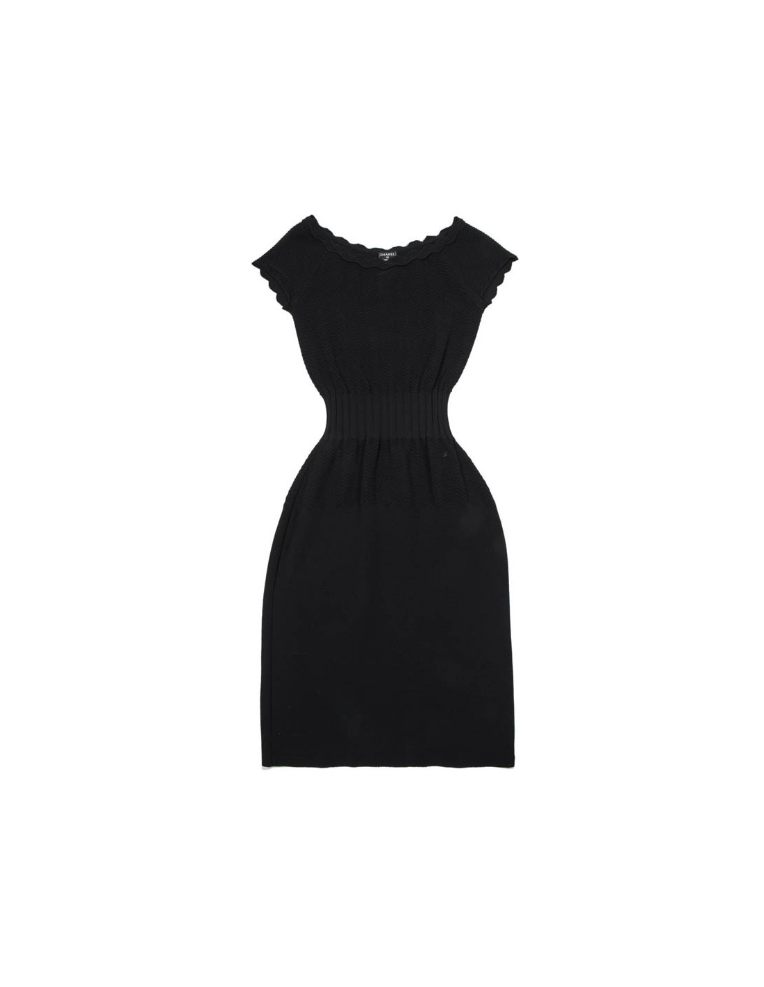 Robe de la Maison Chanel en viscose noire. Taille 36. Resserrée à la taille. Matière élastique, cintrée. Sigle "CC" en strass noire. Col dentelé. En très bon état.
