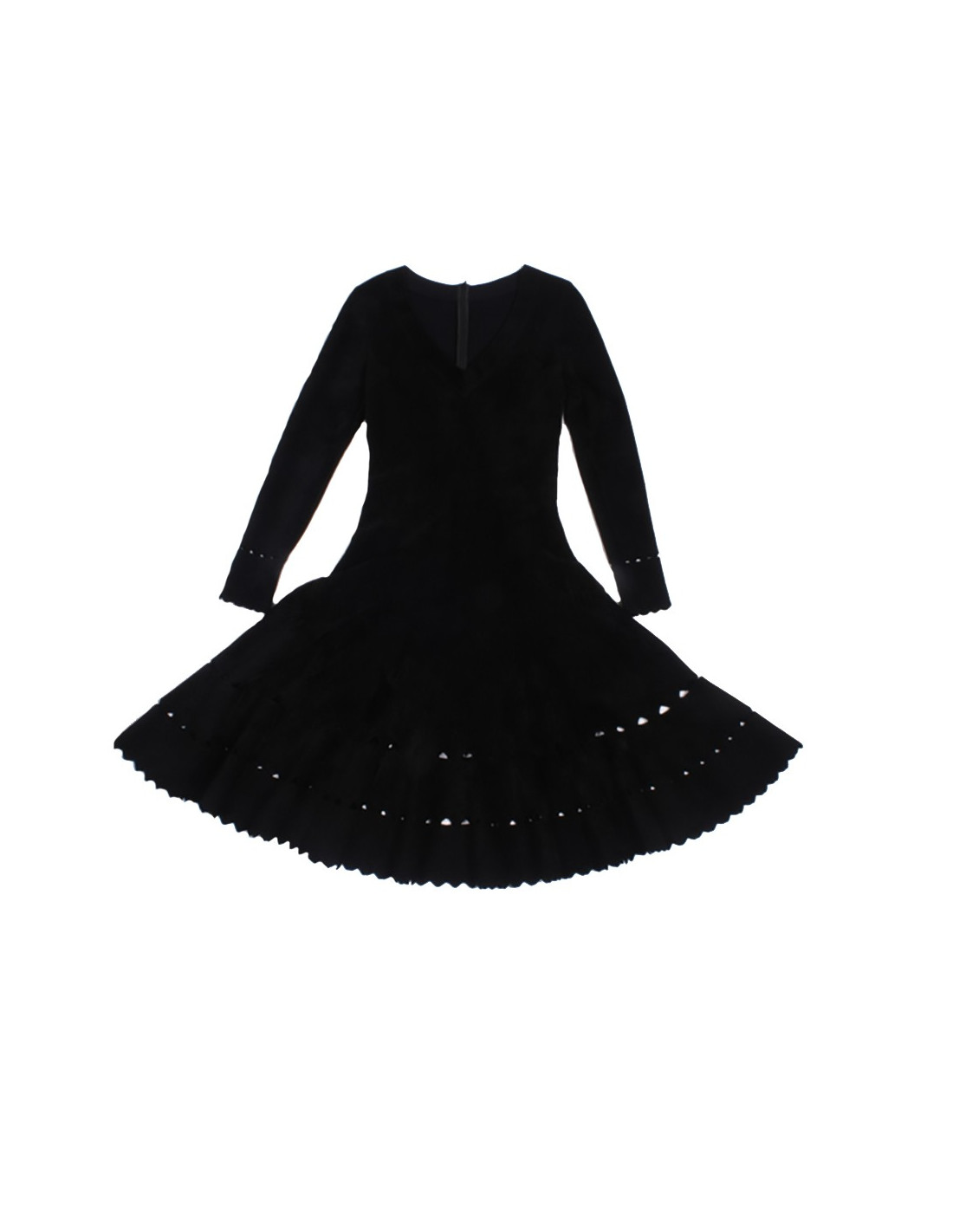 Robe ALAIA en velours stretch noir col V, ajourée sur les poignets et sur le bas de la robe.
